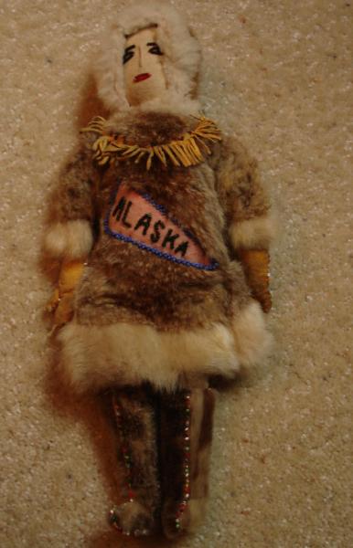 This doll was sent from Alaska in the 1920's. I has a cloth body with seal skin fur clothing. There is beadwork on the boots, the gloves and on the front. The eyes and mouth are also beadwork.