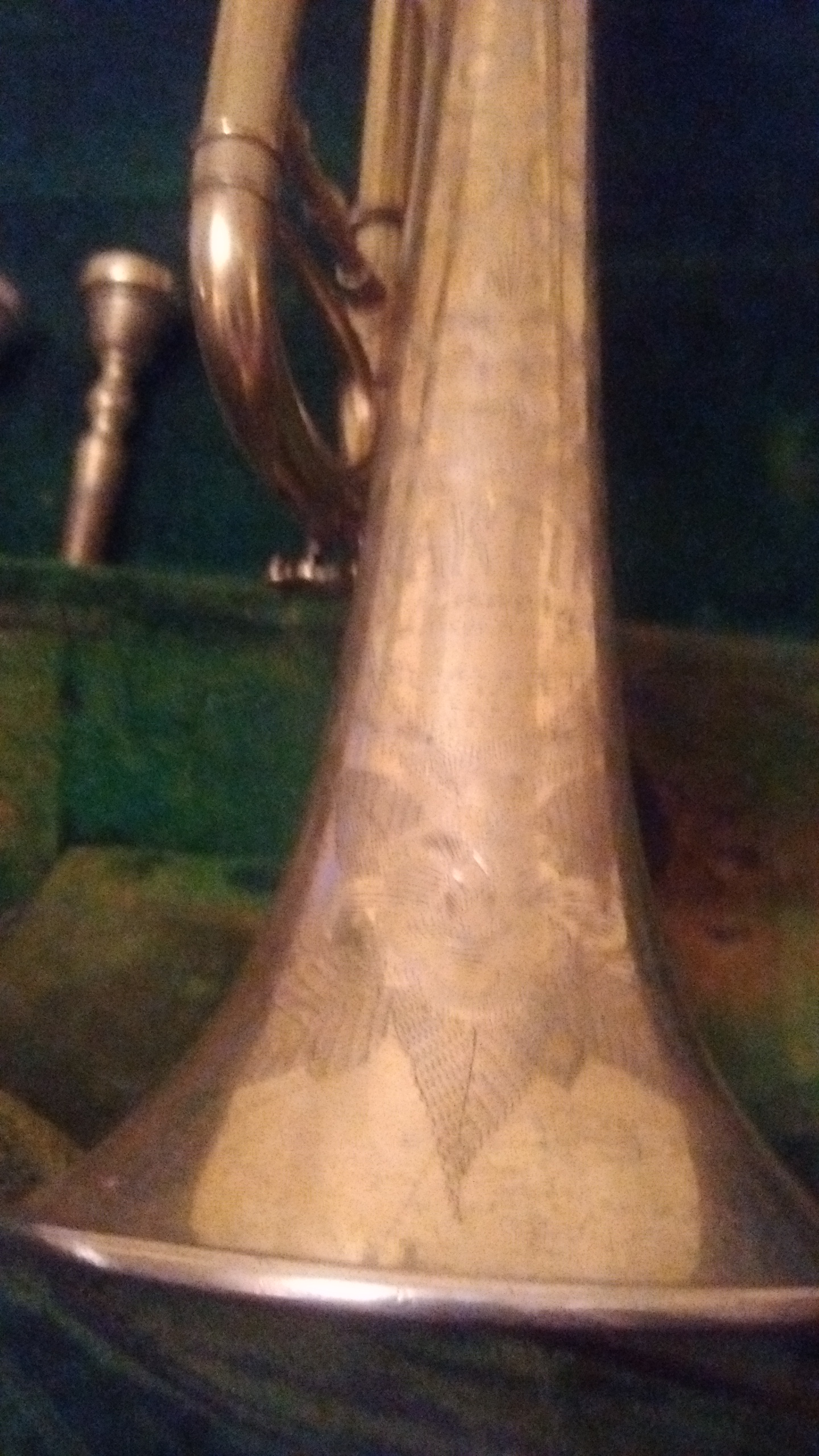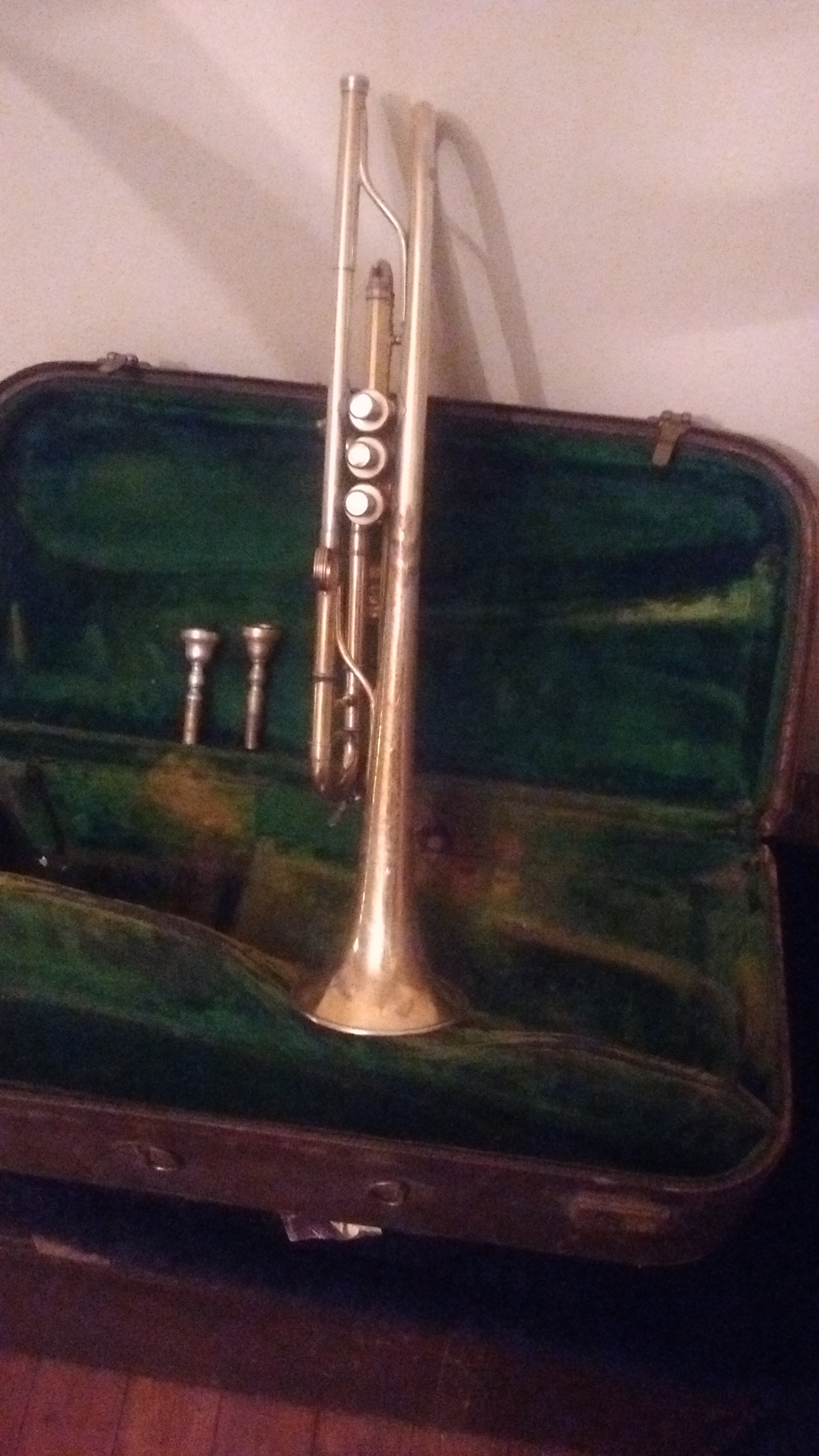 Gold plated ilooks to b in good condition but I don't know how to play it has a little wear on the horn and two mouth pieces case is a Lil musty serial num 64816