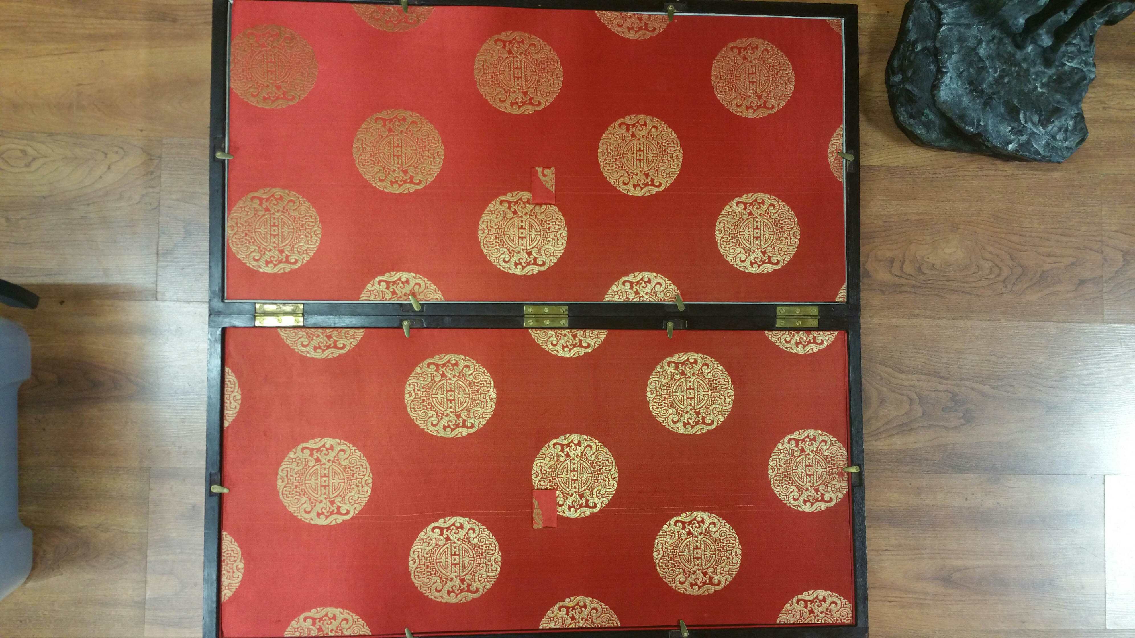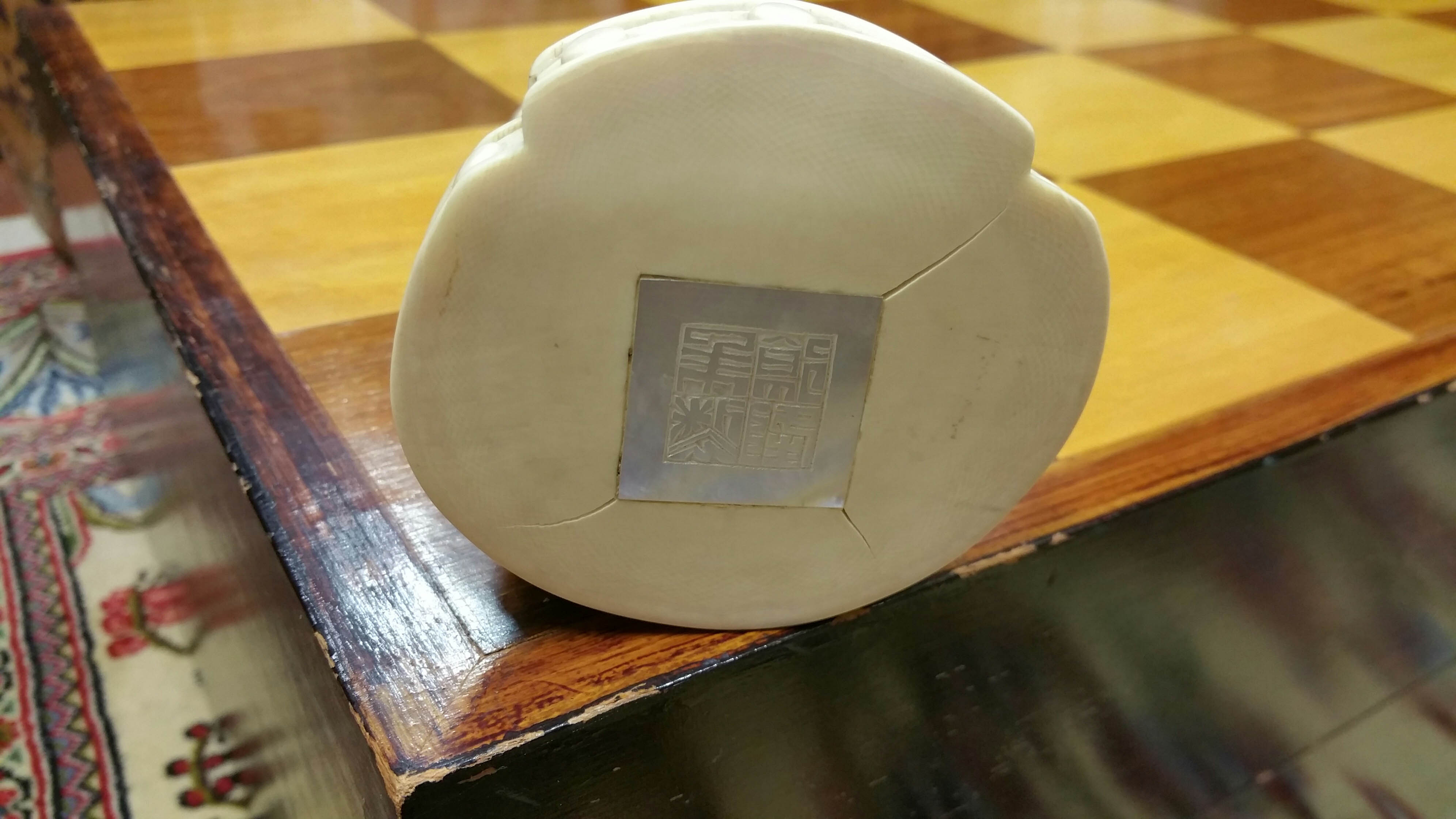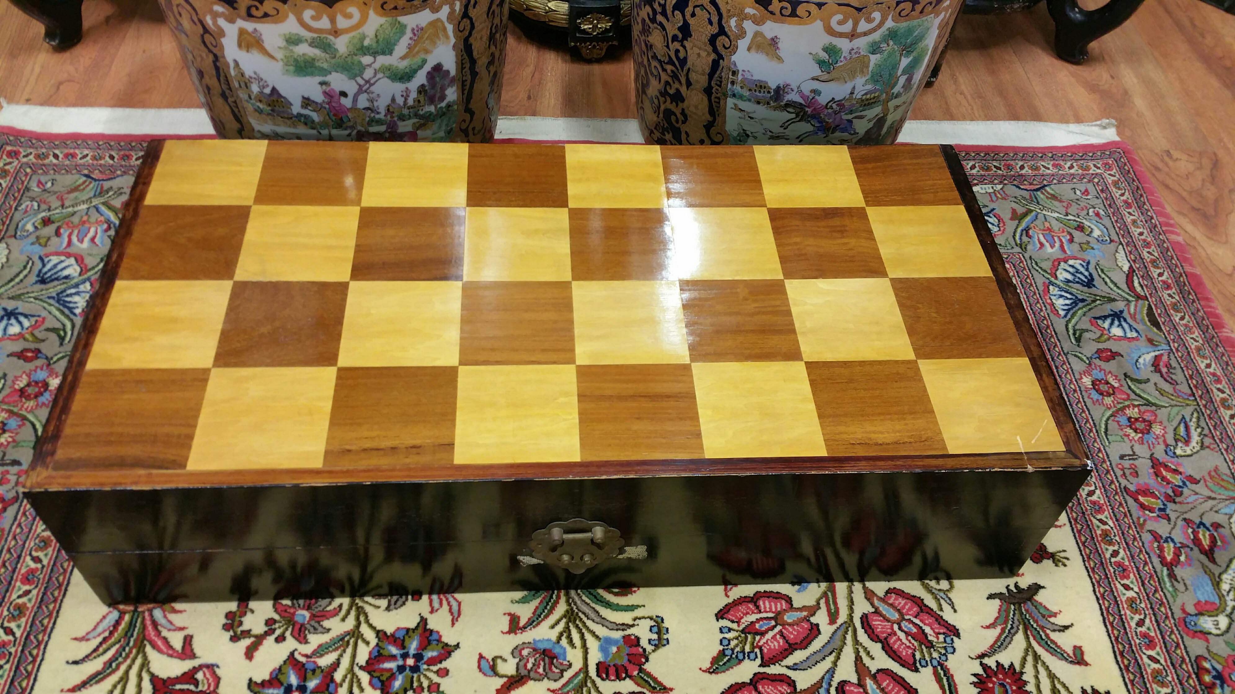 Detailed hand carvings, distinctive tea stained finish of dark chess pieces, manufacturer identification marks on bottom of game pieces.