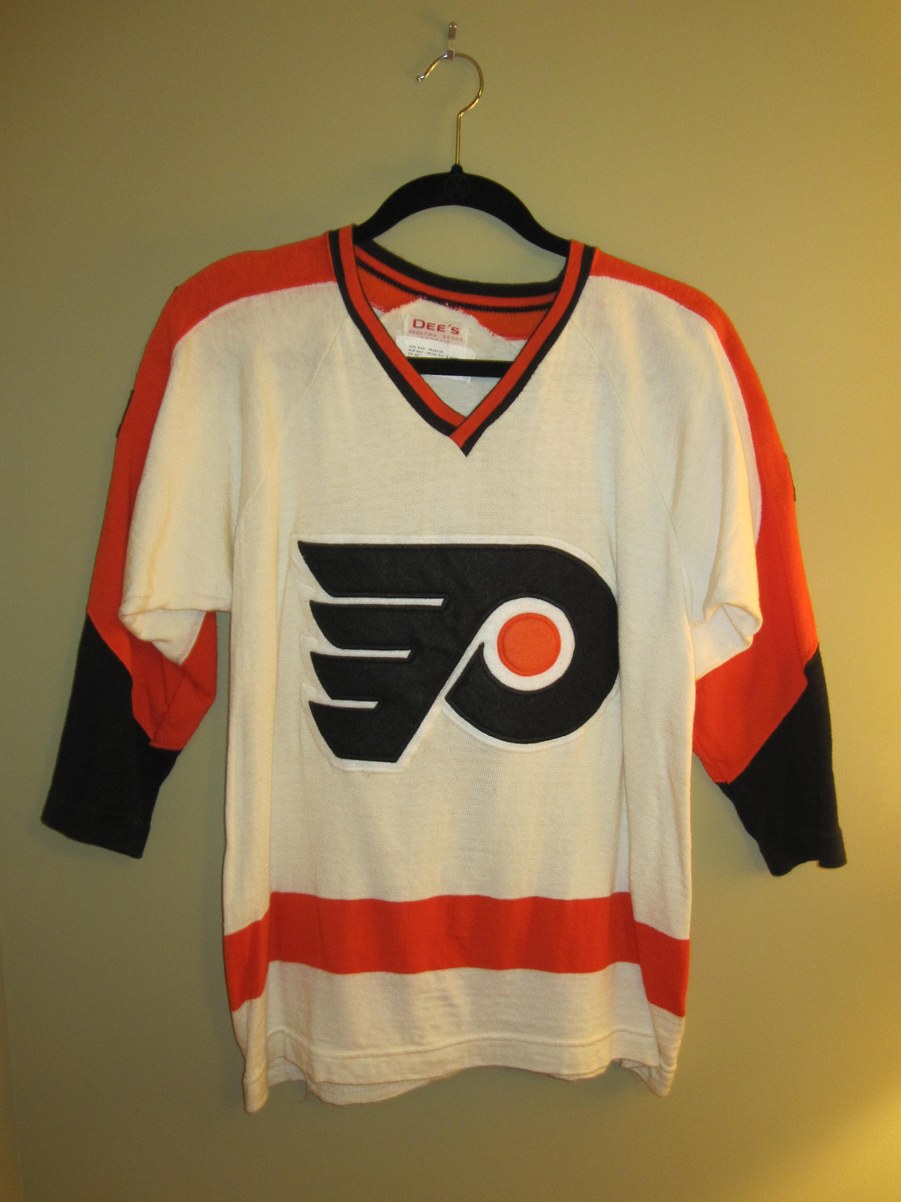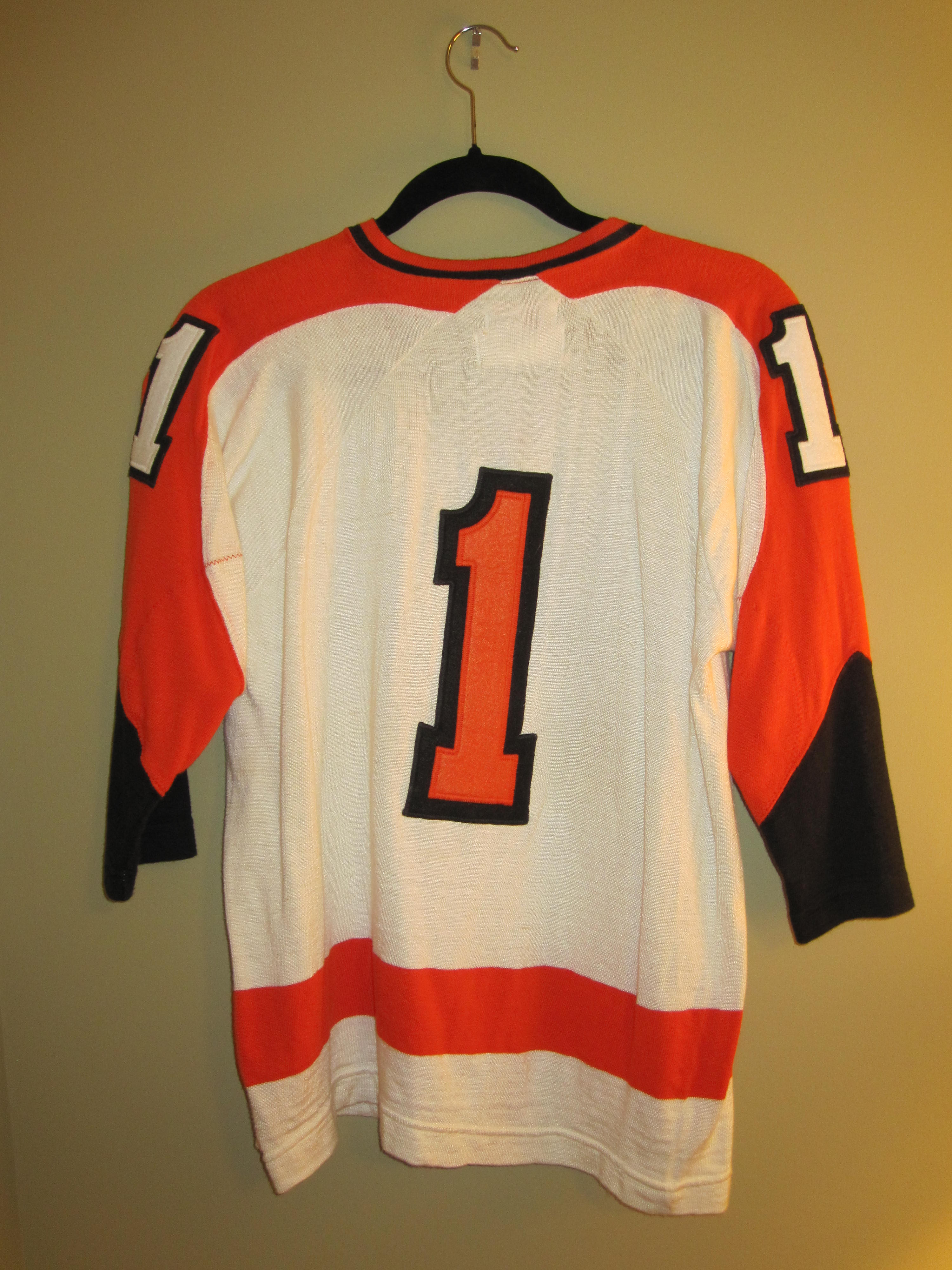 Knitted Philadelphia Flyers Bernie Parent jersey with the number 1 on the back and no name (this was the style of the jersey at the time).