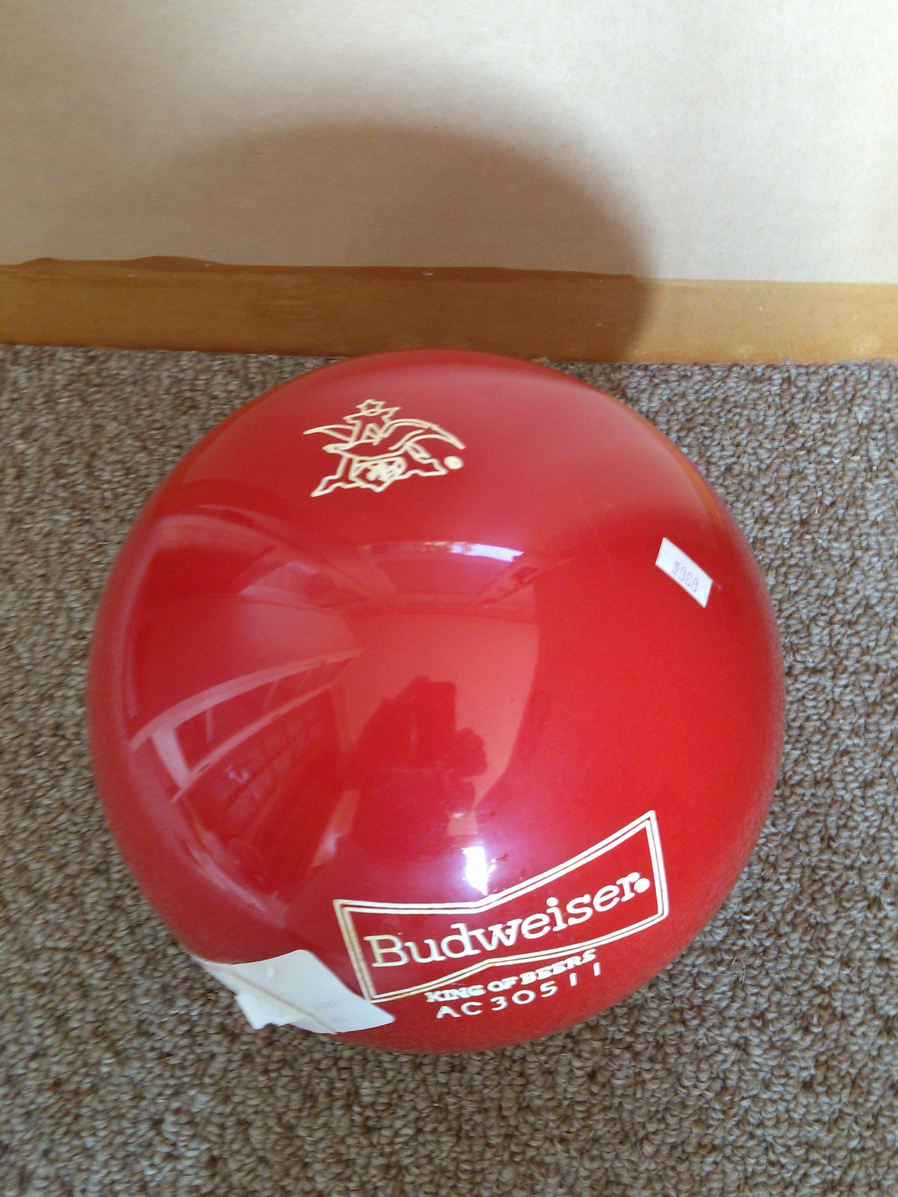 1980's Budweiser Bowling Ball with Budweiser bag and Budweiser towel. Ball and bag are mint condition, ball never drilled or used, bag and towel never used. Ball was manufactured by Brunswick, 16 lbs polyester, red. Bag is white and red. I understand these were never sold to the general public.