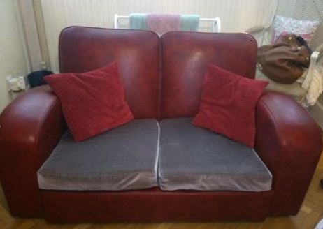 This beautiful retro 1960's sofa is available. Super stylish and would look great anywhere. Red leather back and arms, excellent structure. Grey cushioned seats.