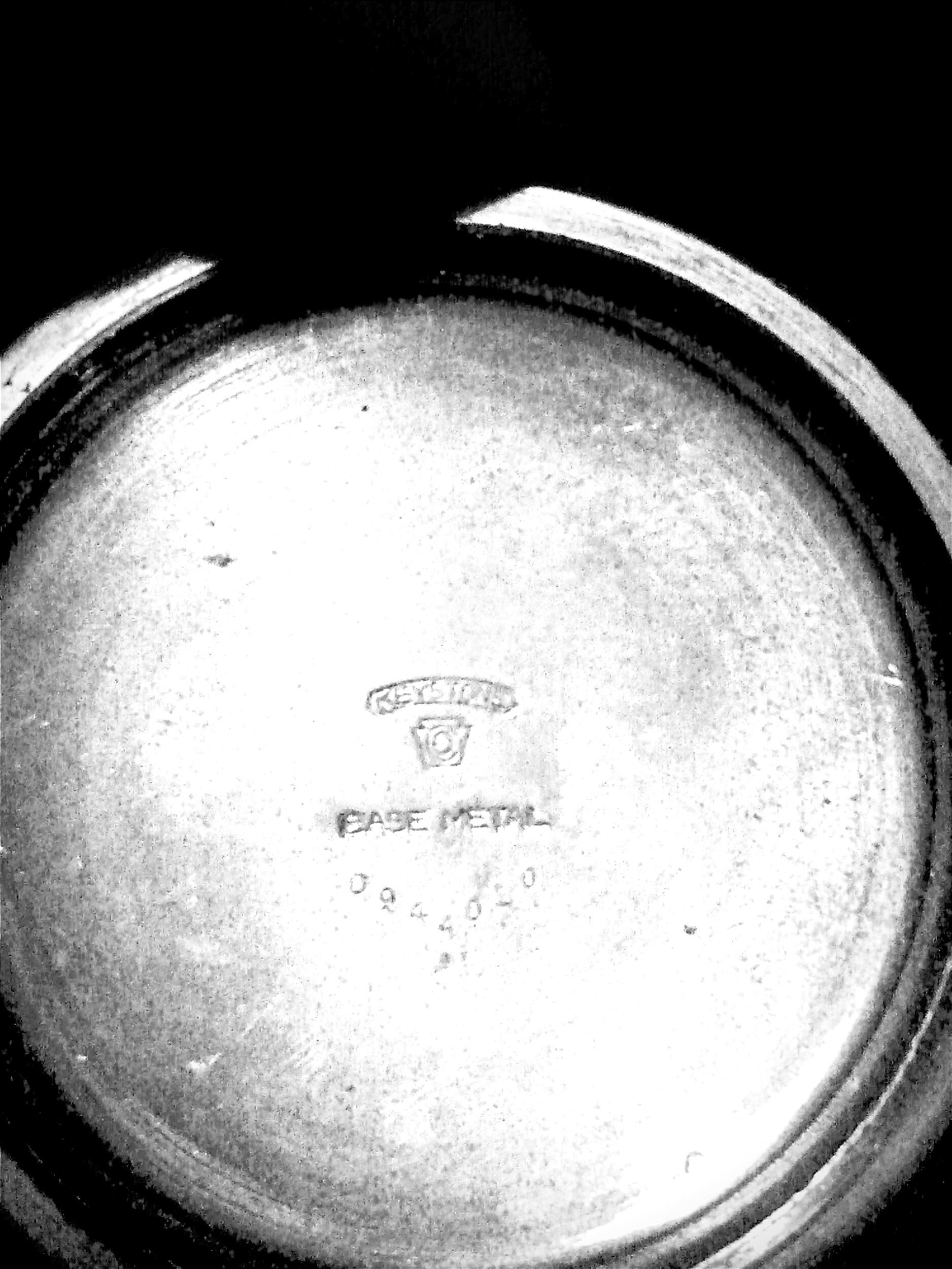 Not sure of the metals, inside, on the movement itself it says AMERICAN WALTHAM WATCH COMPANY across the bottom of the timepiece. Above, at the top of the timepiece is a number; 3428890. The backing spins off at counterclockwise, on the back of the backing it says ; KEYSTONE, it says BASE METAL, and then 7 numbers in a "V" fashion; 0944010. On the front of the watch, it says "Am' Watch C", and below that is says " Waltham". The face has dinged somewhat slightly, its an off yellow maybe? There is no dial set, the thing u twist to set time, its missing, so I have no clue if it works. My grandfather told it works a few months before he passed. There is a minute and hour hand, no second hand, however; it does have a seconds diallat the bottom of the face.
