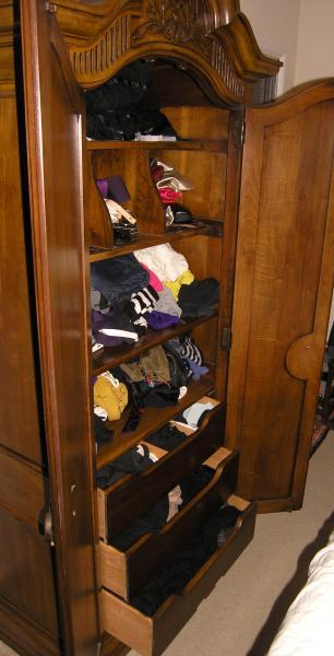 Can be use as a clothes storage but used for China/Dining Set or Glassware Storage, has three bottom drawers. the top one is partitioned.