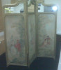Wow this floor screen is such a rare and unique decorator’s find. The warm golden tone colors make available a sophisticated air. I’ve used this as both a room divider and back ground panel for atmosphere. It’s a great conversational piece. Now this is not in new, mint condition. It resembles a treasure you would stumble upon in an ancient castle. So there are several scratches, scuffs, scrapes, dings and places where the painting detail has worn off. Noteworthy for character is the far right end panel. Here you will find a slight bend in the scene and possibly what you would call a dribble in the painting. Somehow, as time went on, something liquid was on the screen. The back of the screen is in one solid color, black. Also, there are a few “keep me attached to the wall wires” on the back of the screen. It's beautifully divided into four seperate panels.