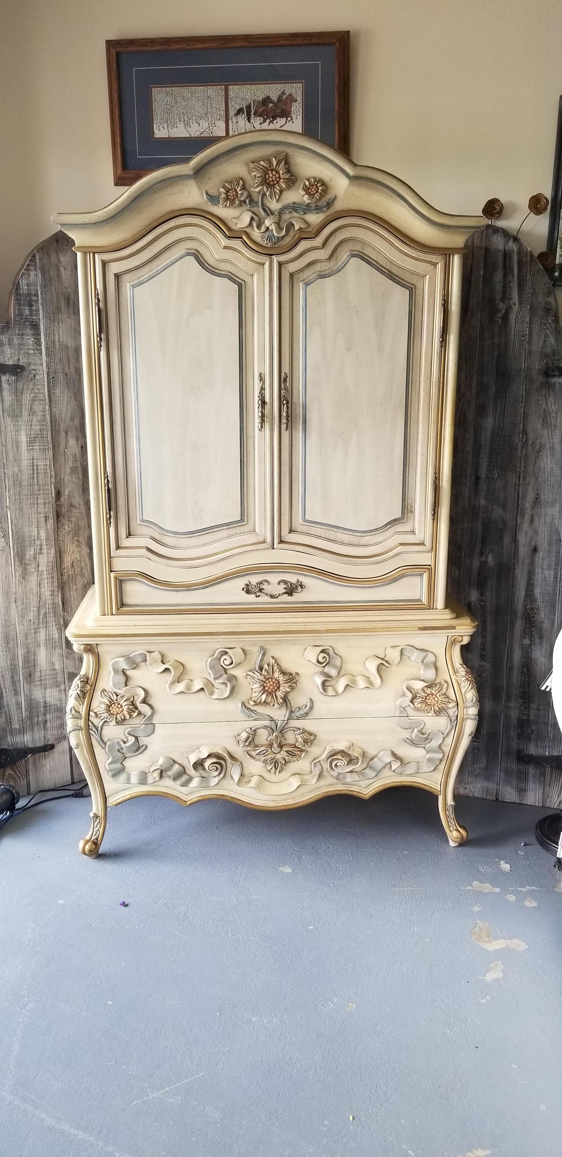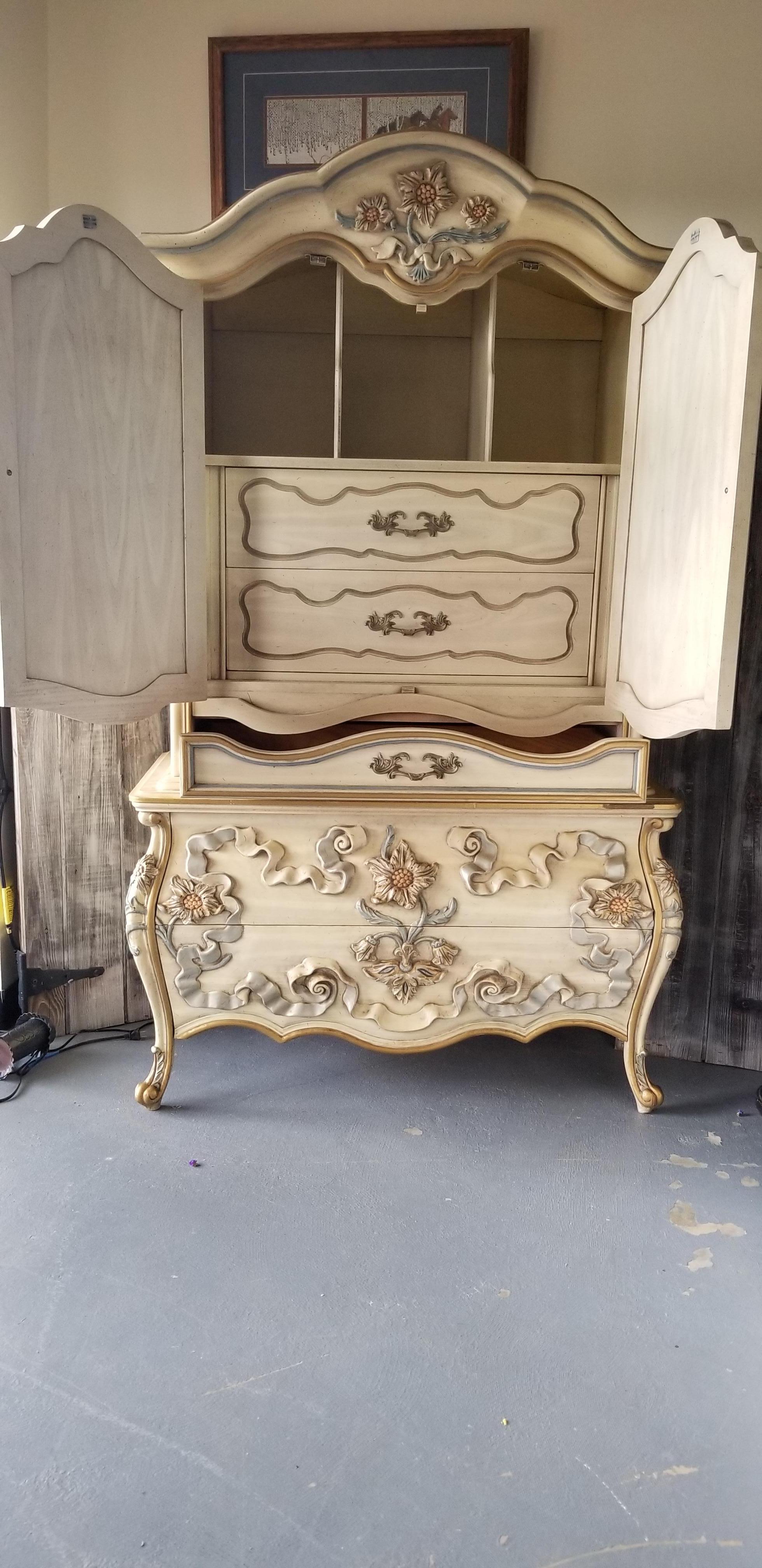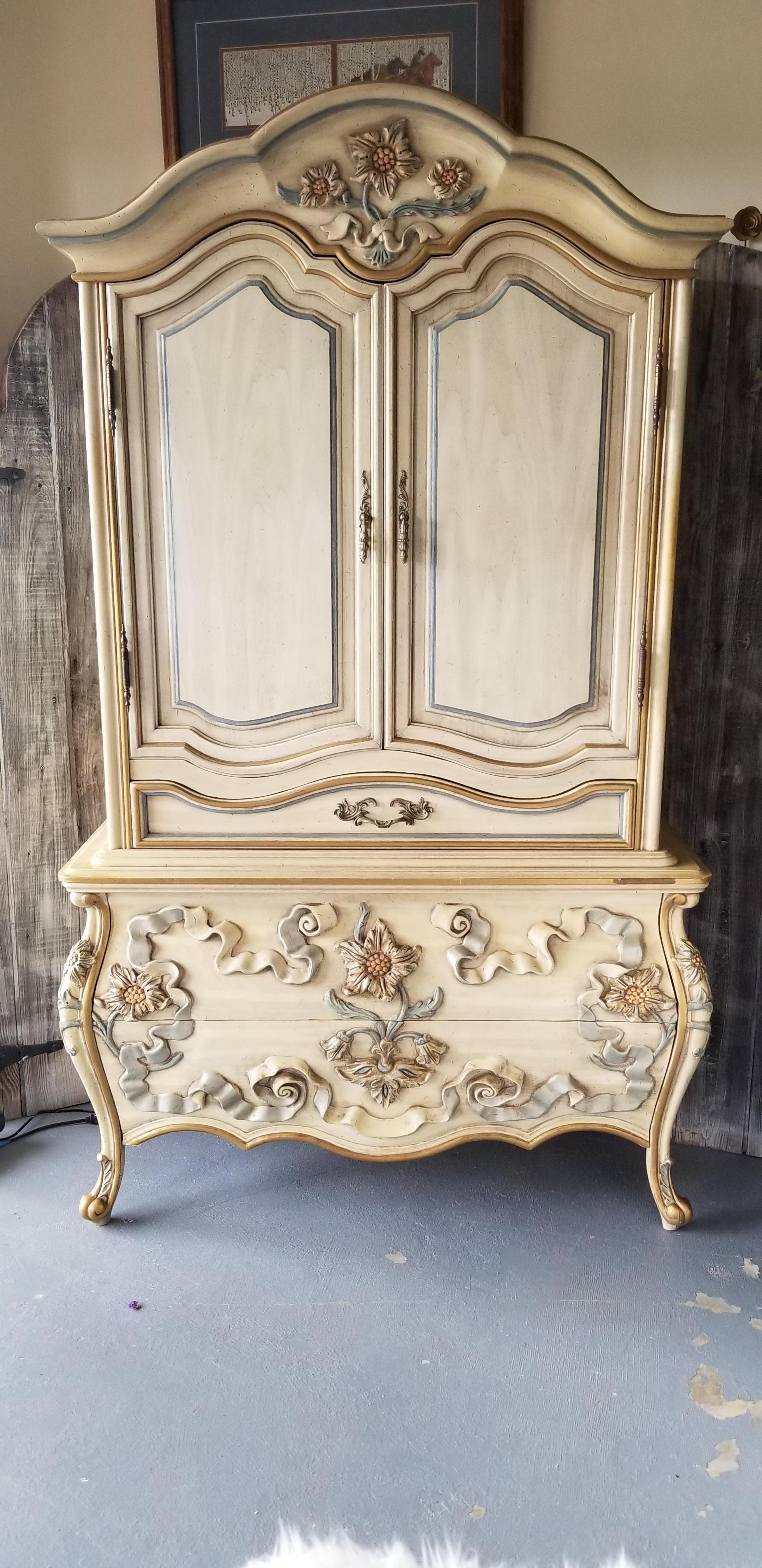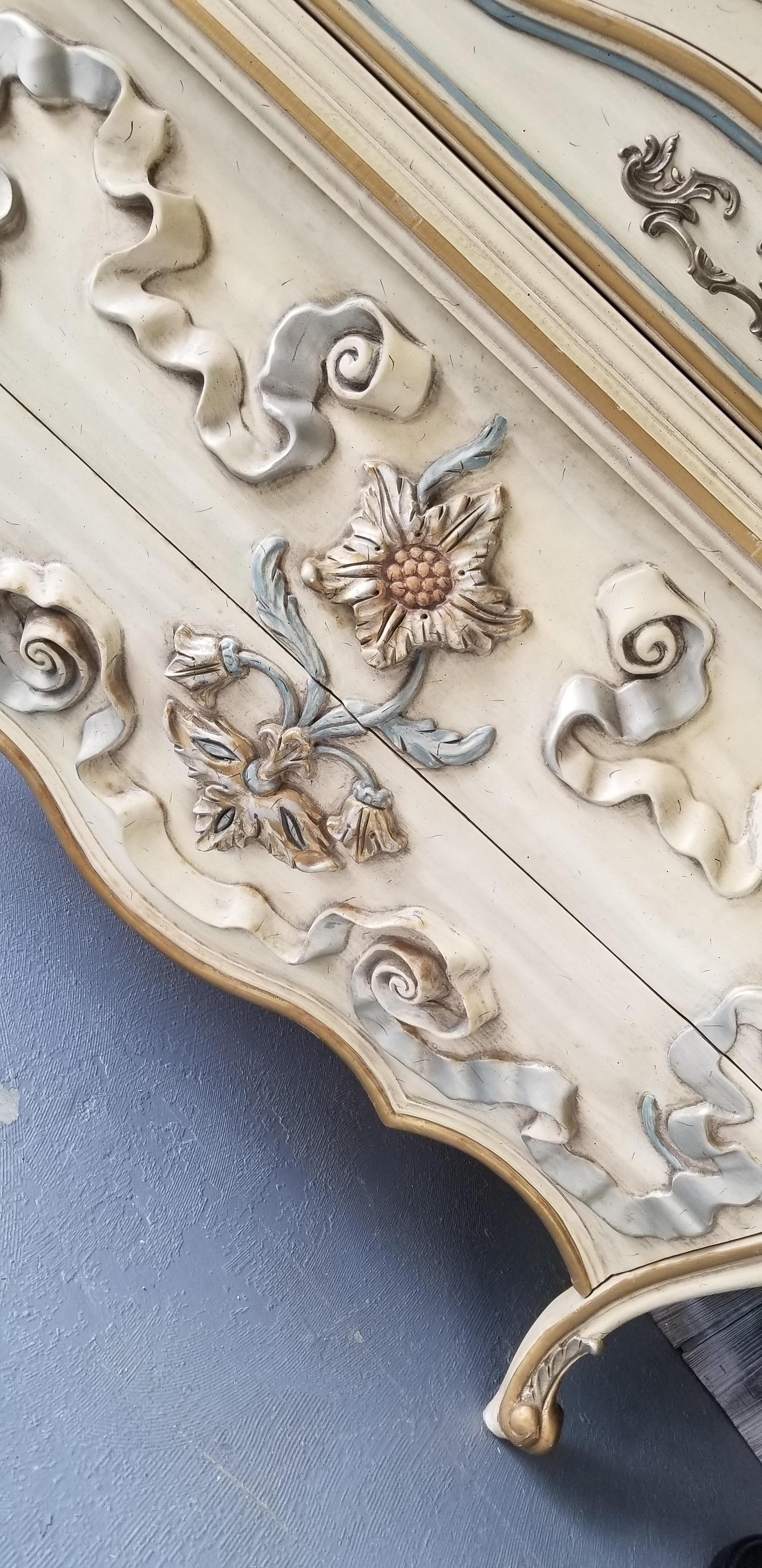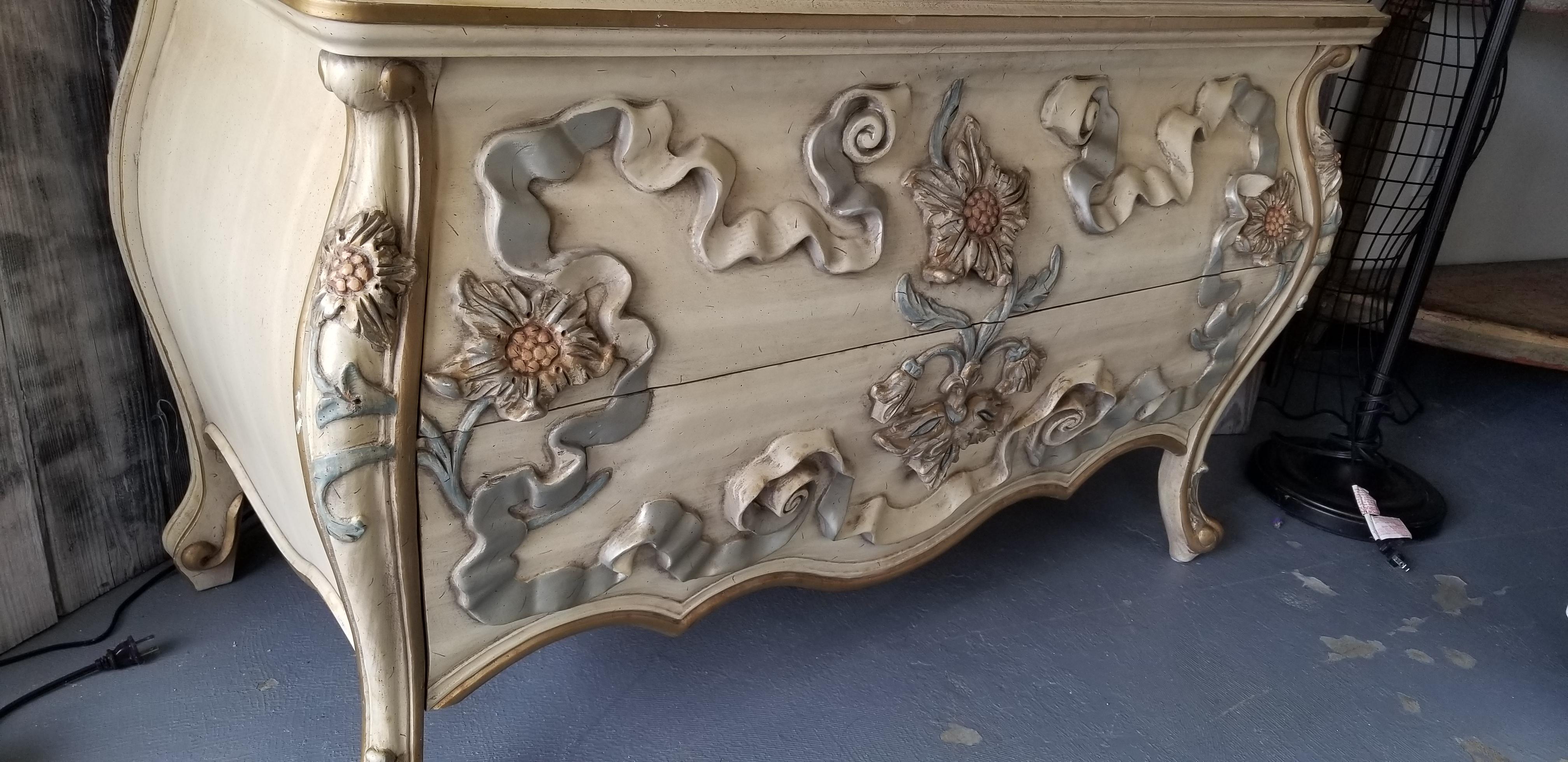 I have been told this is possibly European I am not sure.It is heavily carved with what looks to be french legs. . Flowers appear to be some type of sunflowers and ribbons. Carvings are taller in height than normal. It is built with great quality solid wood all over has dovetail front and rear drawers. There is no maker's mark anywhere on outside or inside of drawers . I have found 2 of these searching the Internet only to come up with comments such as "beauty in the beast" thank you all so much for your help!!!