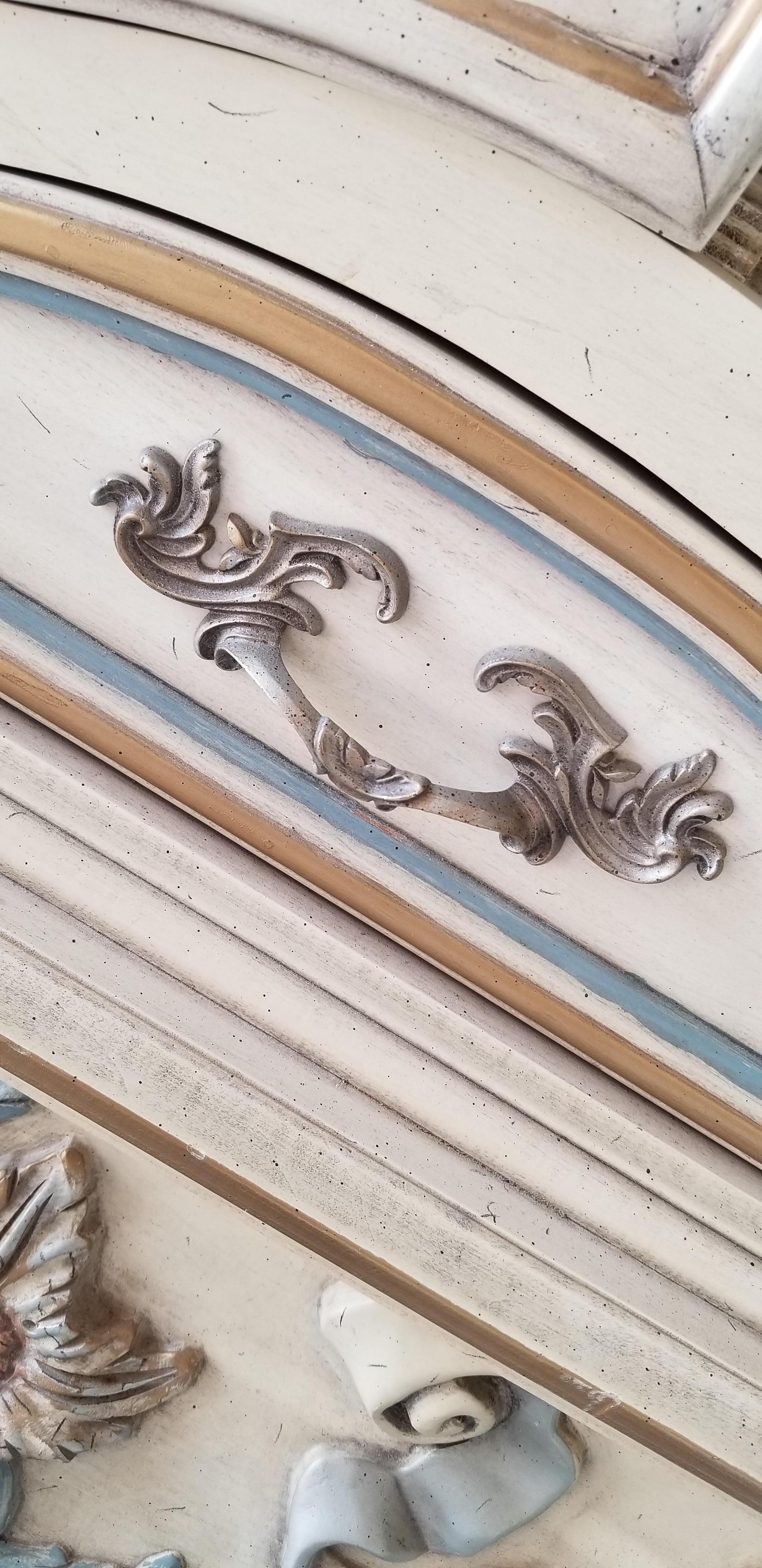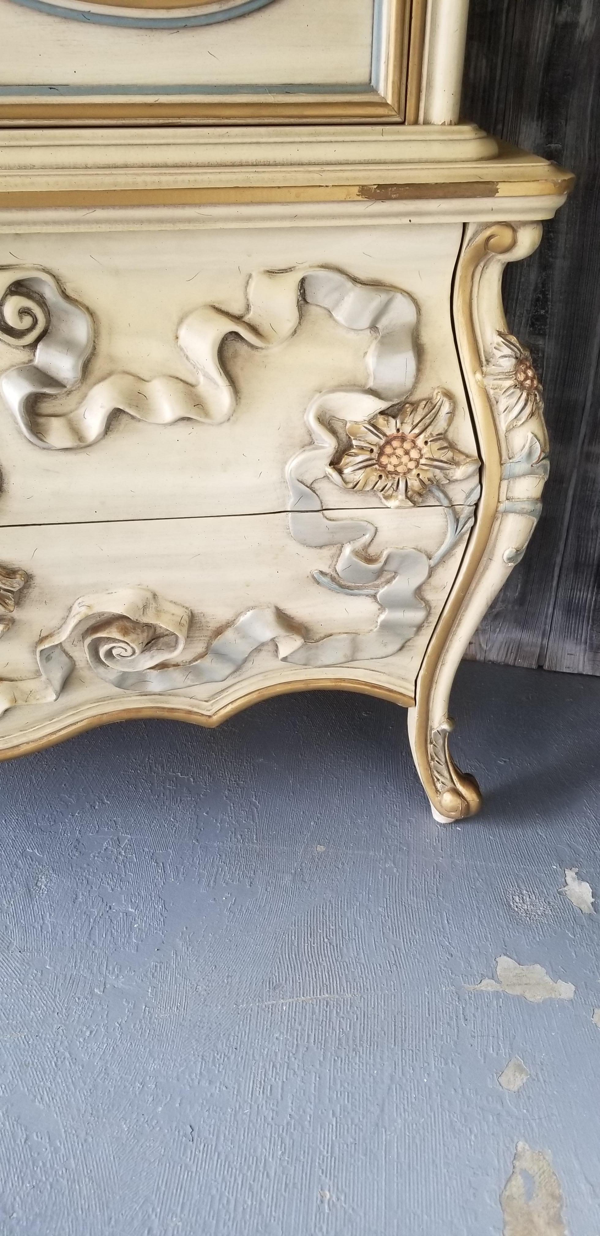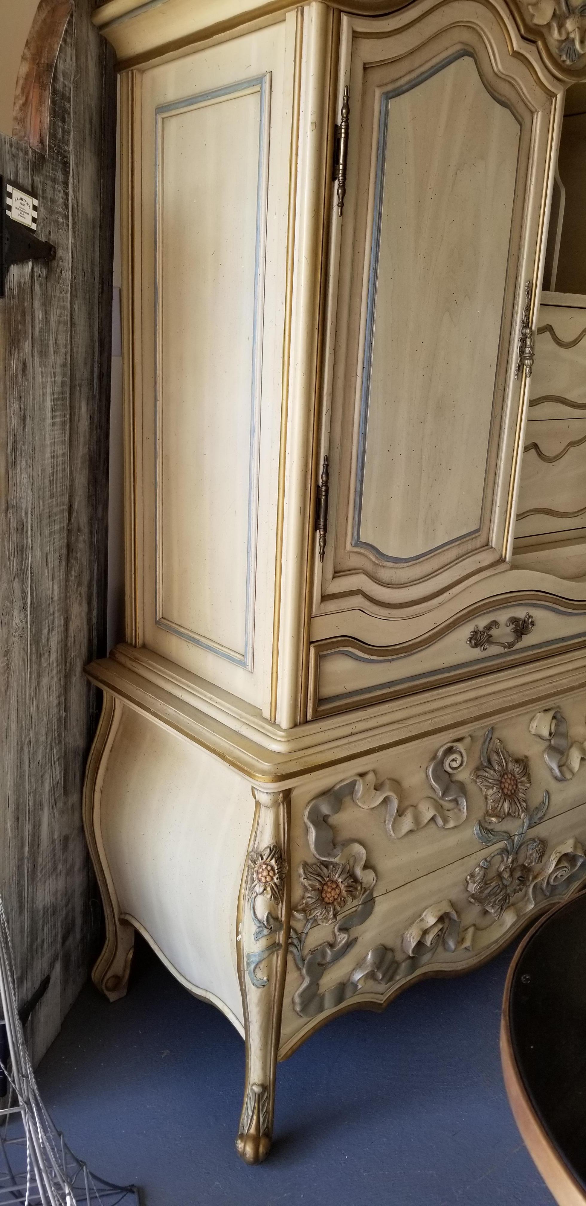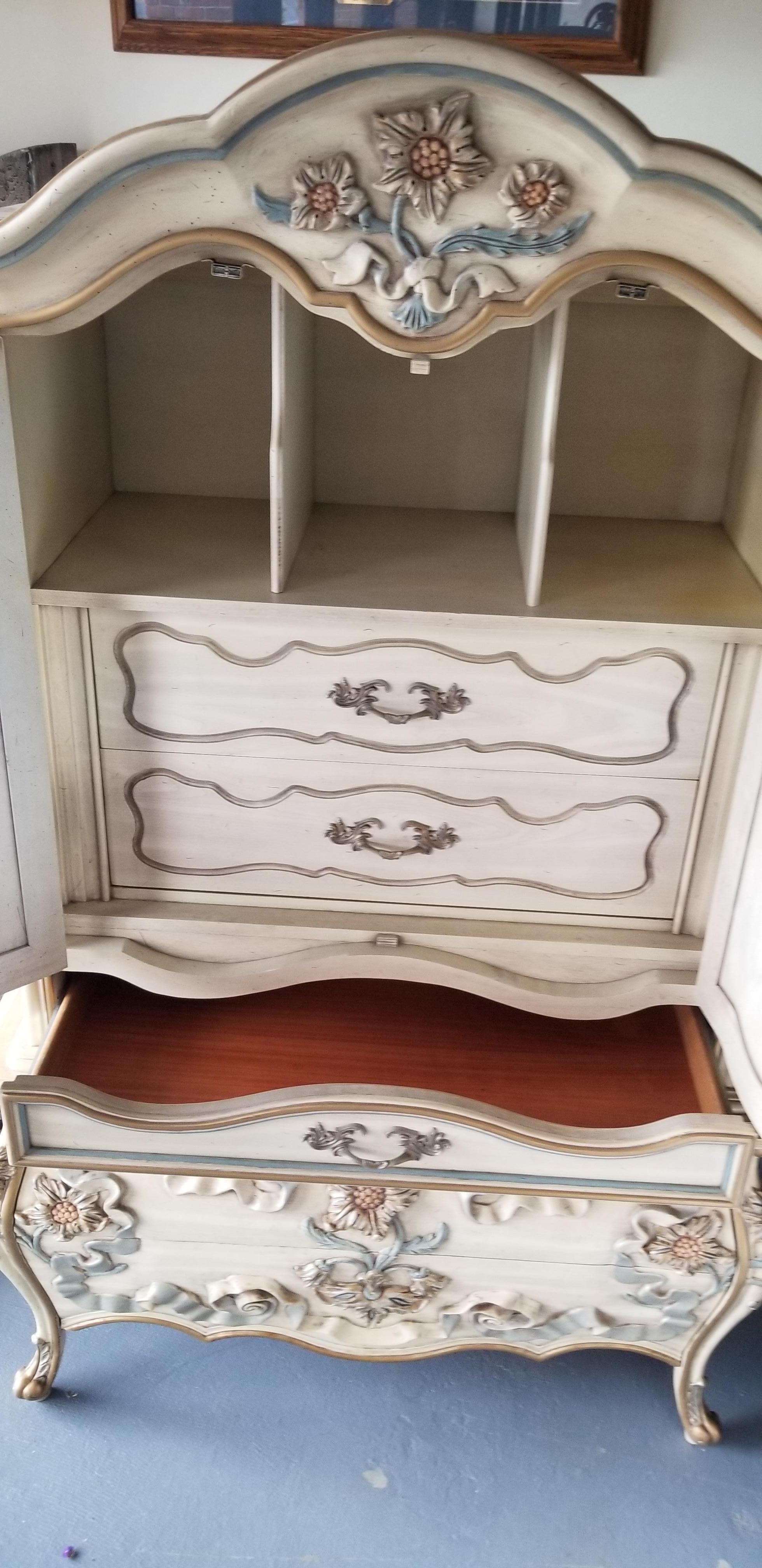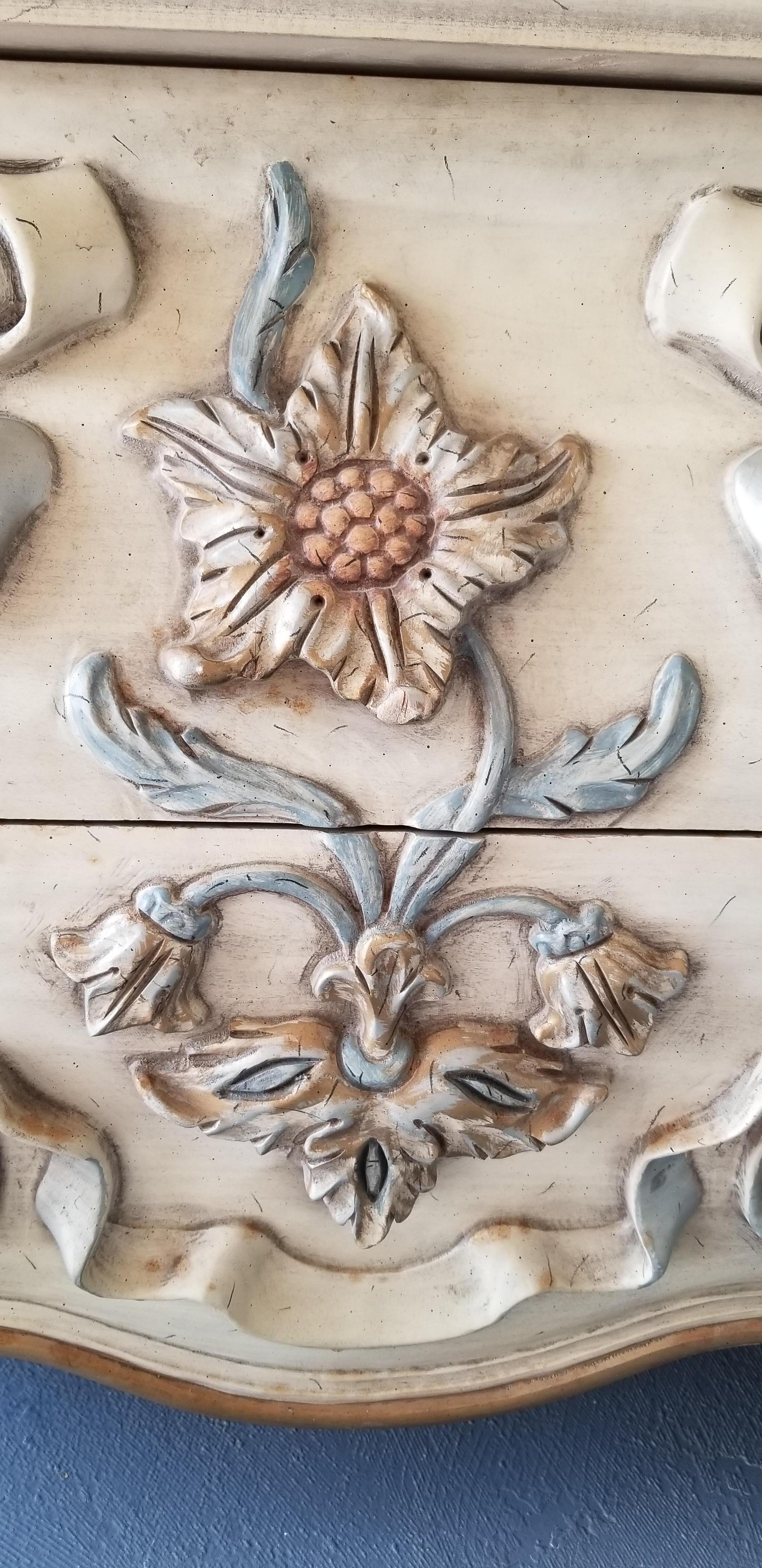 I have been told this is possibly European I am not sure.It is heavily carved with what looks to be french legs. . Flowers appear to be some type of sunflowers and ribbons. Carvings are taller in height than normal. It is built with great quality solid wood all over has dovetail front and rear drawers. There is no maker's mark anywhere on outside or inside of drawers . I have found 2 of these searching the Internet only to come up with comments such as "beauty in the beast" thank you all so much for your help!!!
