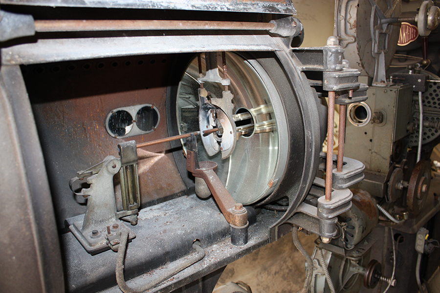 The lamp house is in good condition, but does have a cracked mirror reflector. The film projector has a broken braket for the top reel, but is in in good condition otherwise.