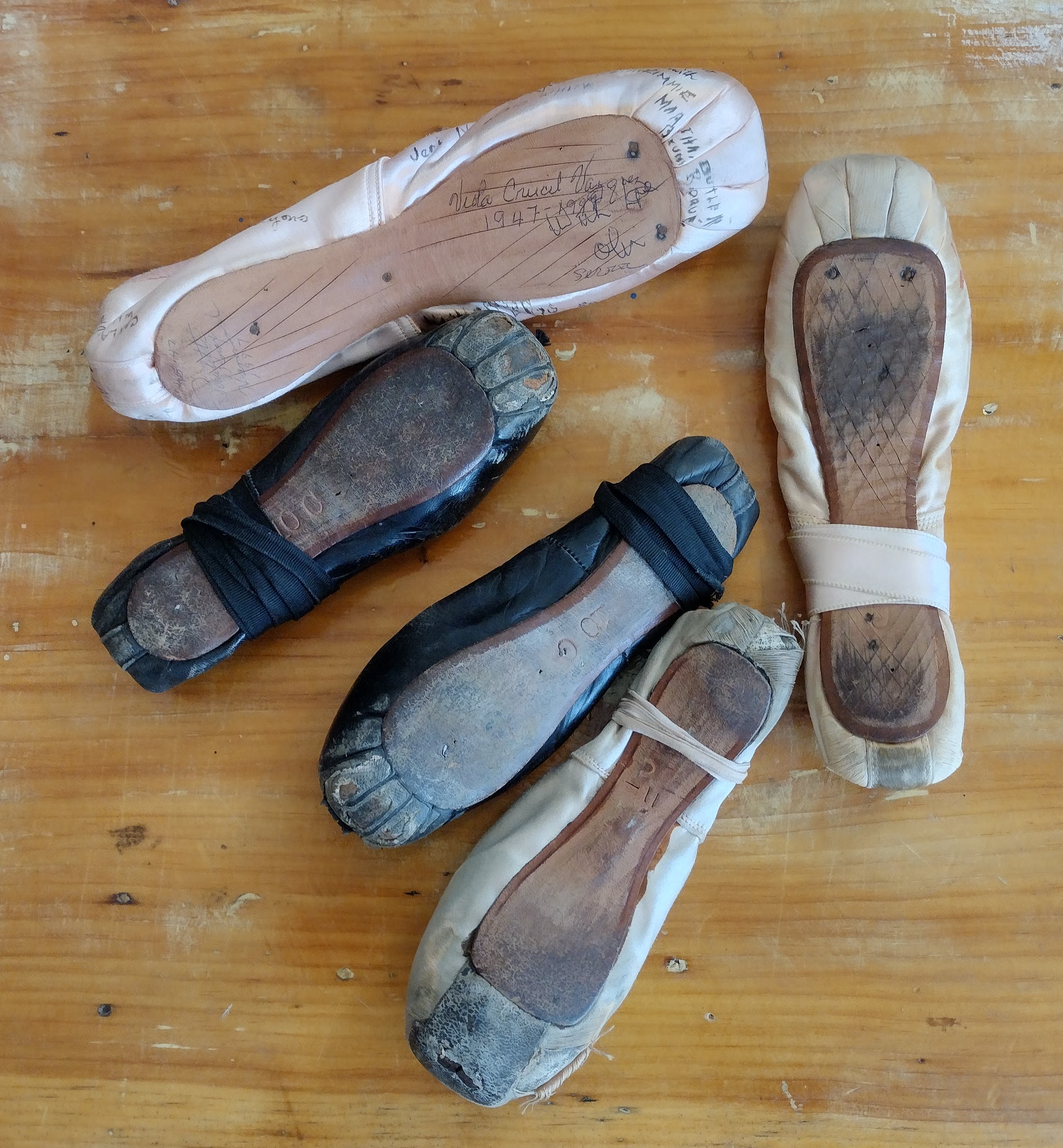 Ballet slippers worn by my mother as a little girl and when she worked at The Ballet Corp at Radio City Music Hall in the 40's as a teenager. The one shoe is signed by all her ballet friends there when she left to get married. We have photos of her as a 4 year old on toe shoes!