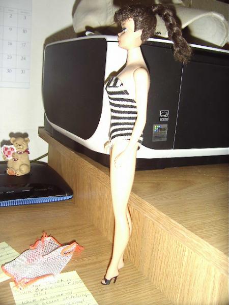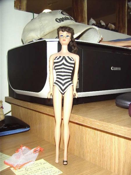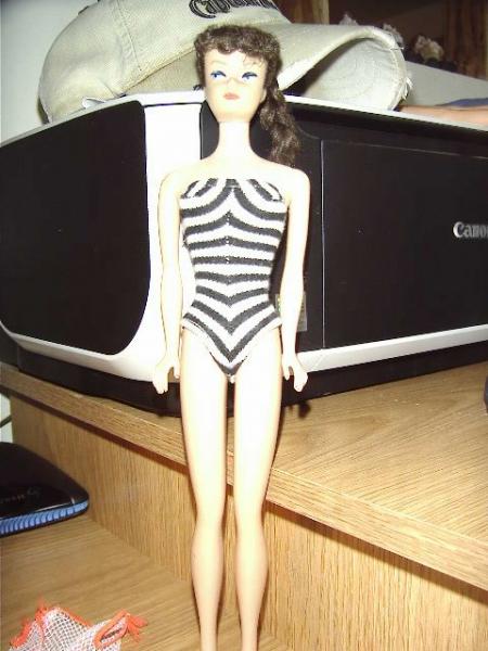 Gently played with. Wearing original black and white striped bathing suit. Hair was in a braid I believe but is missing the ribbon. She has one of the original black open toe heels. Straight legs, straight torso.
