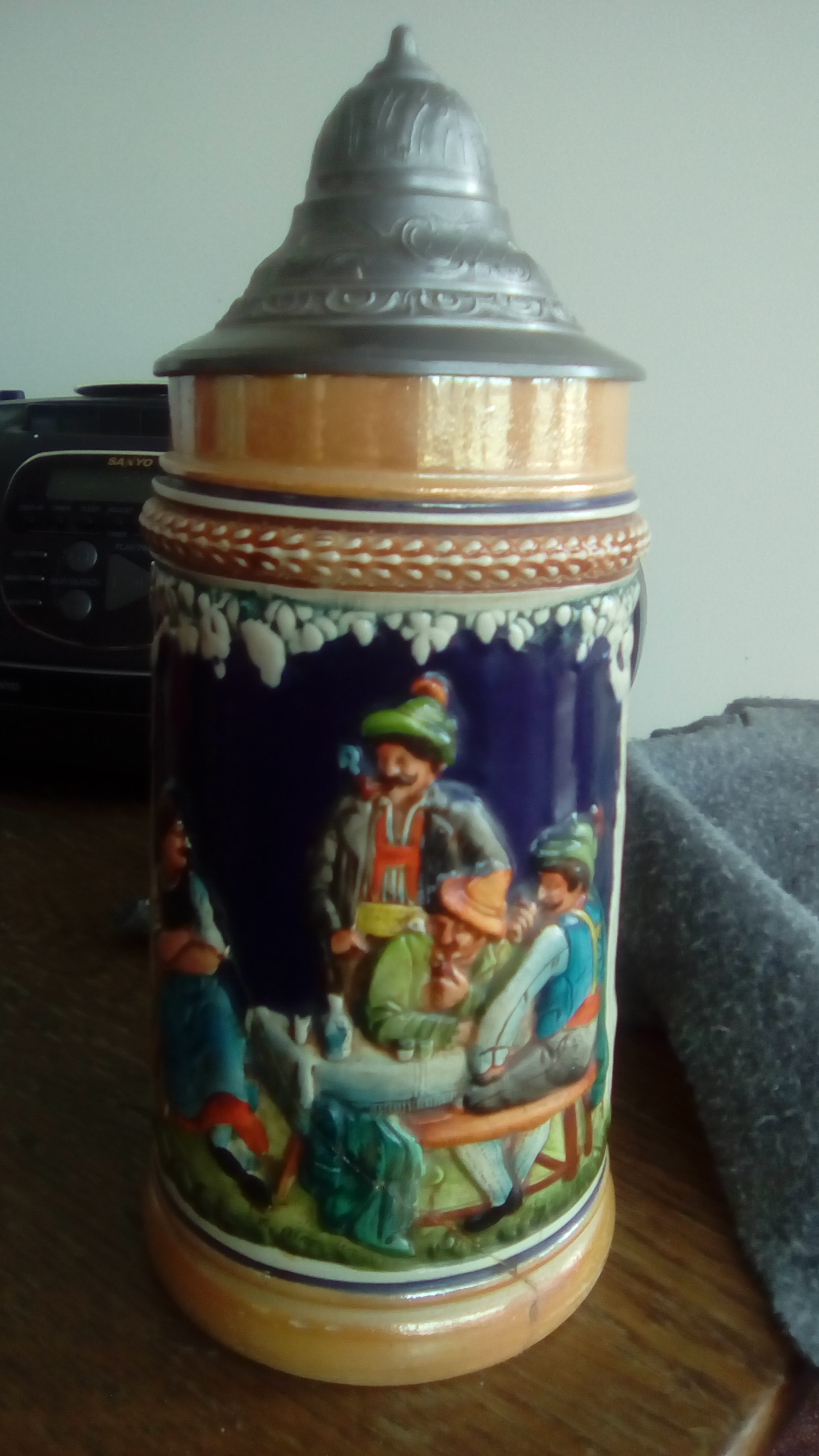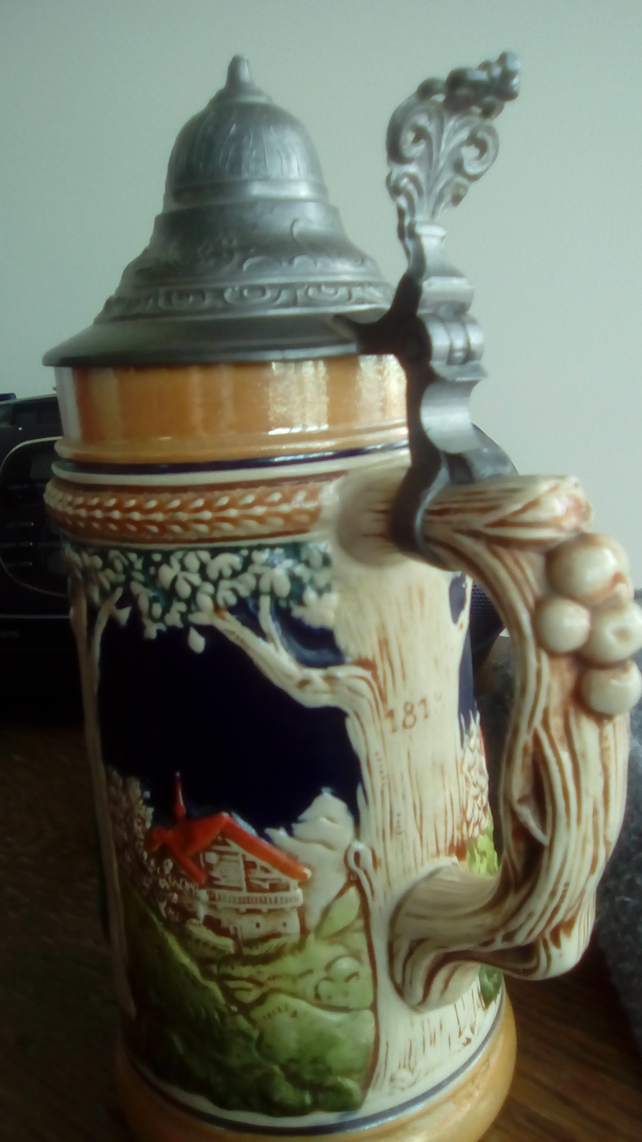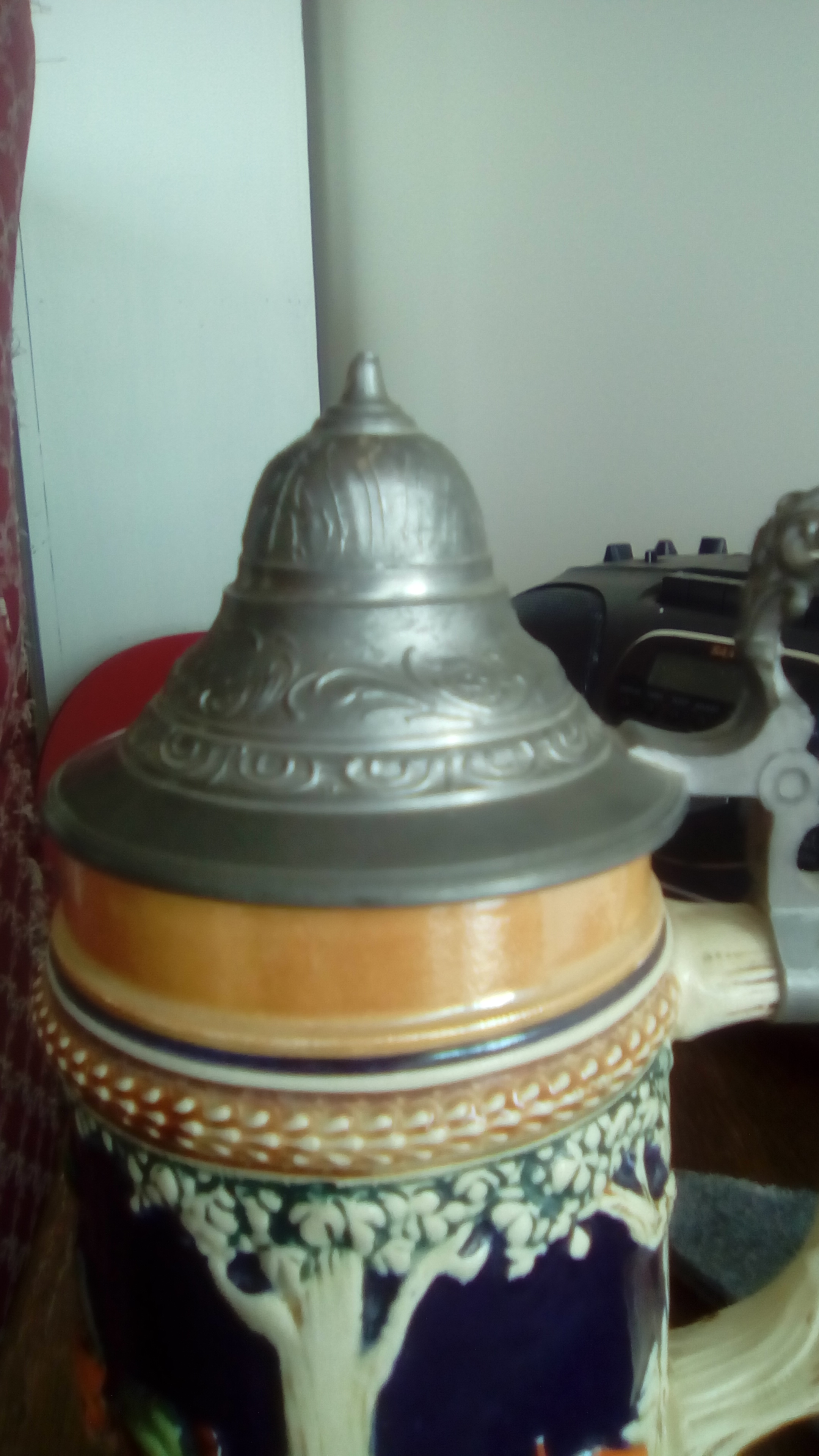 Hey I'd like an appraisal for a stein I have its paint looks still glassy its had a crack at sometime and I think its been repaired the metal at the top Im unsure if its pewter or not
