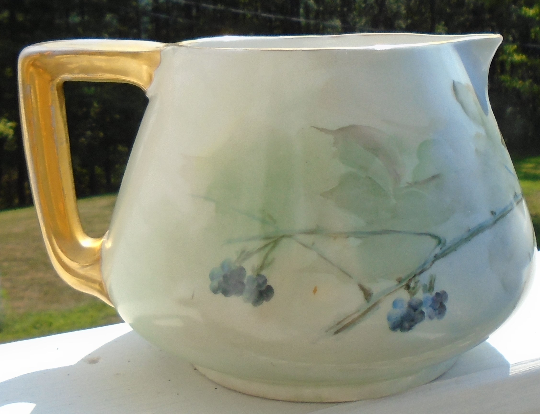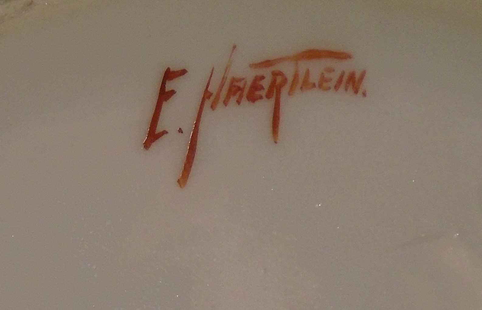 I found this pitcher at a yard sale. When I got home to do some research I found that it is Limoges from France. The bottom has the green stamp. B & Co France as you will see in my picture. The artist has signed the piece in red on the bottom. E. Haertlein. Pic of that as well. There is what appears to be a S and the number 3 incised on the bottom as well. I believe they call this a cider pitcher. It stands 6" tall/ The width across the front is 7" without the handle. There are no chips or cracks. Just wear to the gold on the handle and around the edge. I have tried to find this pattern for at least 2 hours online and cannot. I hope that someone can tell me what I have and what it's worth. Thank you.