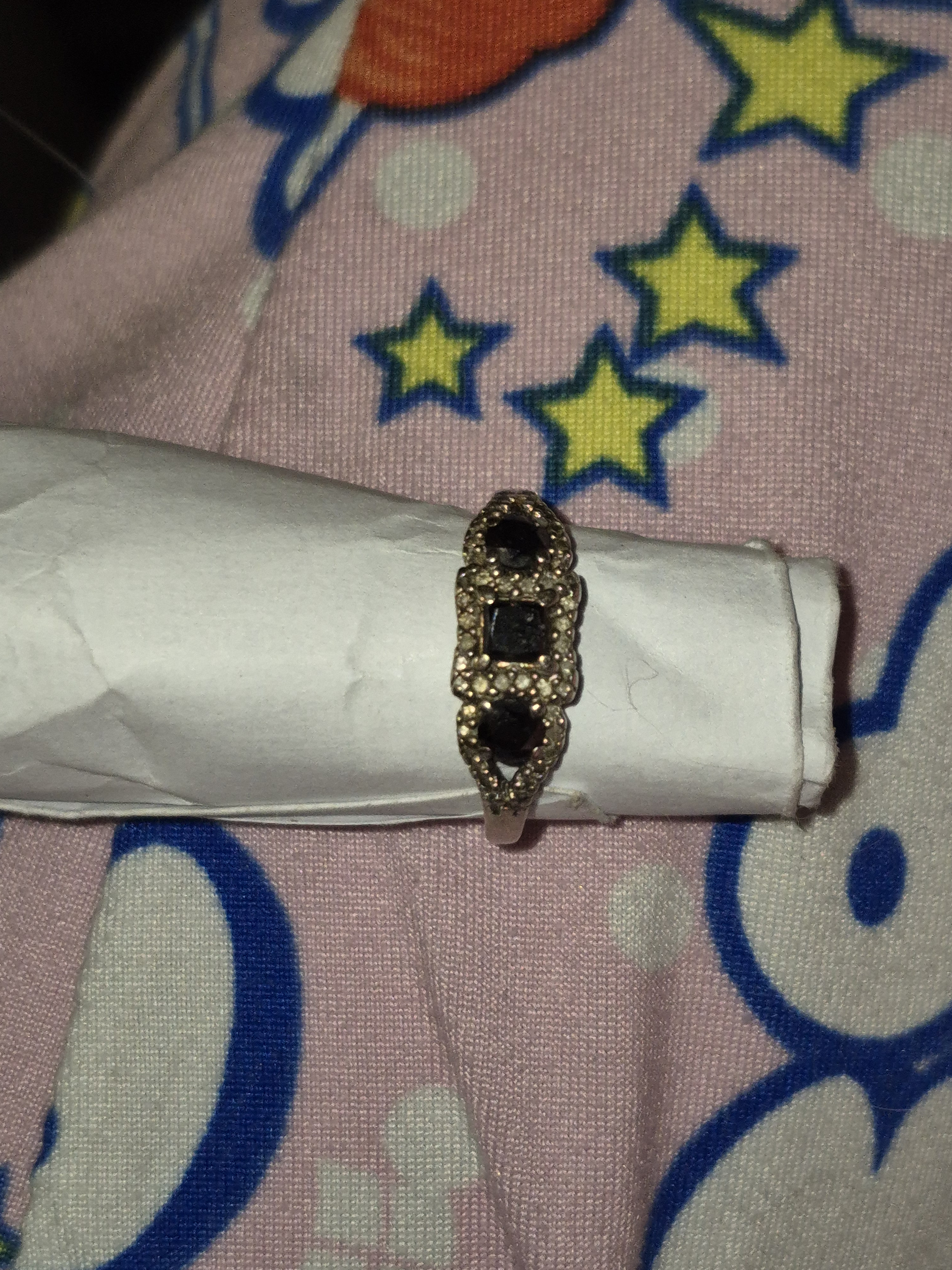 Vintage Black Diamond Ring. Dating to Mid 20th Century. Materials: Black diamonds, white diamonds, possibly silver or gold setting. Estimated value: $95 – $250. Condition: Very Good. Stable market for vintage jewelry with moderate demand.