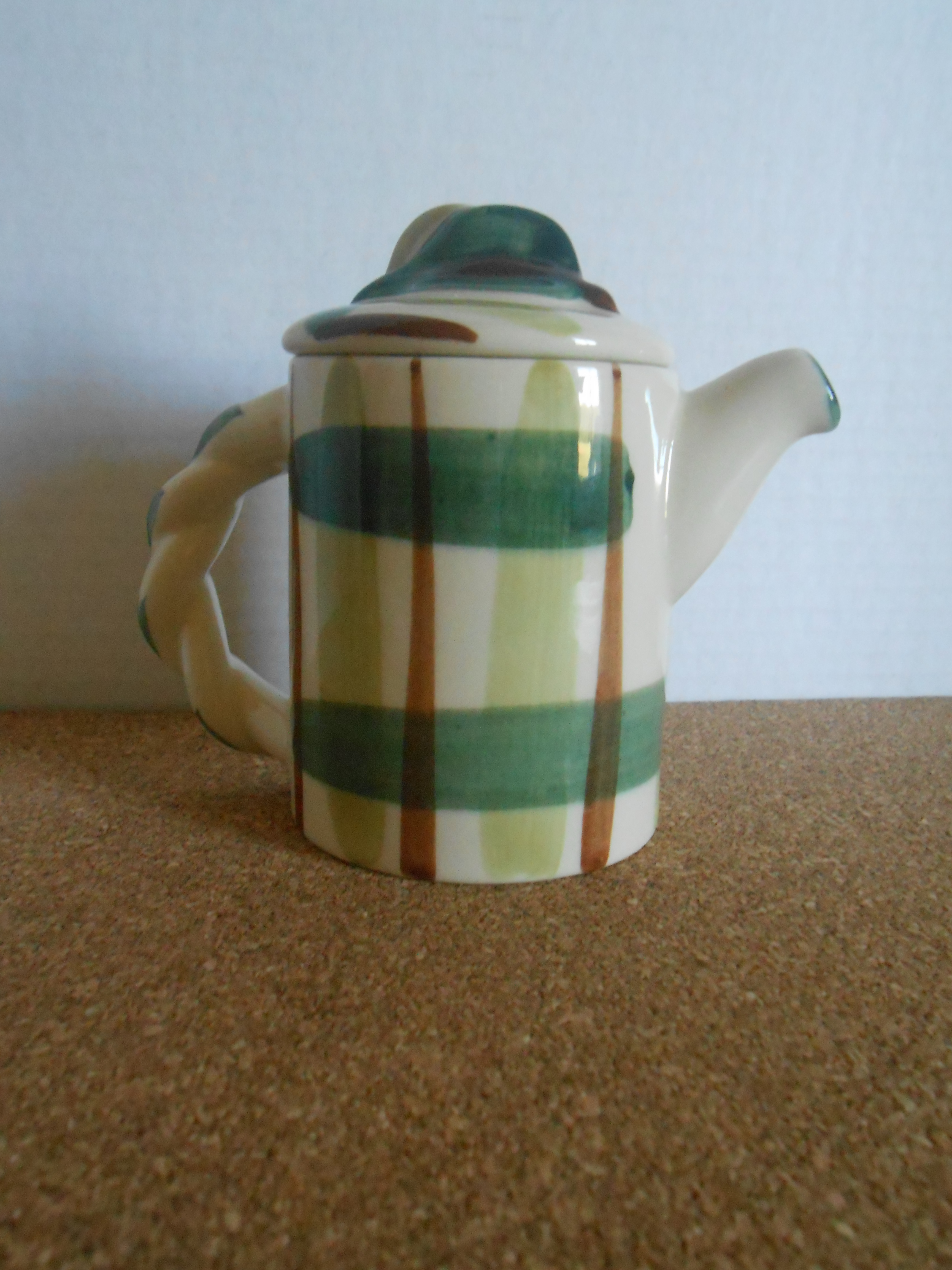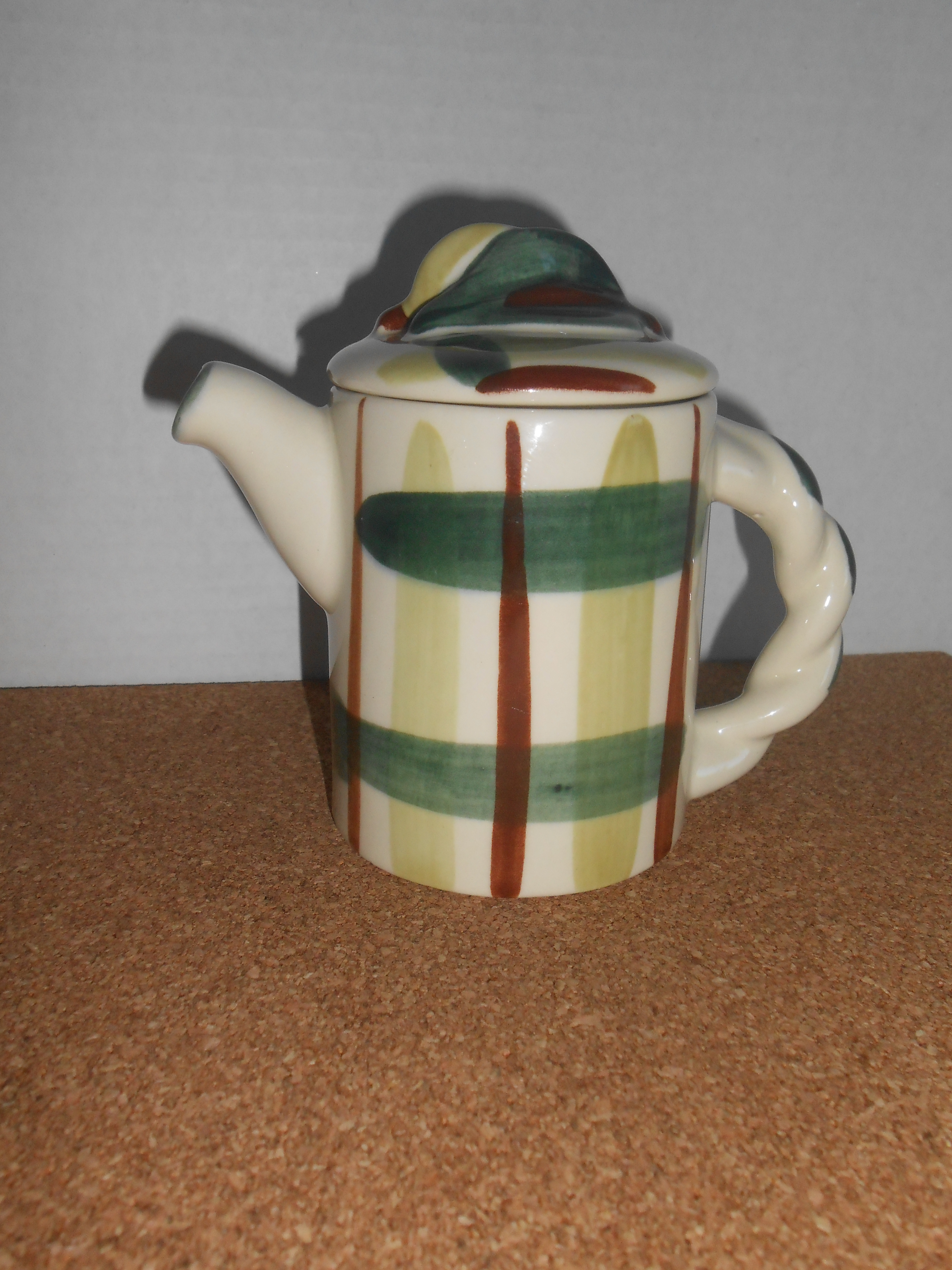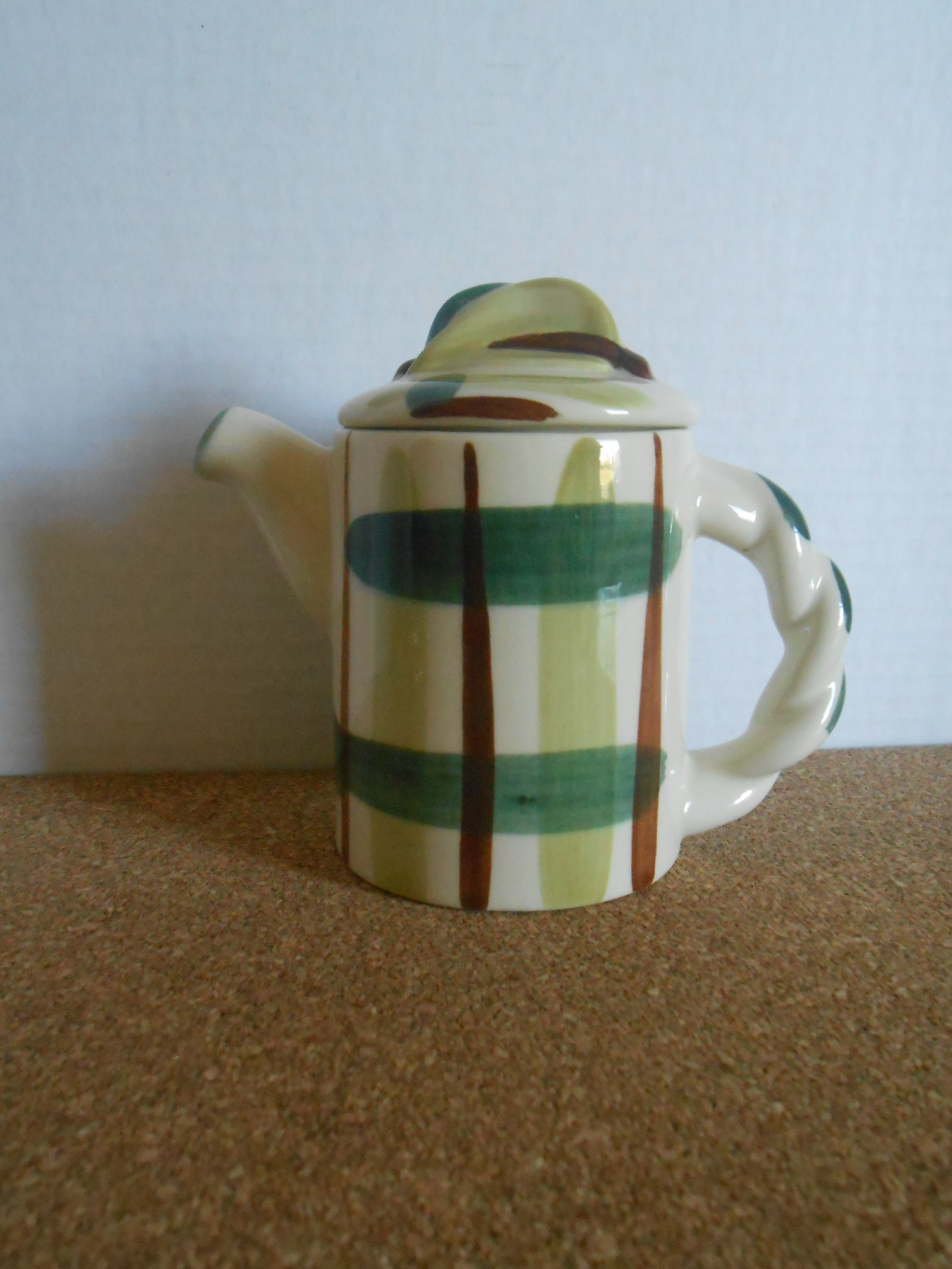 I just purchased this item at a garage sale and could not find much information about it. I did find that it was made my William Blair in the 1940's and is part of the "Gay Plaid" pattern used at the time. It however is not as tall as the coffee pot in the same pattern. It only measures about 4 inches tall. The item is in perfect condition. Any and all information about piece is welcomed.