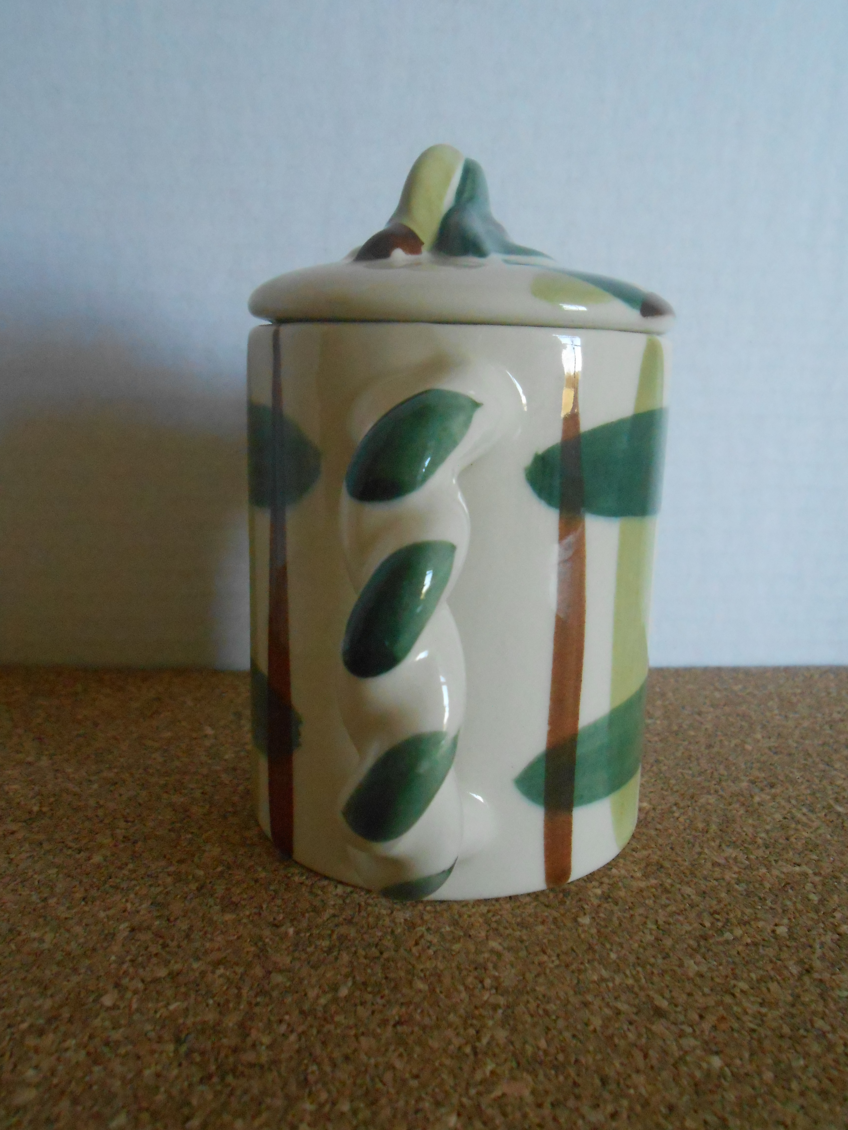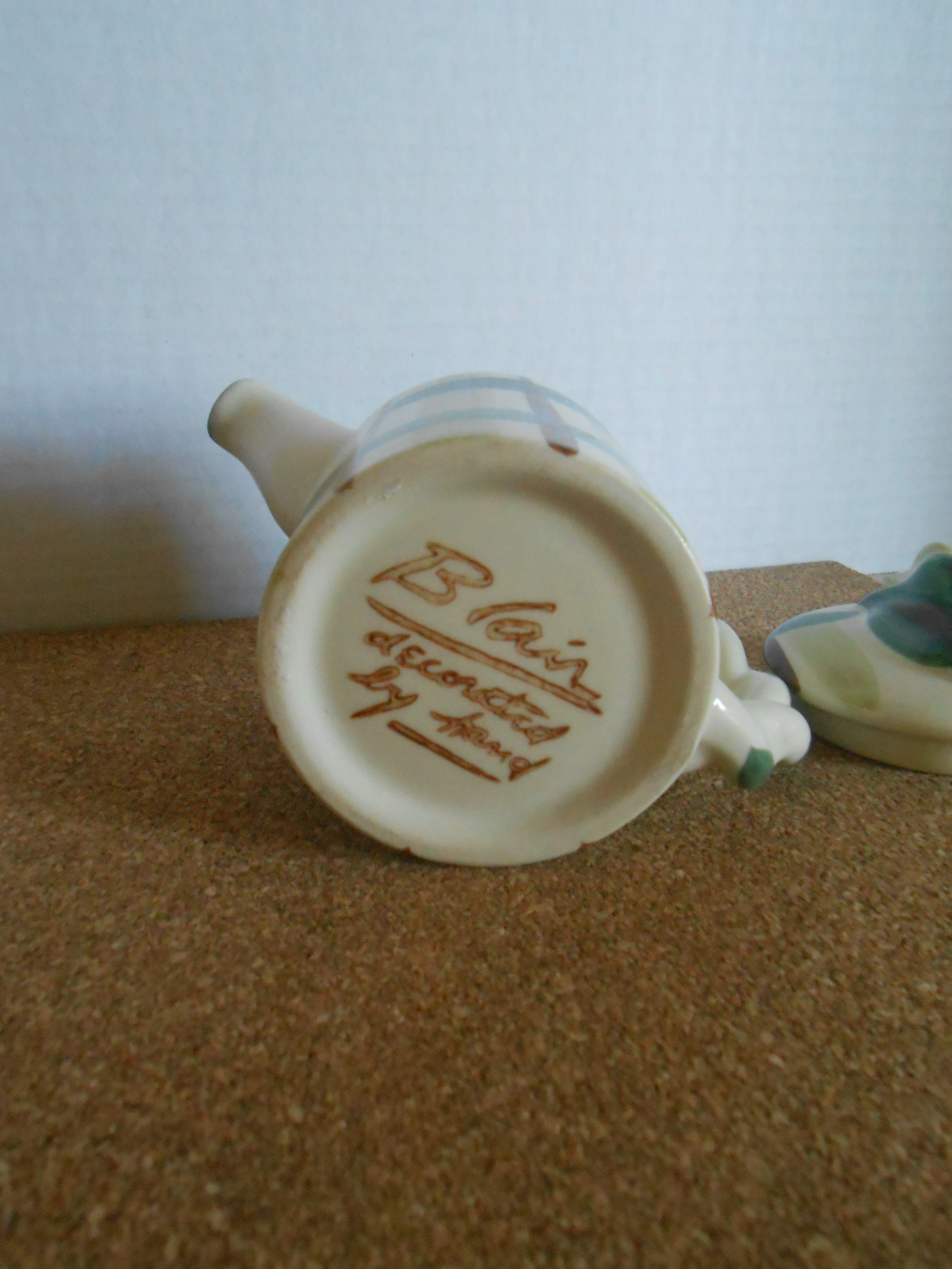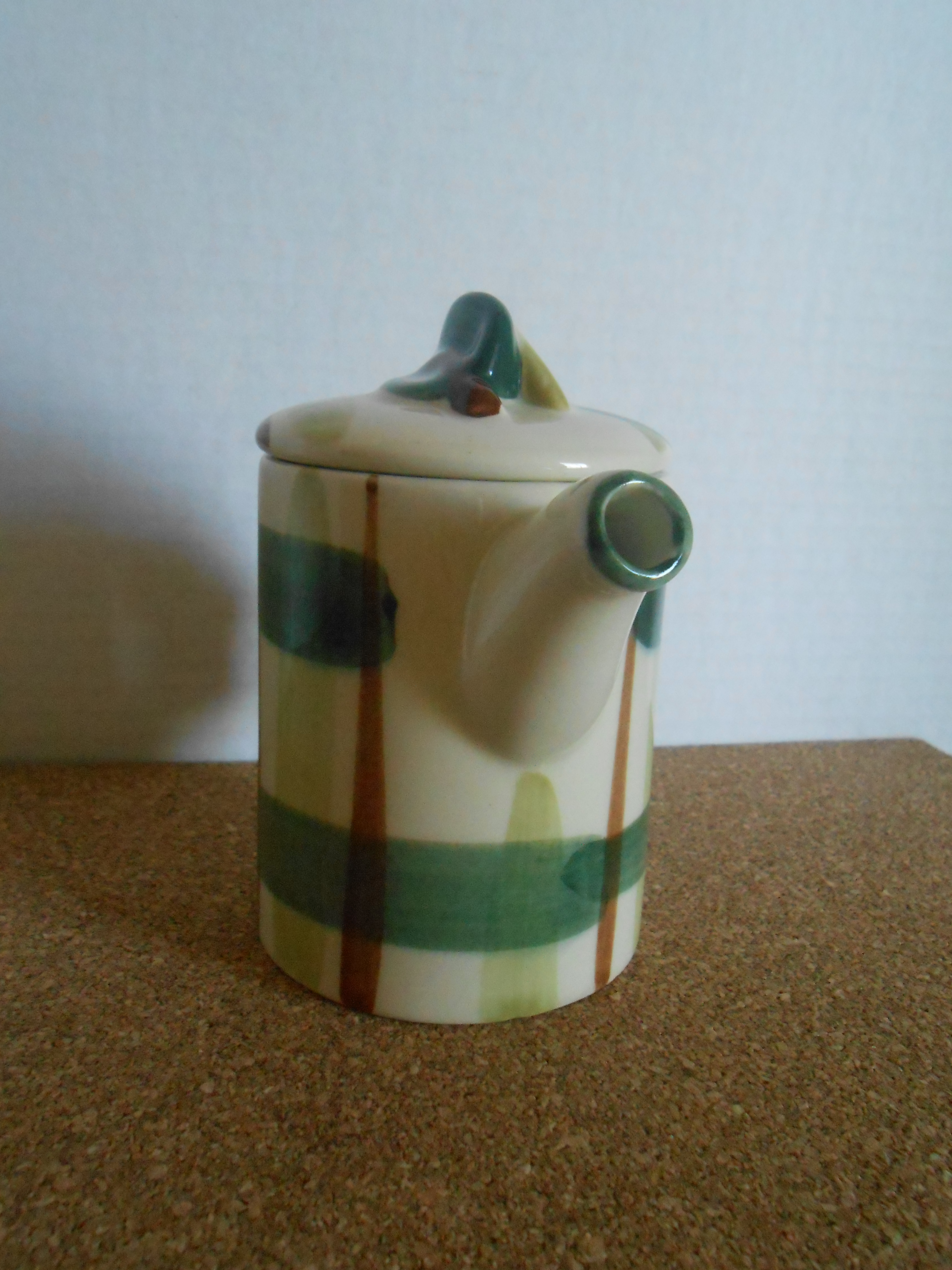 I just purchased this item at a garage sale and could not find much information about it. I did find that it was made my William Blair in the 1940's and is part of the "Gay Plaid" pattern used at the time. It however is not as tall as the coffee pot in the same pattern. It only measures about 4 inches tall. The item is in perfect condition. Any and all information about piece is welcomed.