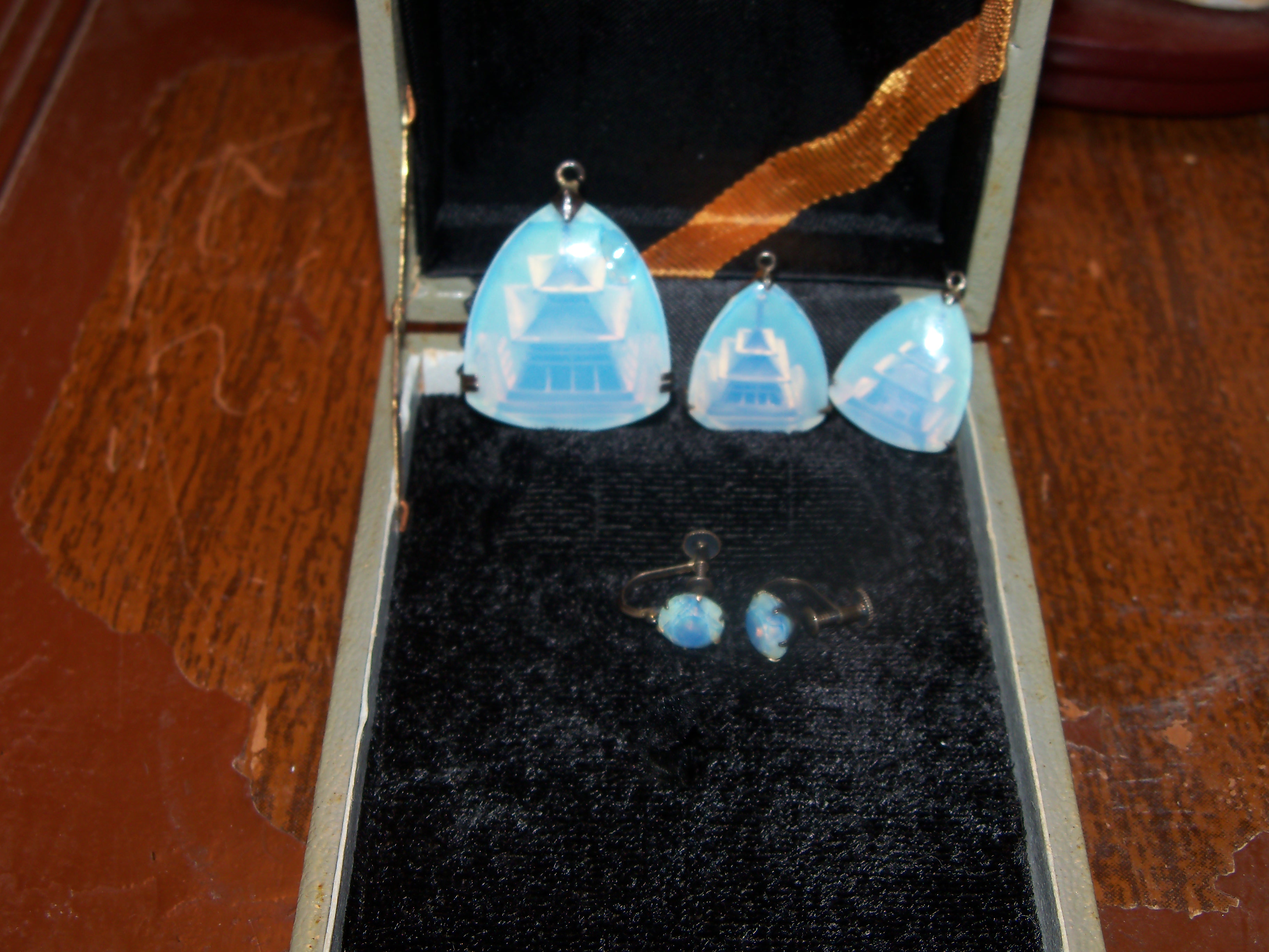 I have inherited a 3 pendants and a pair of screw back earrings from my aunt. The set is beautiful milkstone. The pendants (1 big, 2 smaller) are triangular shaped and all 3 of them have the Chinese Jaixu Tower engraved in 3d style inside of them. I am hearing that I am sitting on a goldmine! But I can't get a proper appraisel on this set due to lack of knowledge because it is so rare.