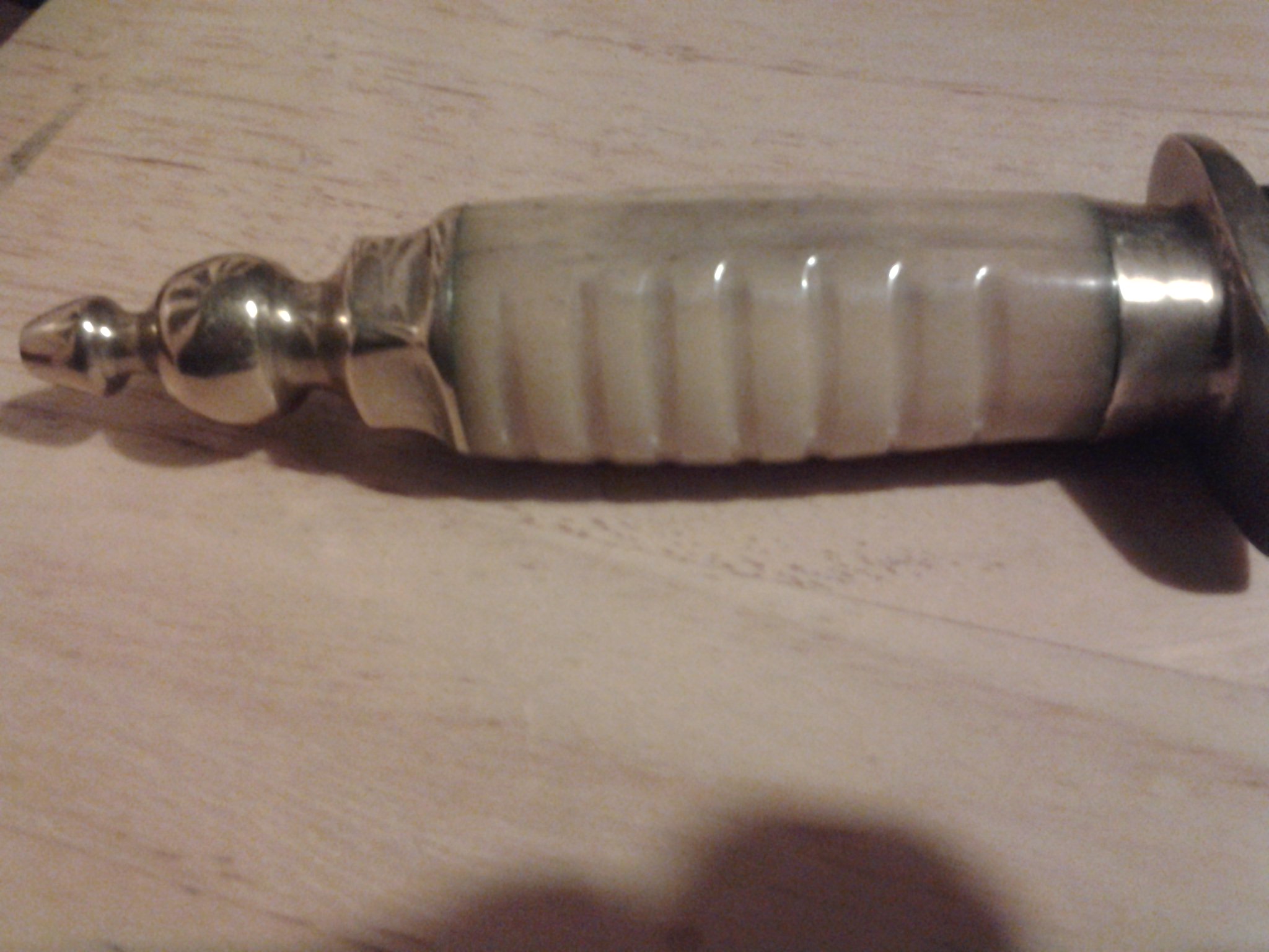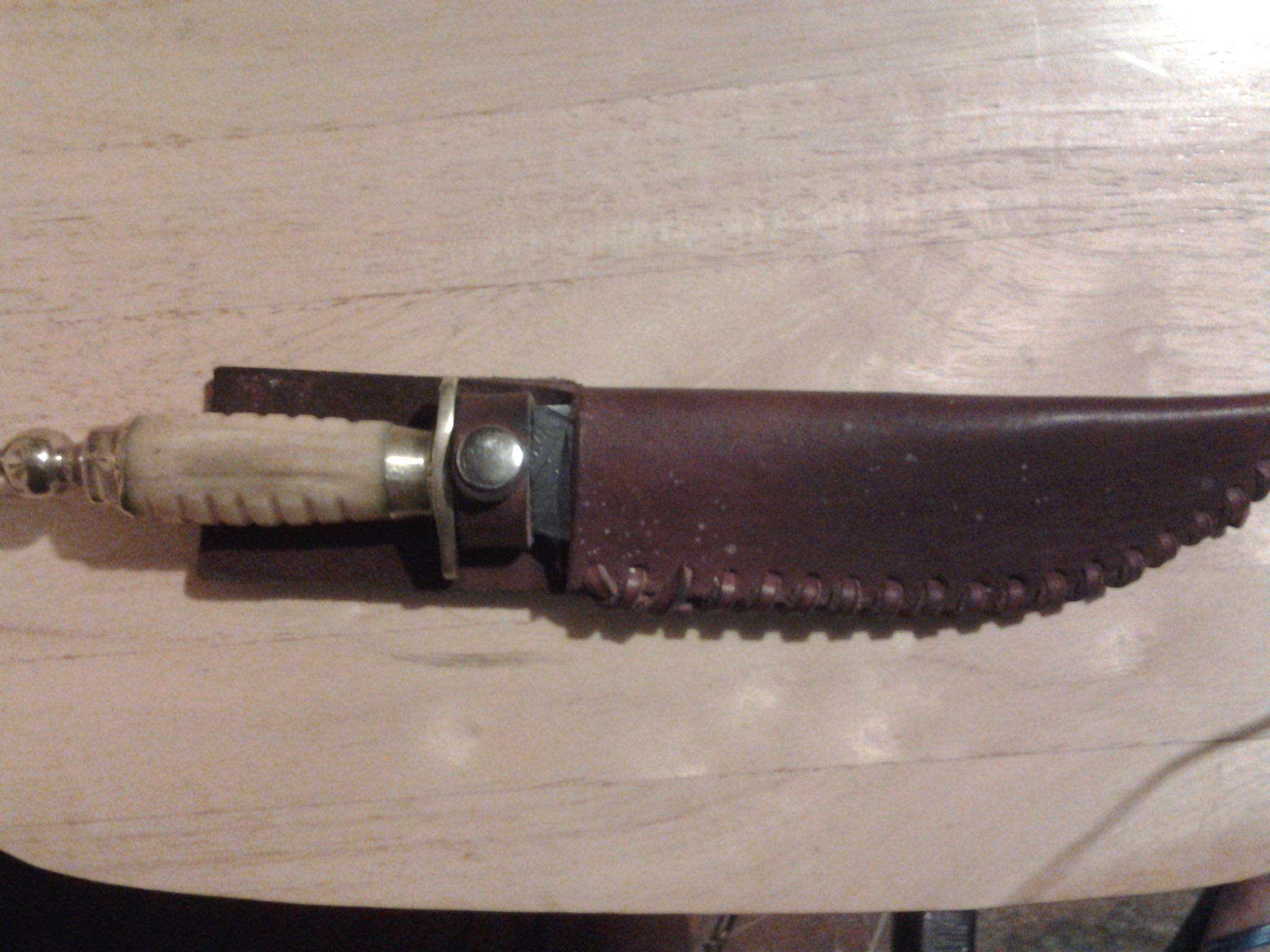 Vintage bowie knife in leather sheath. The blade is 6" long and handle is 5" long. The initials E.P.S.C. are on the both sides of the blade above the handle which looks like bone or resin.