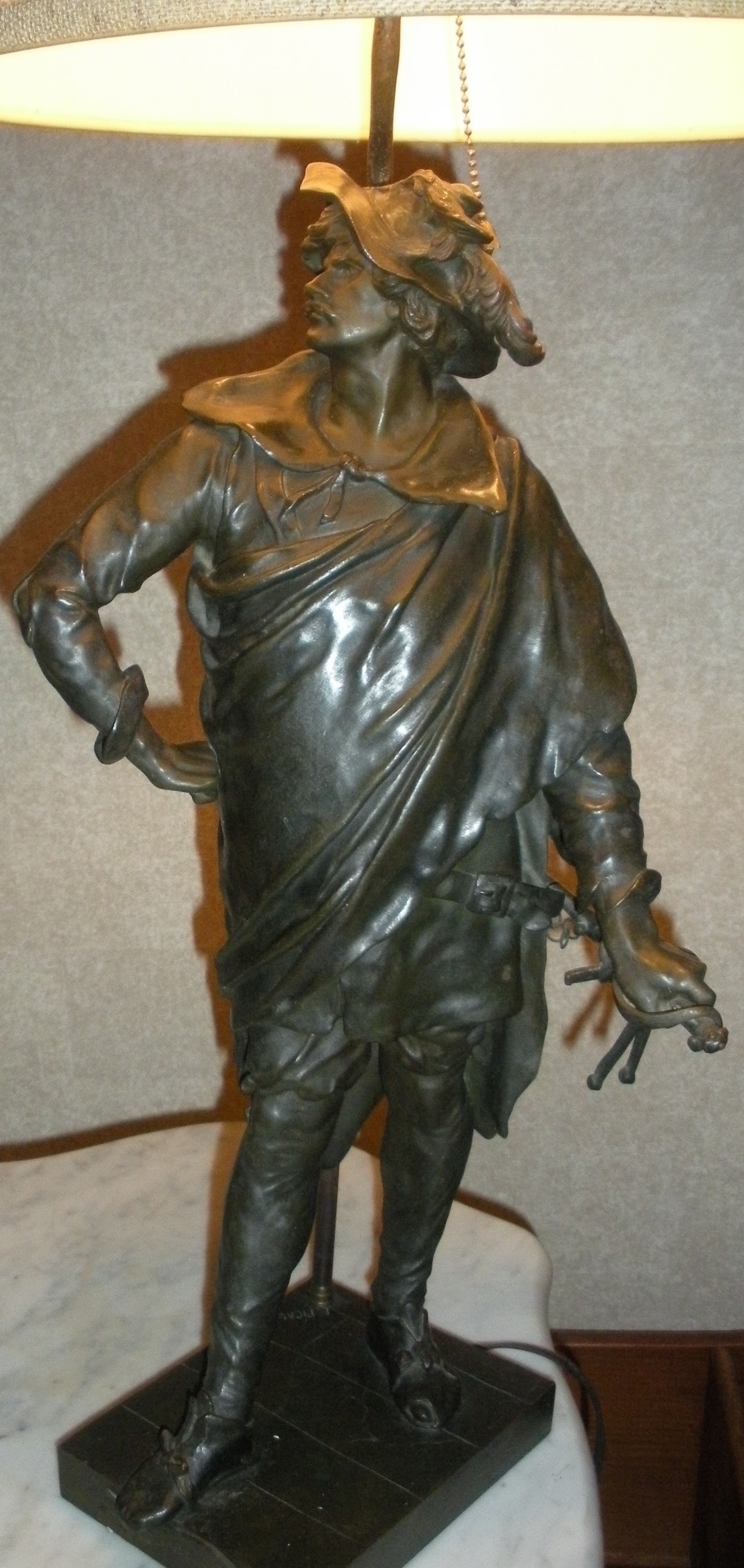 This item was owned by my great aunt who just passed at the age of 104. I know it has been on our family for over 80 years. I found information regarding the statue named " Chavalier Don Cesar De Bazan" including estimate values. The item that I have is the statue as a lamp. I could not find anything regarding this tyoe of statue made as a lamp and I am not sure if it was converted into a lamp after she purchased it. I am looking for as much information as I can possibly get including the value of the piece today.