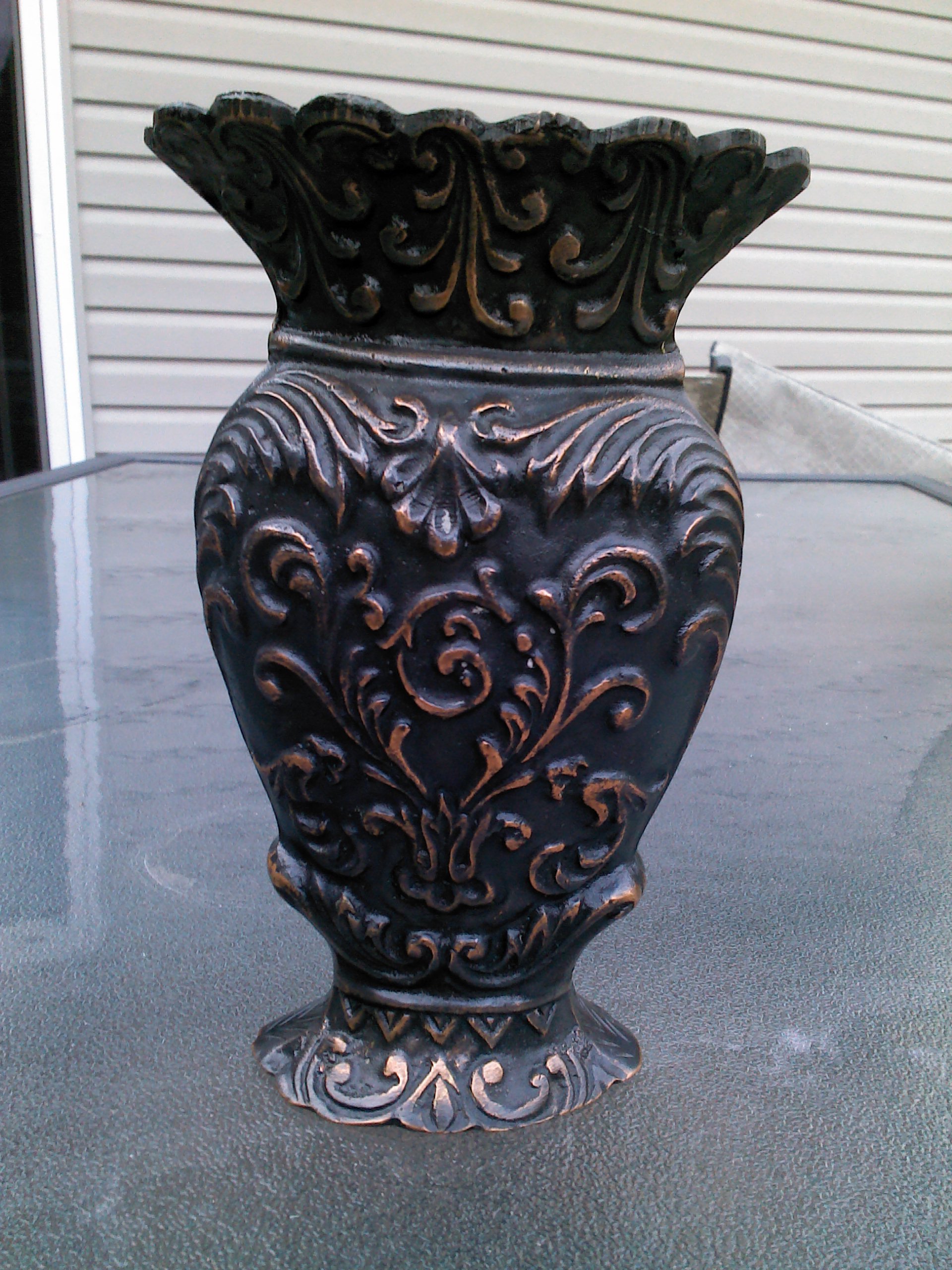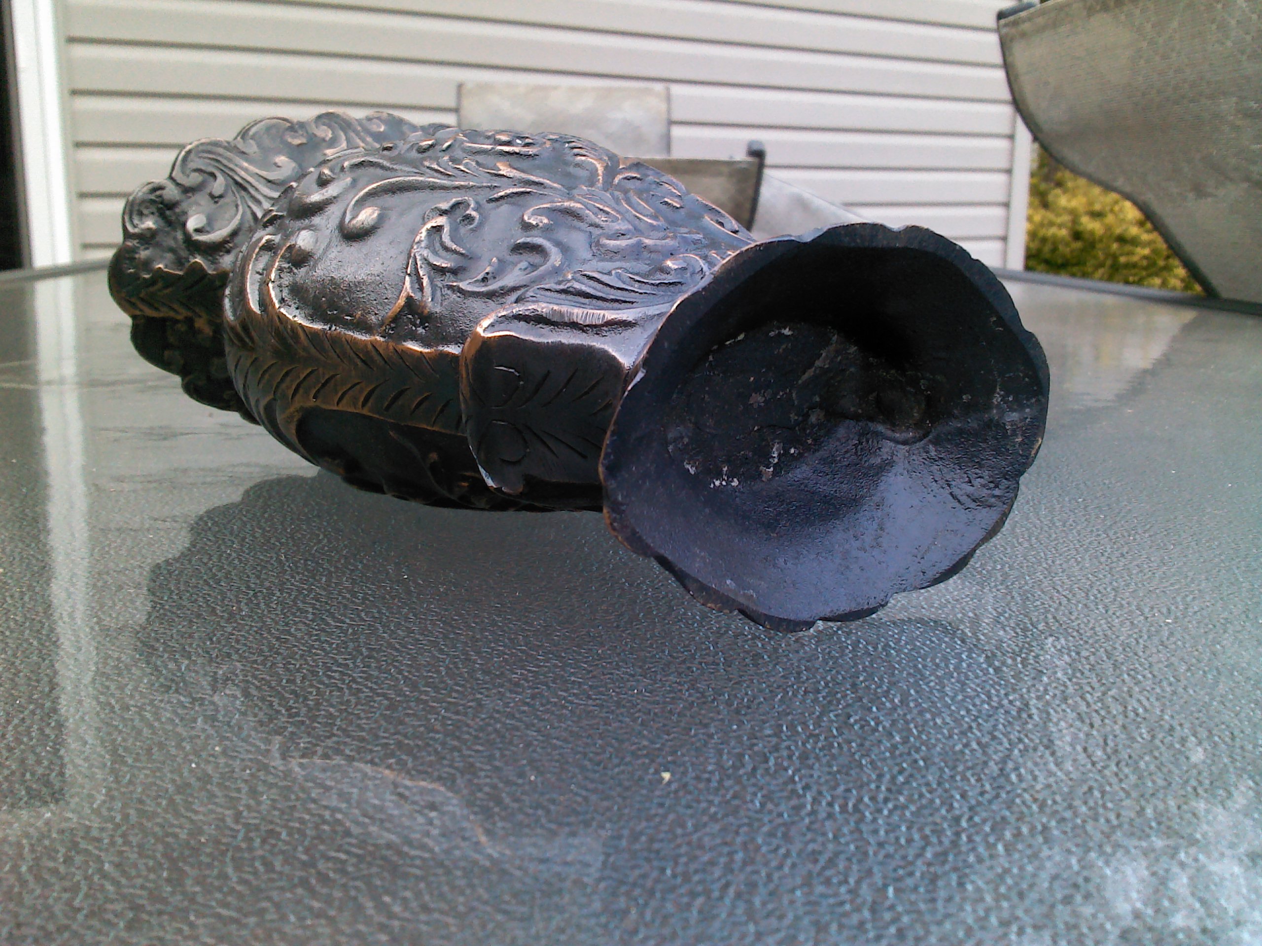 Heavy metal vase, no markings. Measures approx 7.5" by 4.5". Weighs just over 2 lbs.