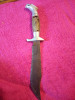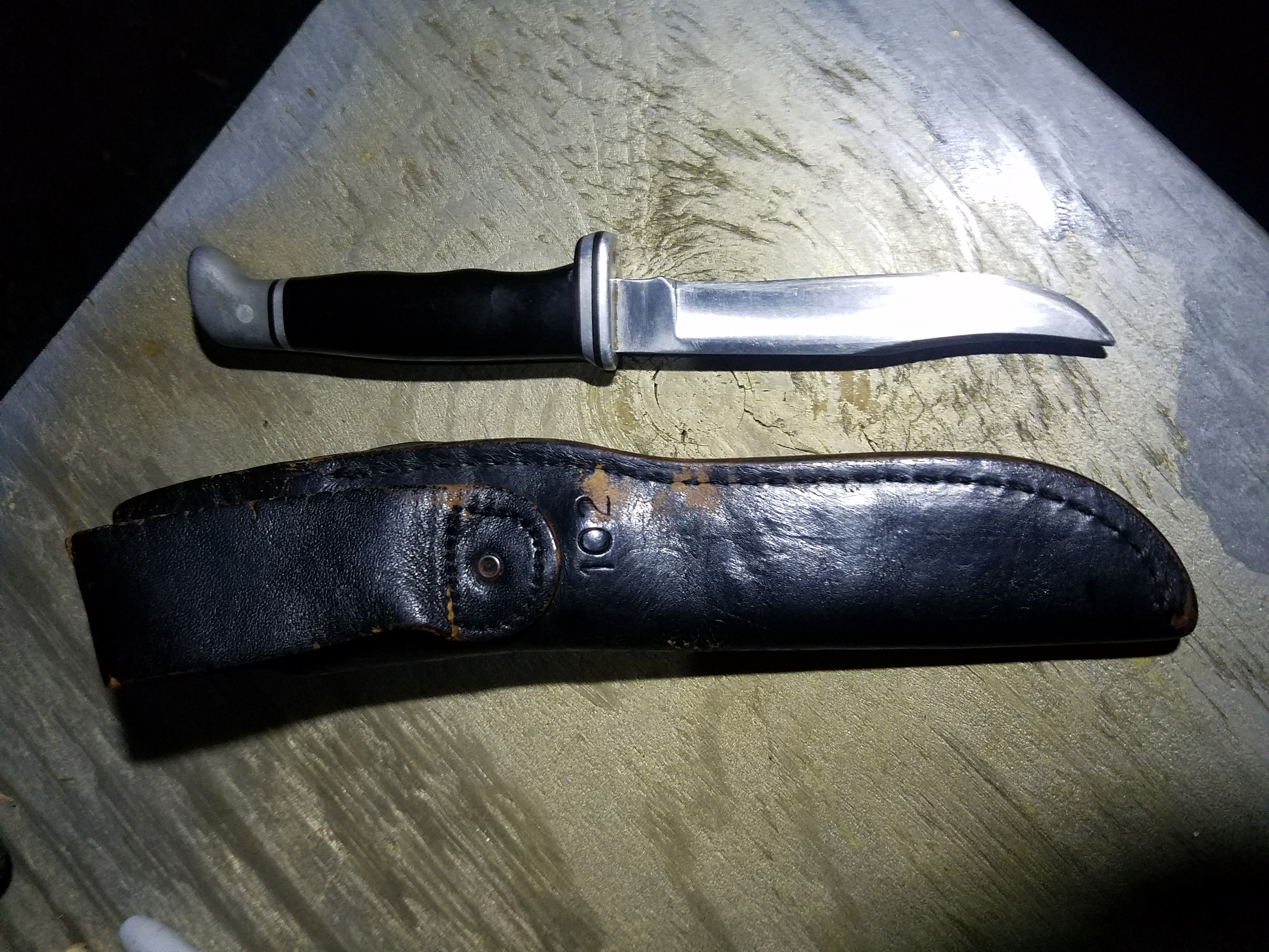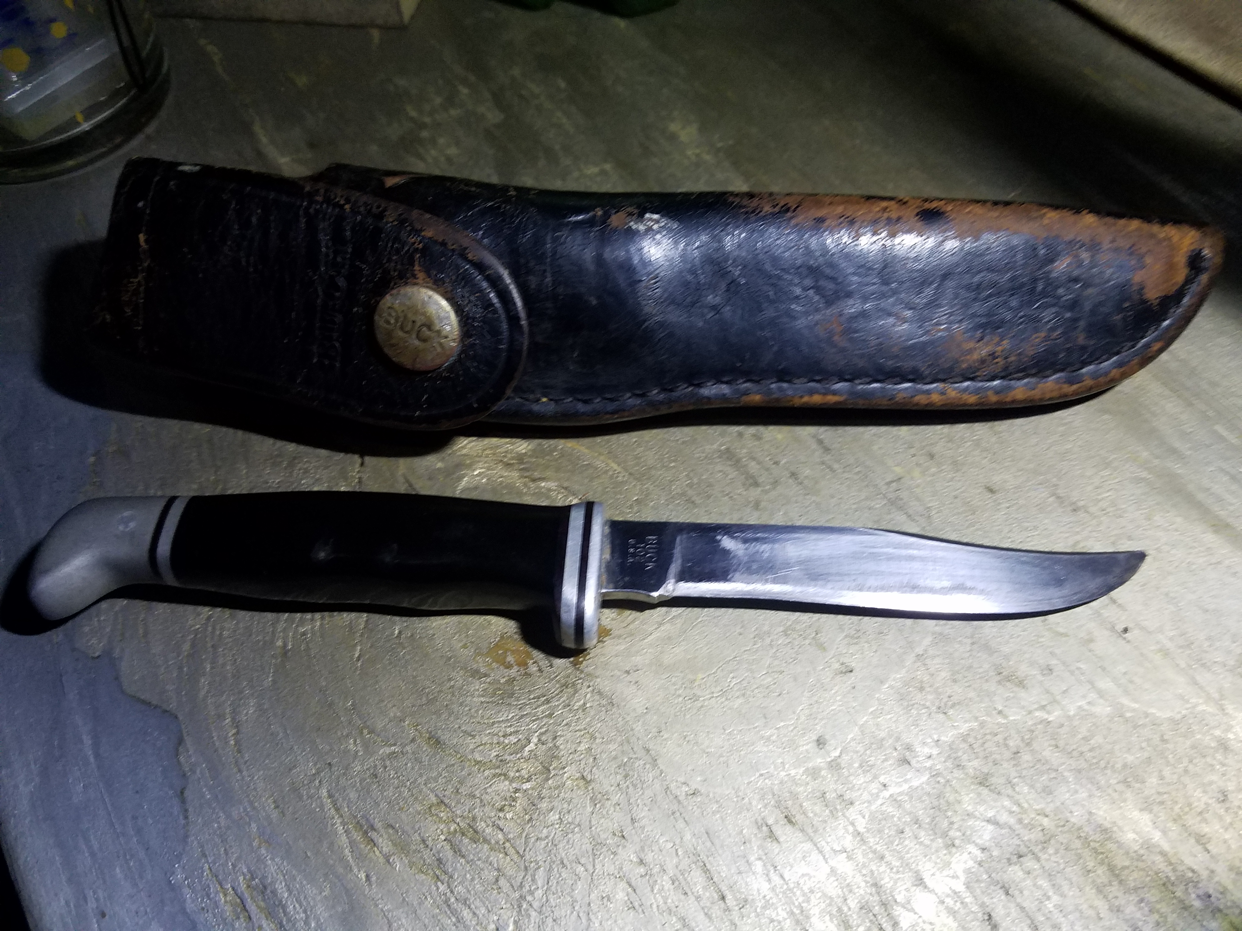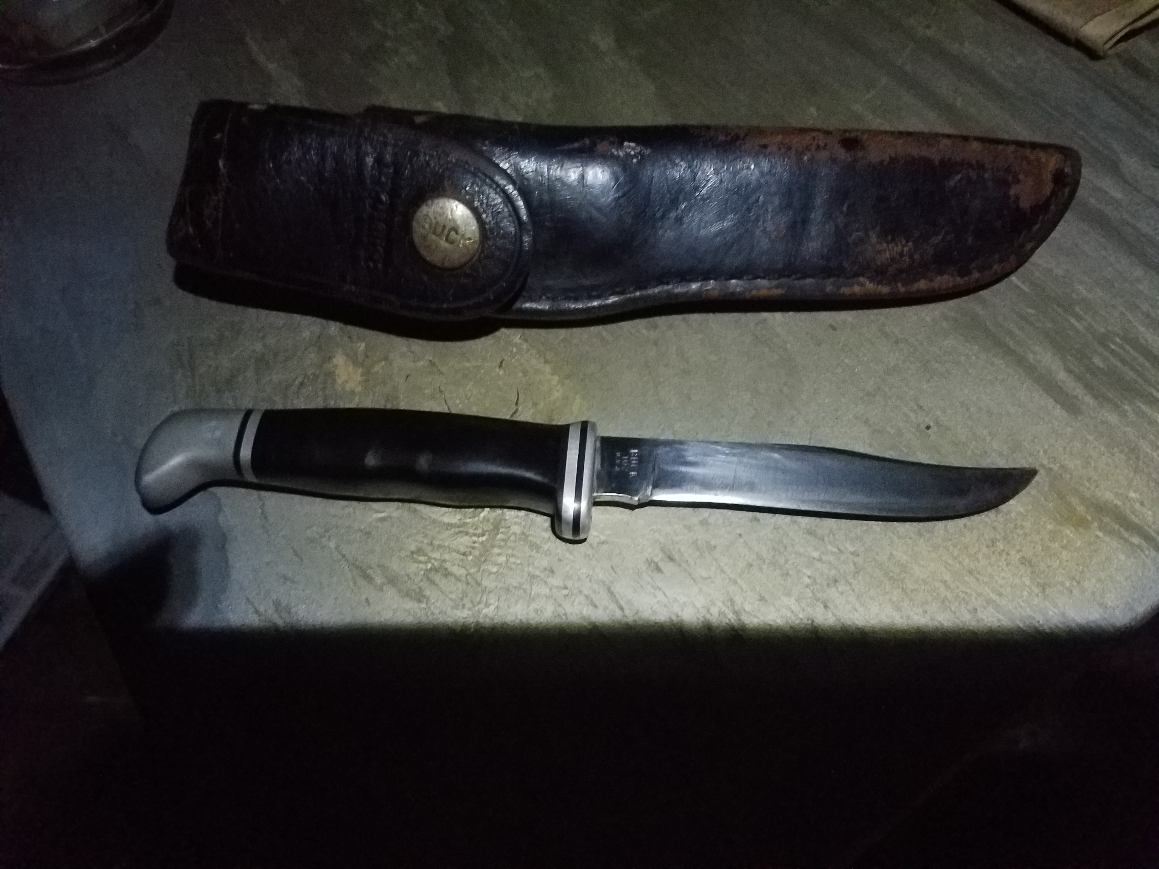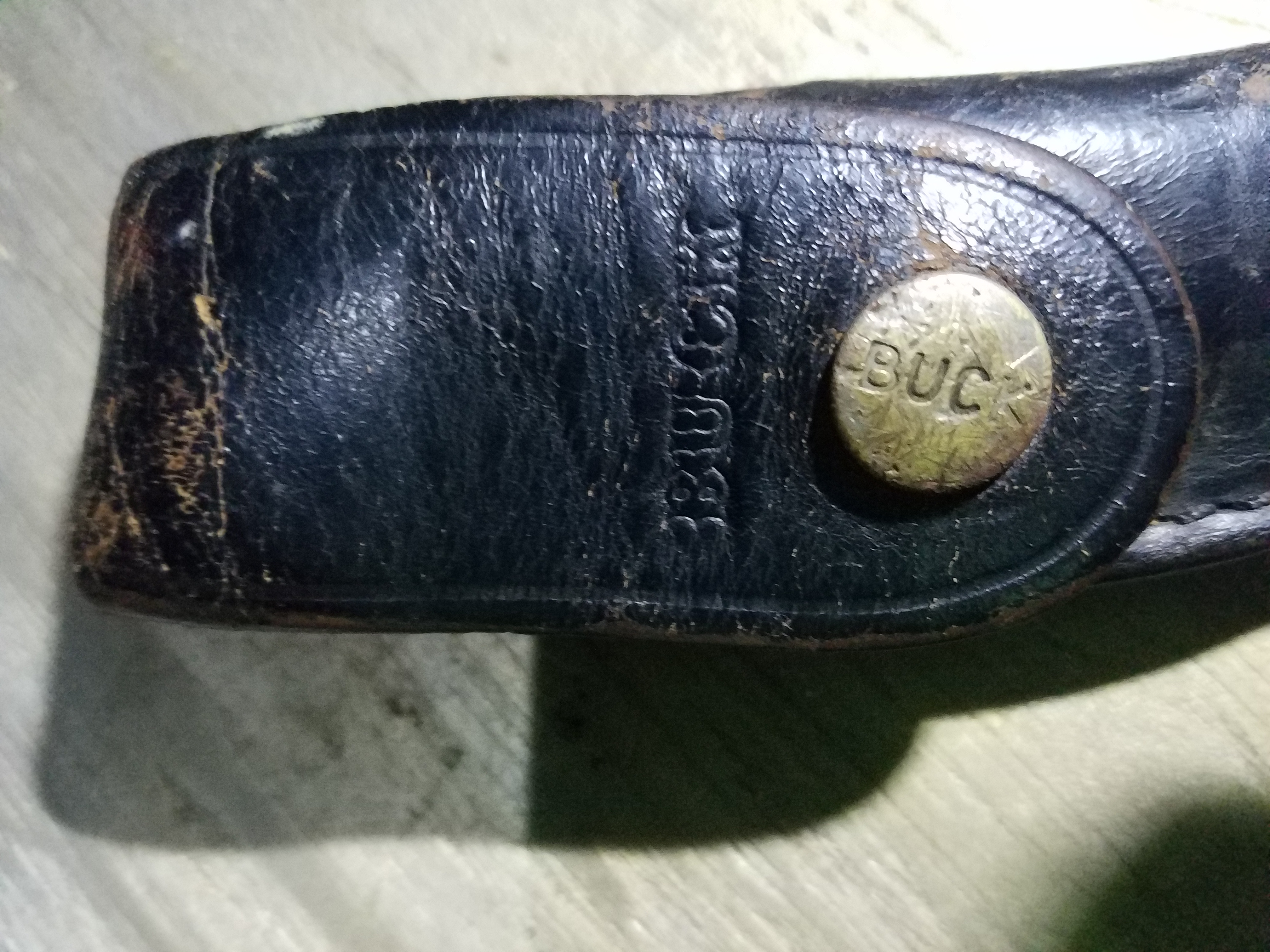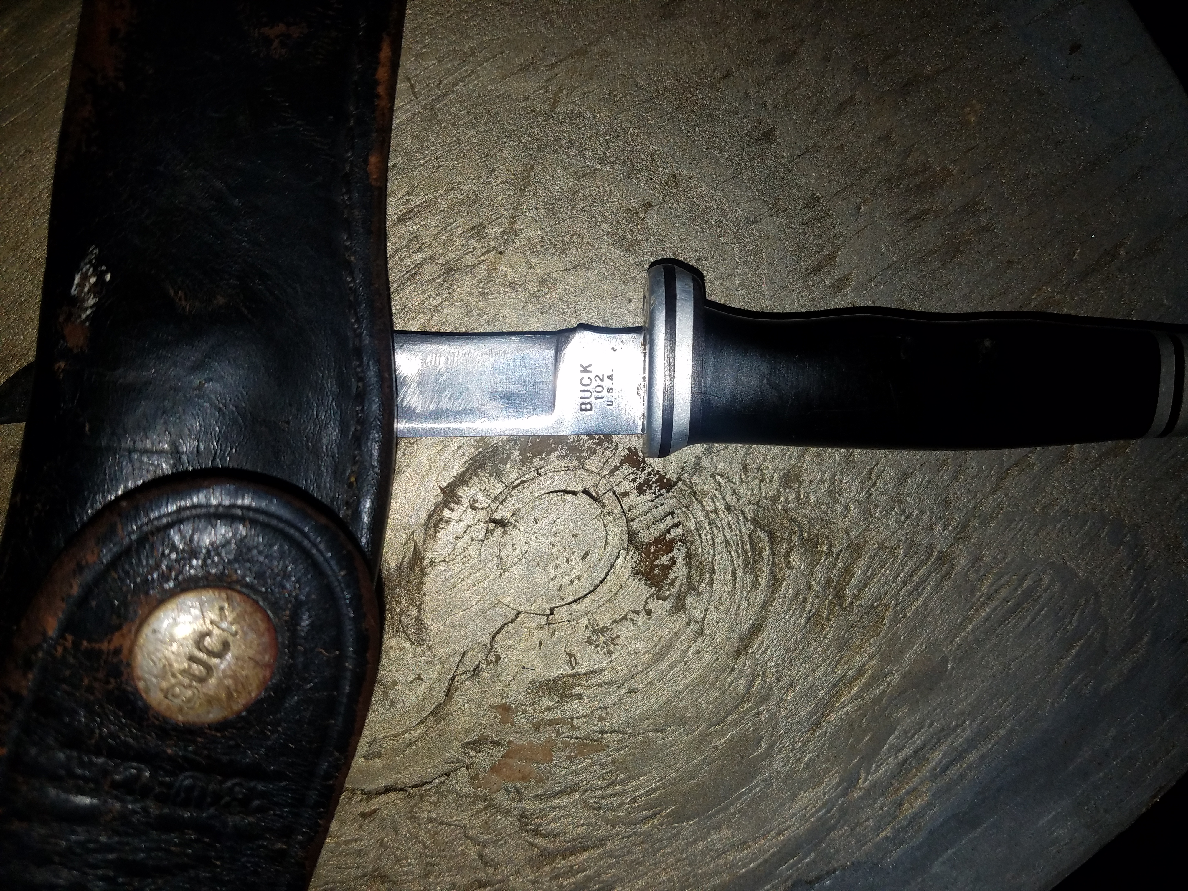 Vintage 1973-1981 Buck Woodsman 102. Made in U.S.A. Predate coding but the 3 line fixed blade indicates time frame. Knife features black phenolic handle with aluminum pommel/guard and 4" clip point 4HC blade. Condition is used/good. Original leather sheath included. Sheath is well worn but in fair condition.