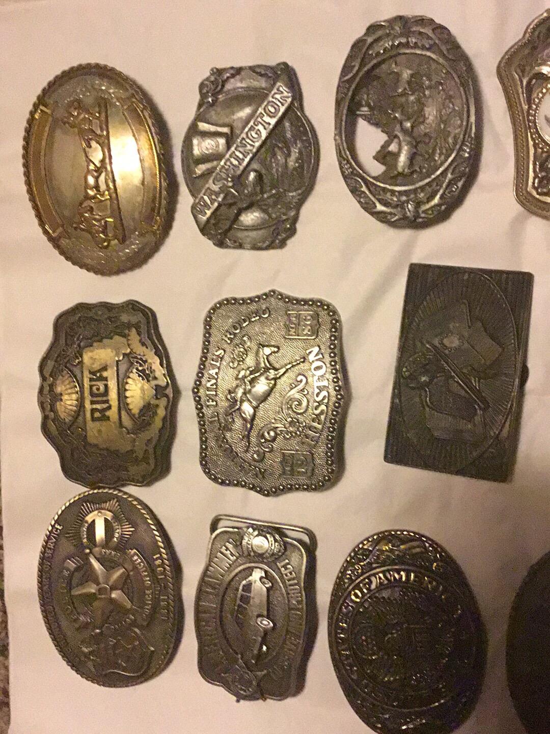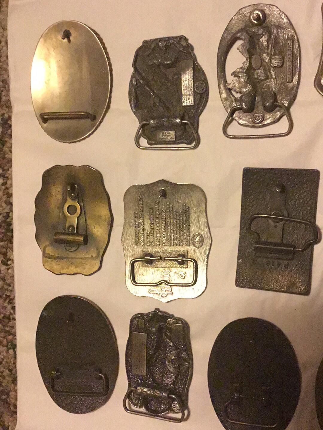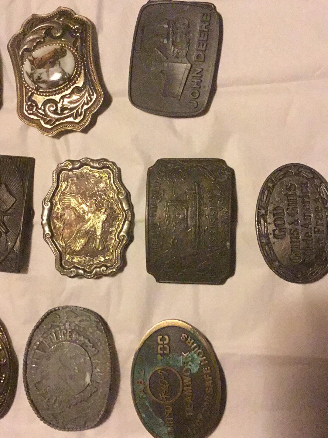 if you put all the markings on each buckle and did each one seperate they would be so much easier to look up . im pertty sure the john deer one is a better one and if the police and lawmen one if they are real they a re worth more than the others also . maybe in the 35 -75$ range . the rest are 10-25$ buckles.