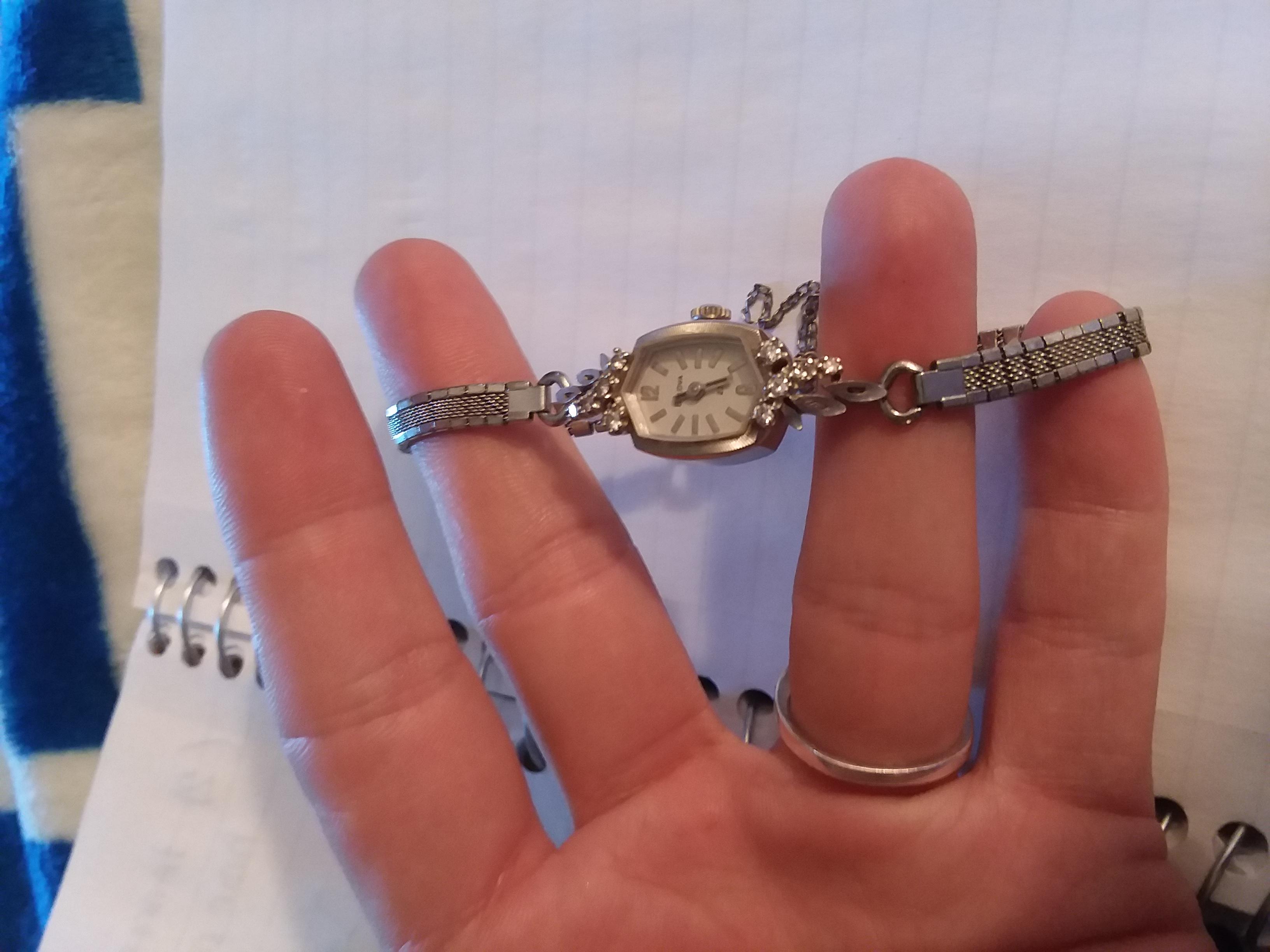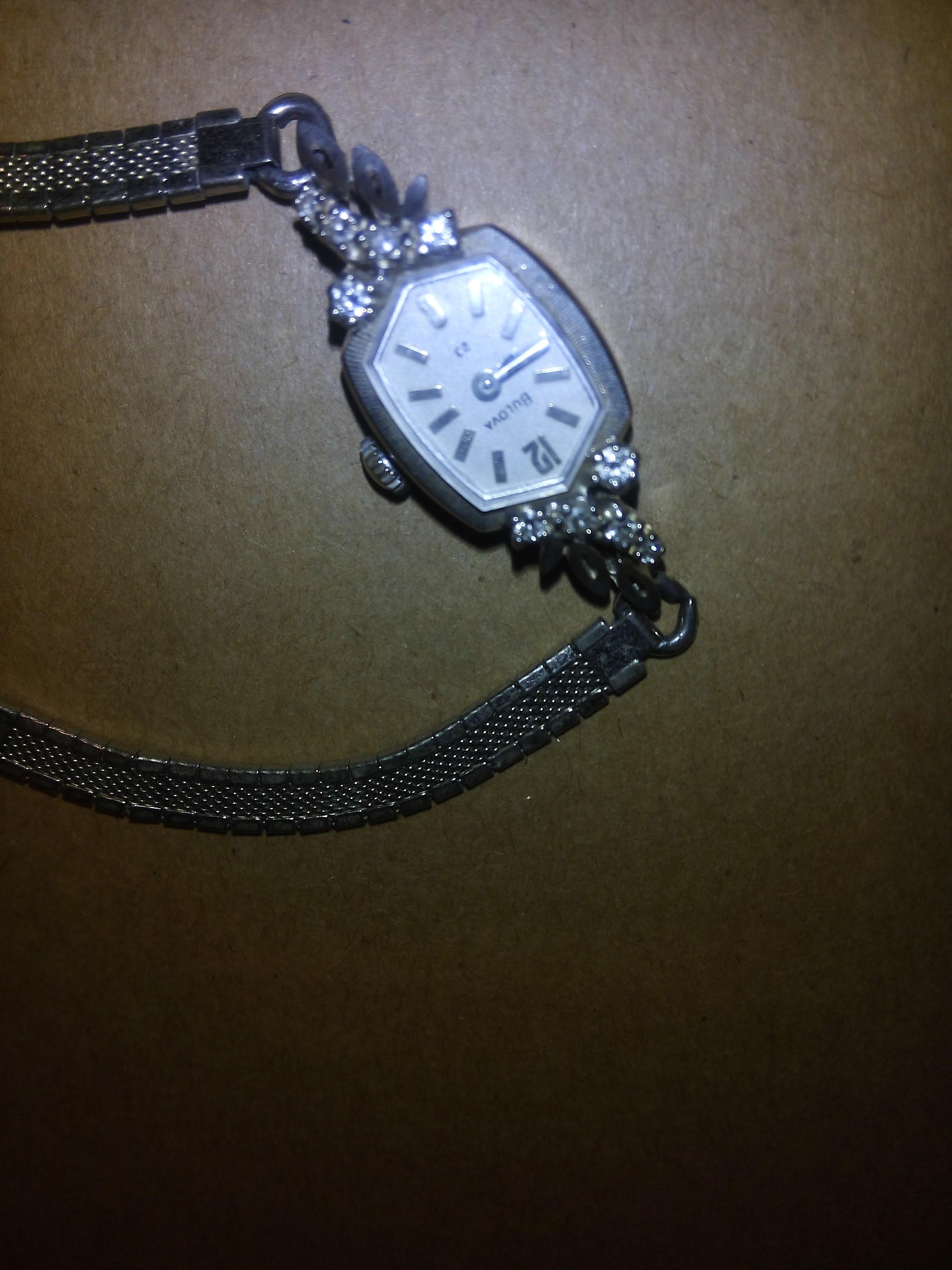 14 k white gold, diamonds, not sure of year I found 2 diff ones from the markings. I had a local watchman look at it and opened it up still no date in back. He said it was in great condition and very nice.