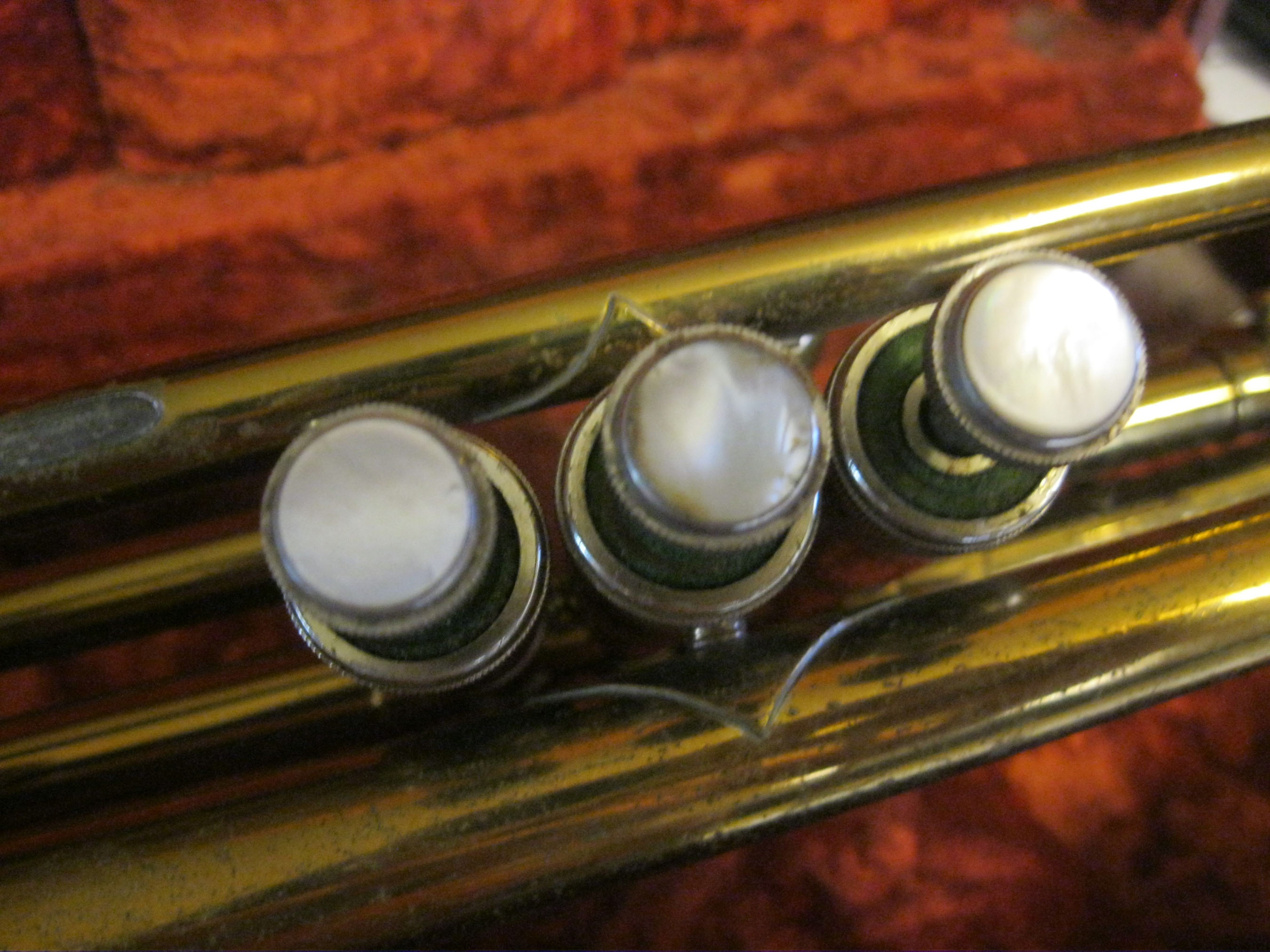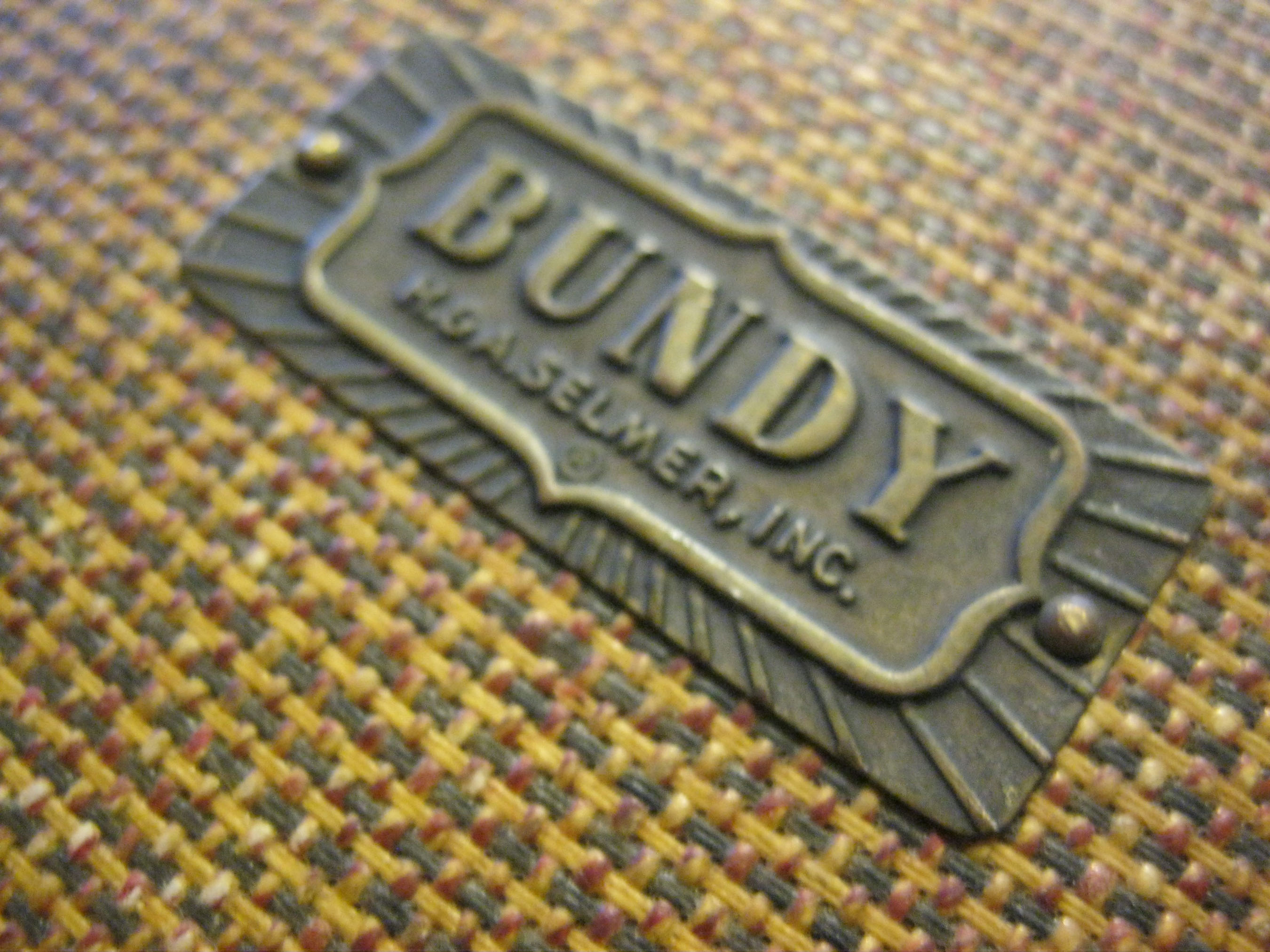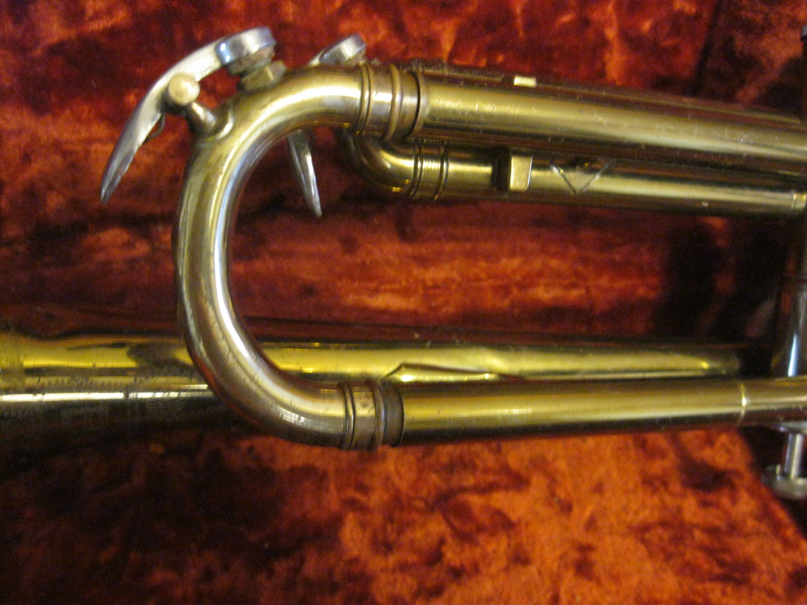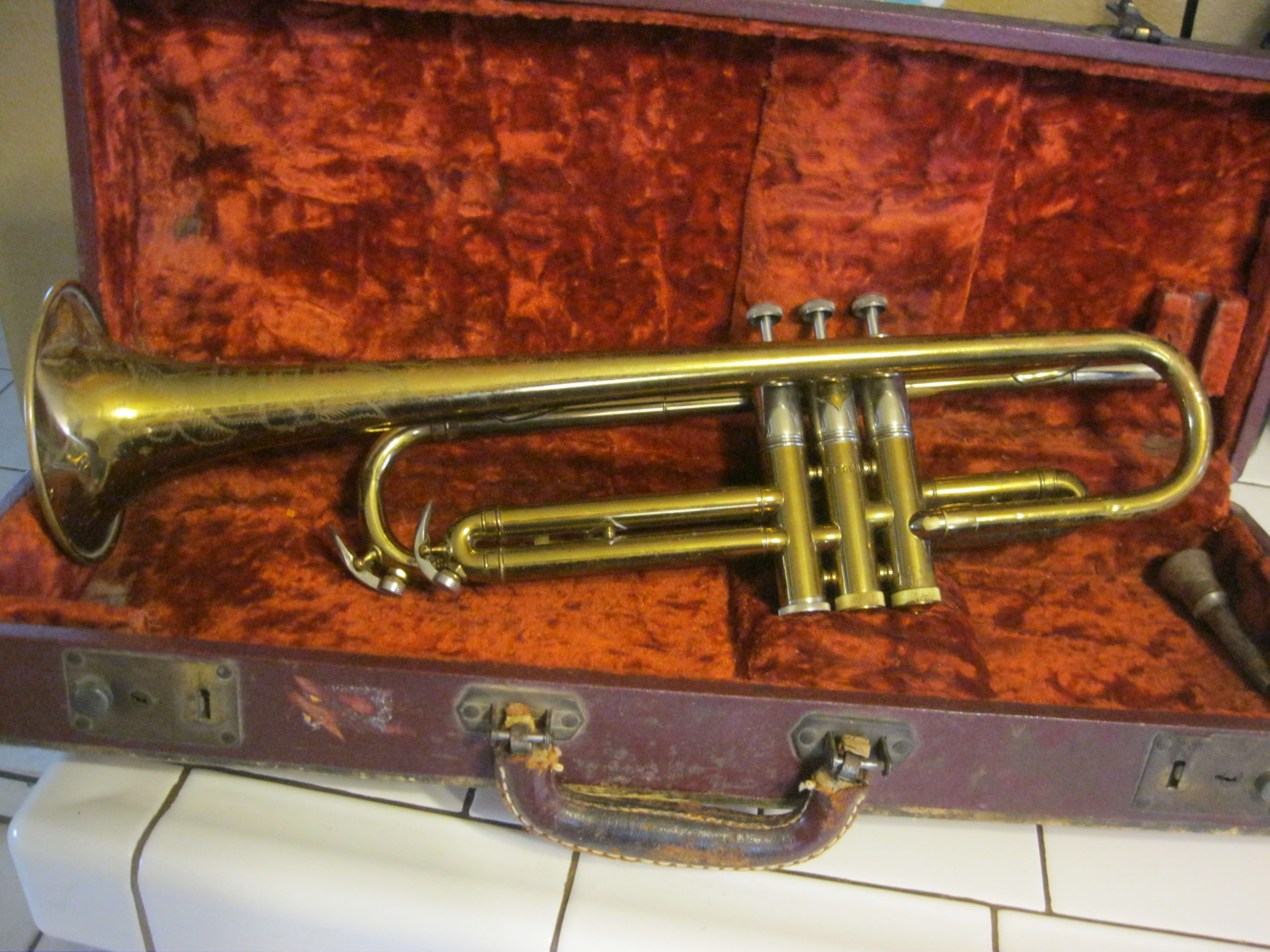 Vintage trumpet in it's original case. Mother of pearl detail on the finger buttons. Engraved on the bell with the words "Bundy", then underneath "H. & A. Selmer, Inc , Elkhart Ind.". Model number is 32998 is on one of the valves. Also has some designs engraved around the writing. Well used! In original case, lined with red crushed velvet. Mouthpiece, marked "Selmer" included. Case has a metal plaque on the outside that says "Bundy". As I said before, this trumpet has been well used, and there are dents around the bell.