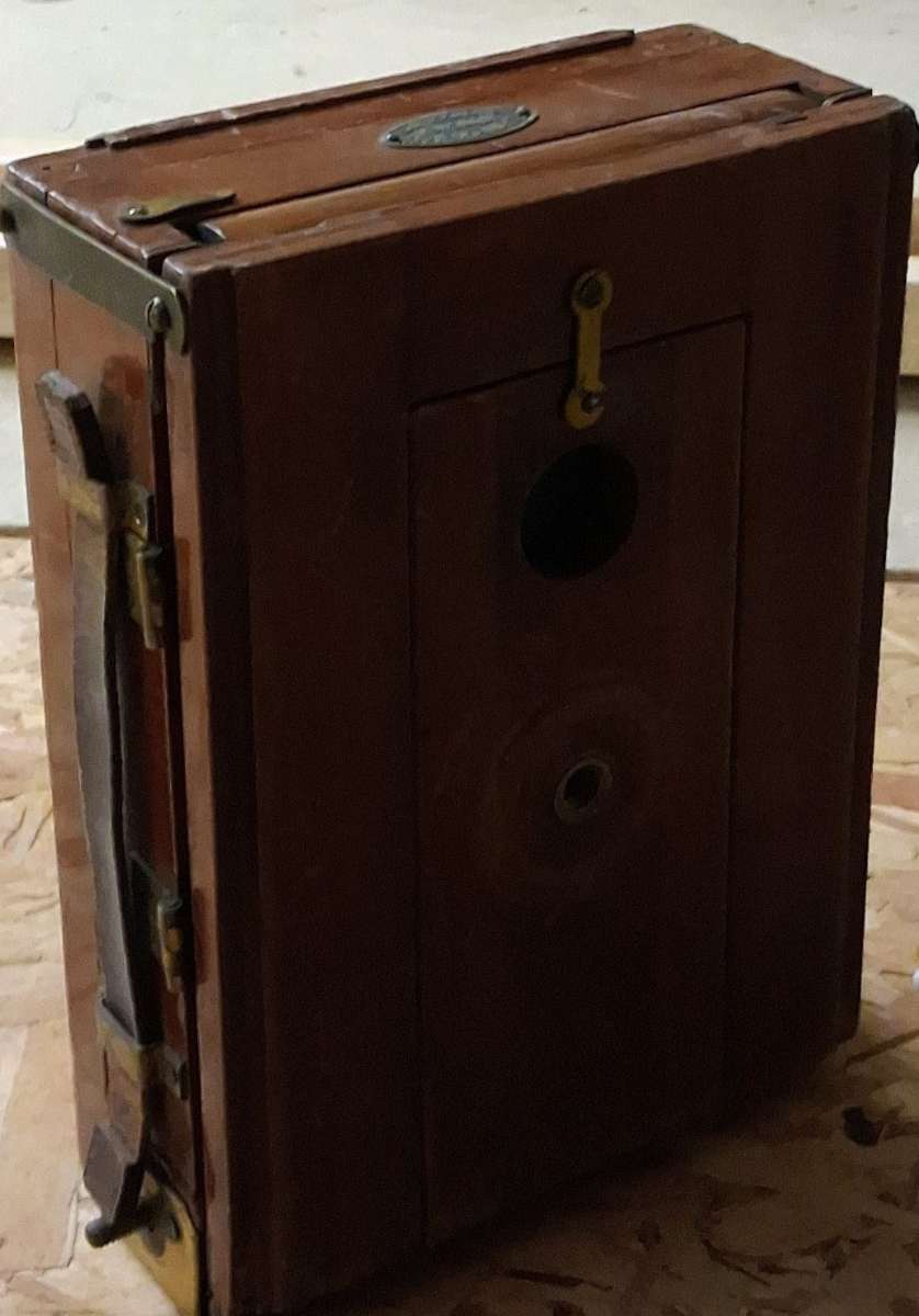 Physical Description: This vintage camera features a wooden body with brass fittings, indicative of late 19th to early 20th-century craftsmanship. The dimensions are approximately 10 inches in height, 8 inches in width, and 5 inches in depth. The front showcases a prominent brass lens mount, and the camera is equipped with a leather strap for portability.