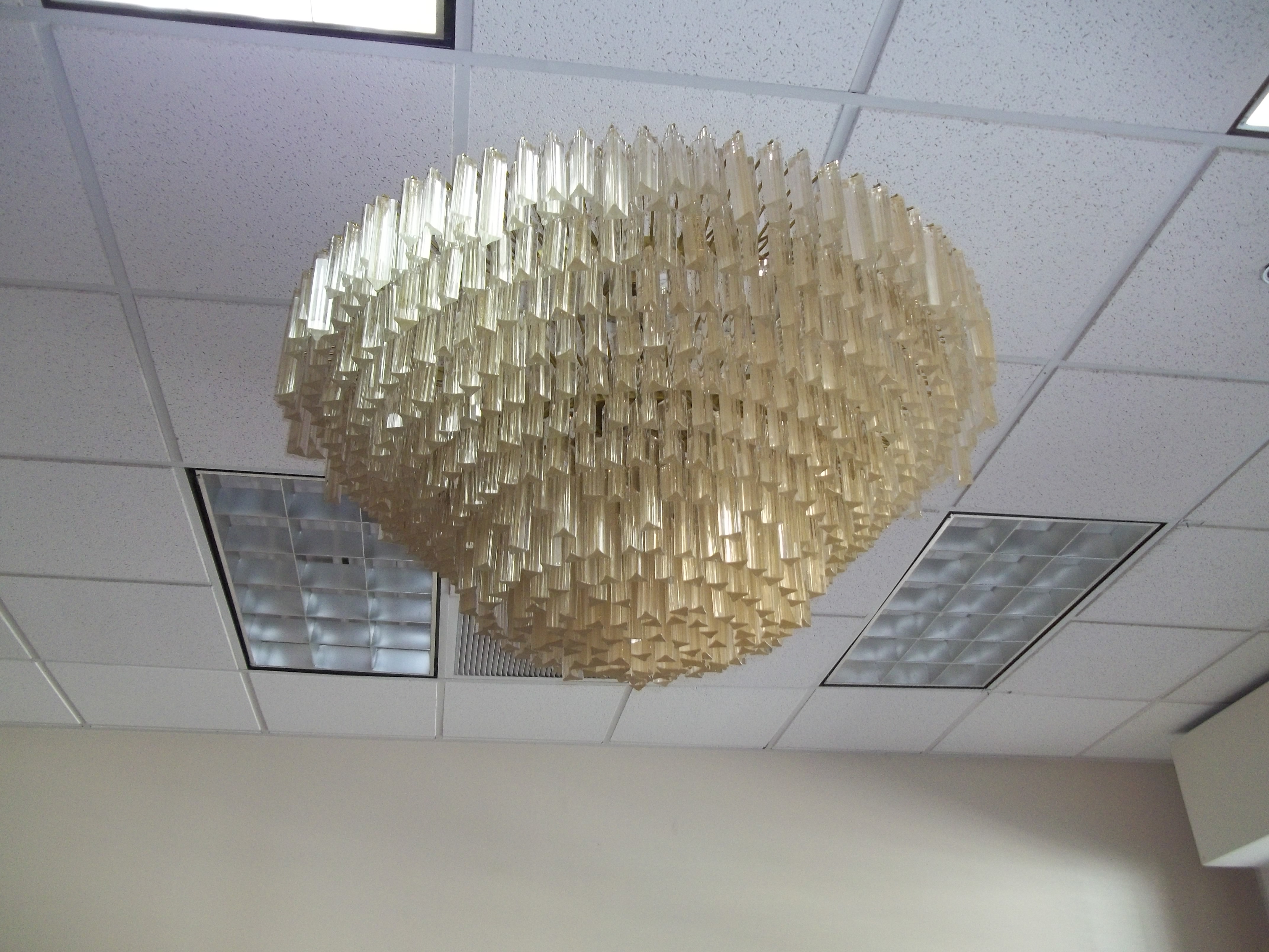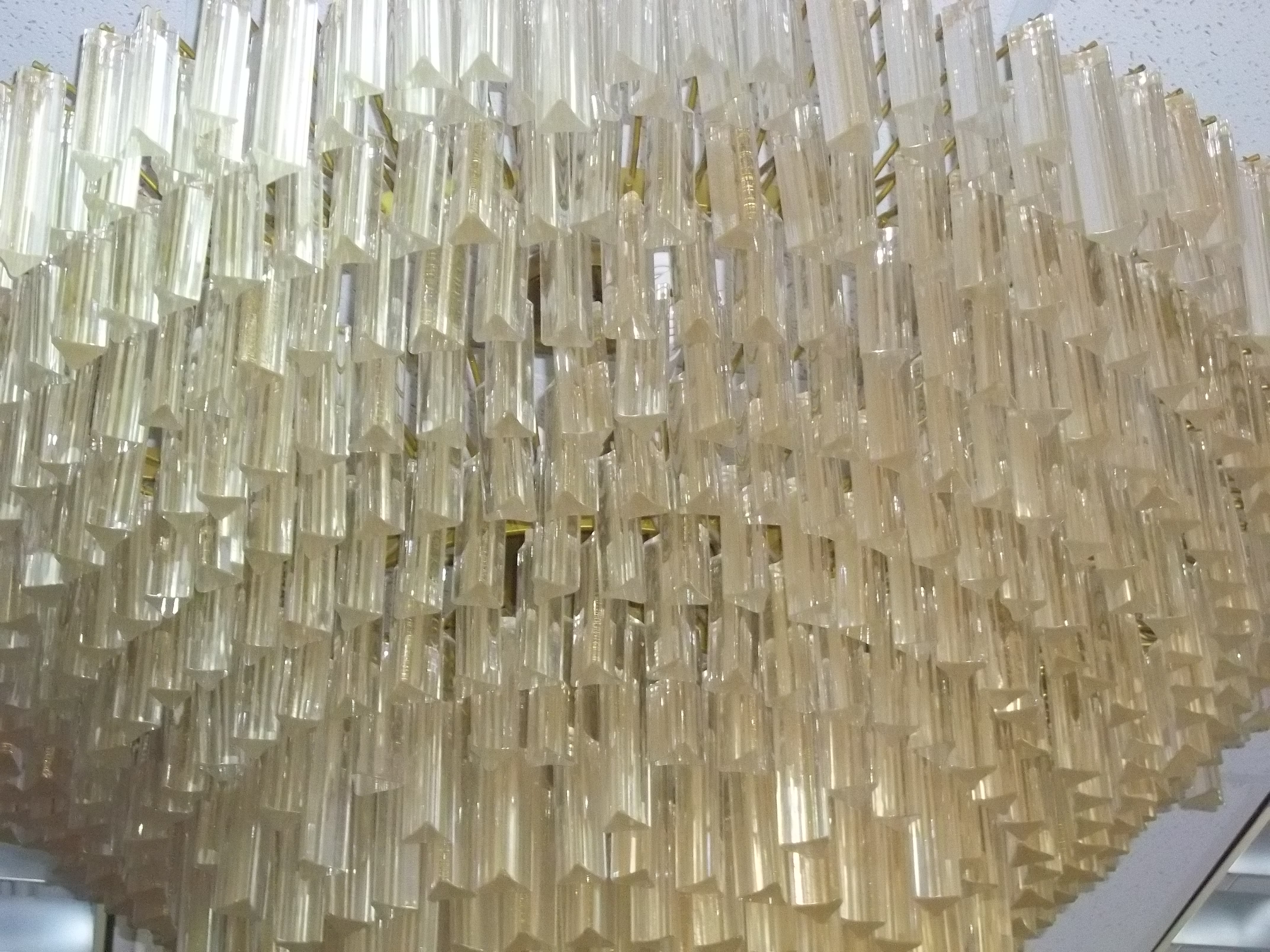This is a midCentury chandelier. It is most likely french style. The crystals are likely Czech or Austrian crystal. Each crystal appears to be infused with gold flakes. The chandelier is massive in style and when lit it is the center of attention.