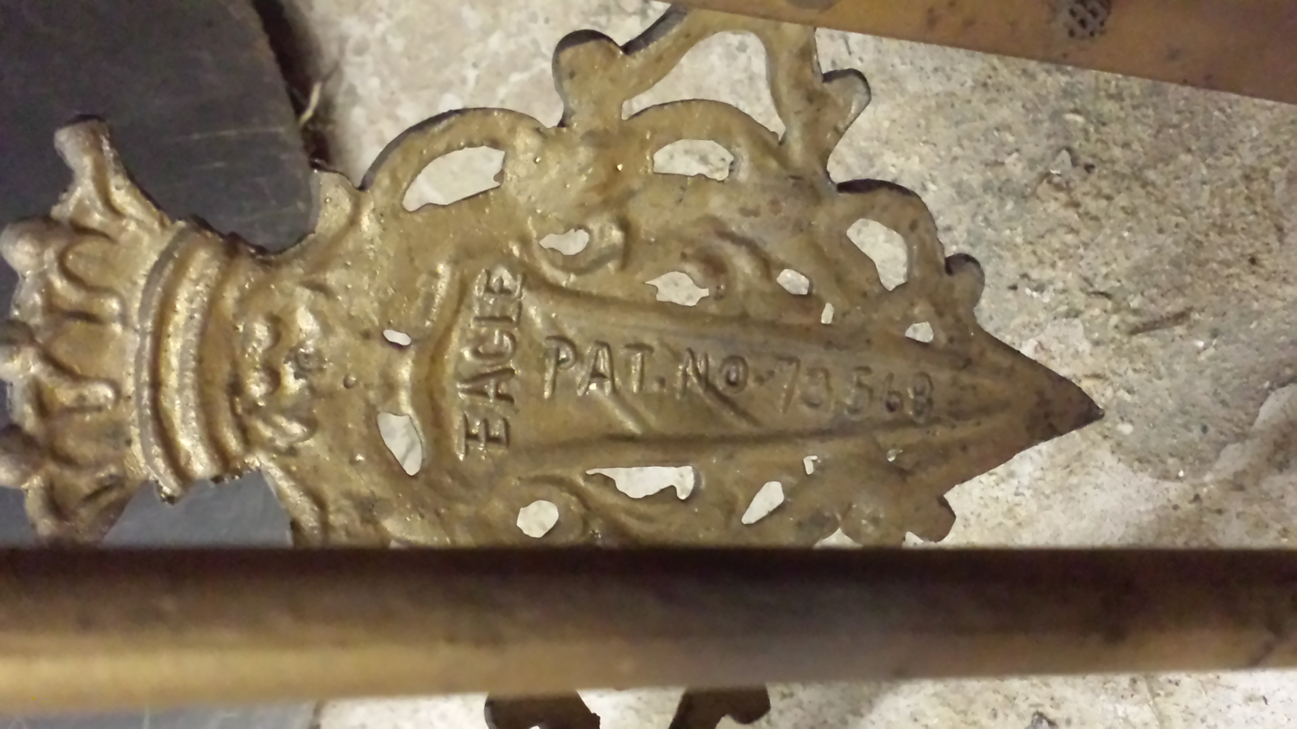 Vintage eagle chandelier patent number on emblem is 73568 number on lamp post is either S005c or 3005C. I researched the patent number and came up with J Horowitz with the patent on emblem in 1927. After a little research on the lamp it seems to be made from wrought iron. I'm interested in learning more about this lamp for I searched for hours and cannot find anything like it.