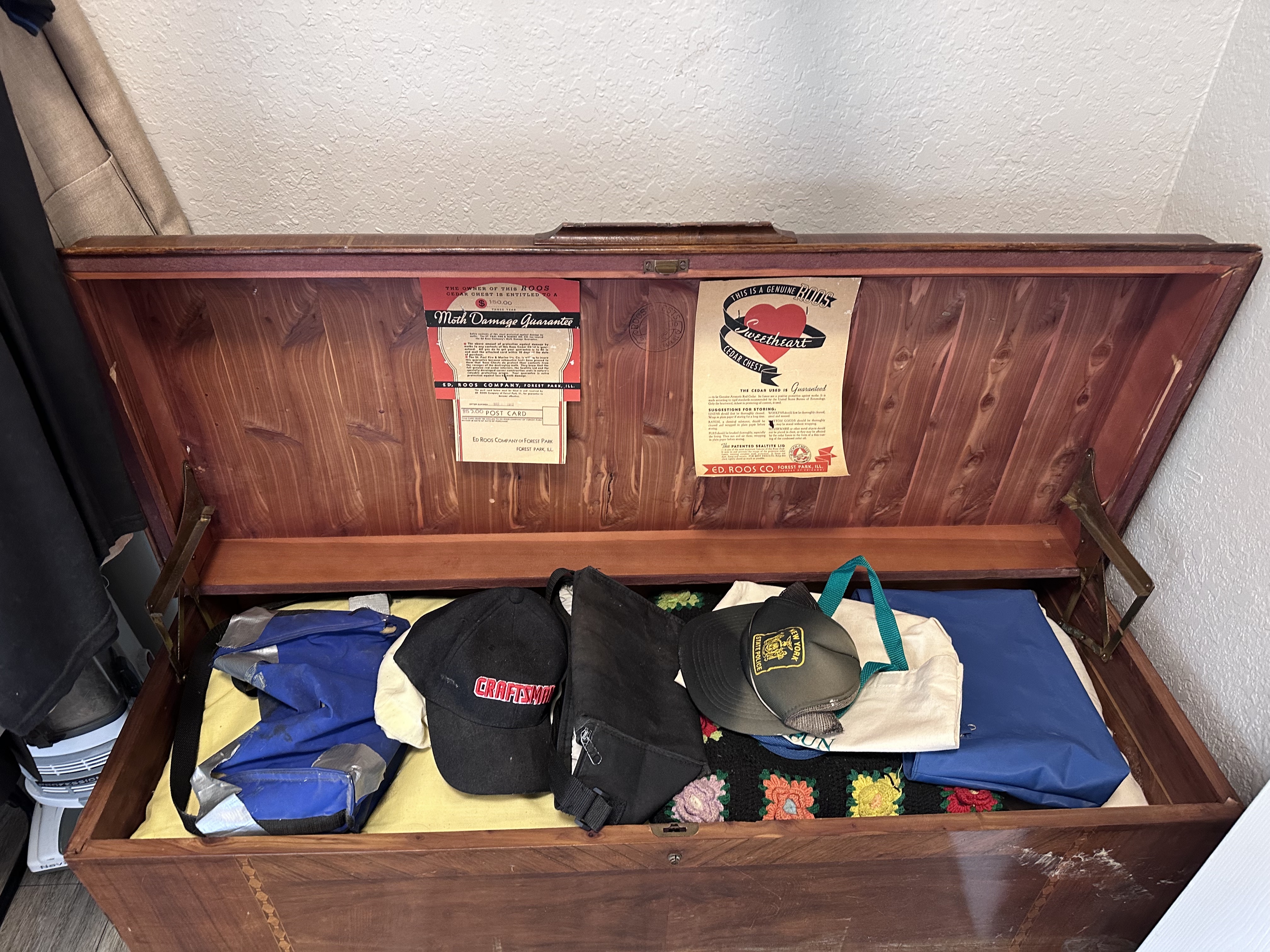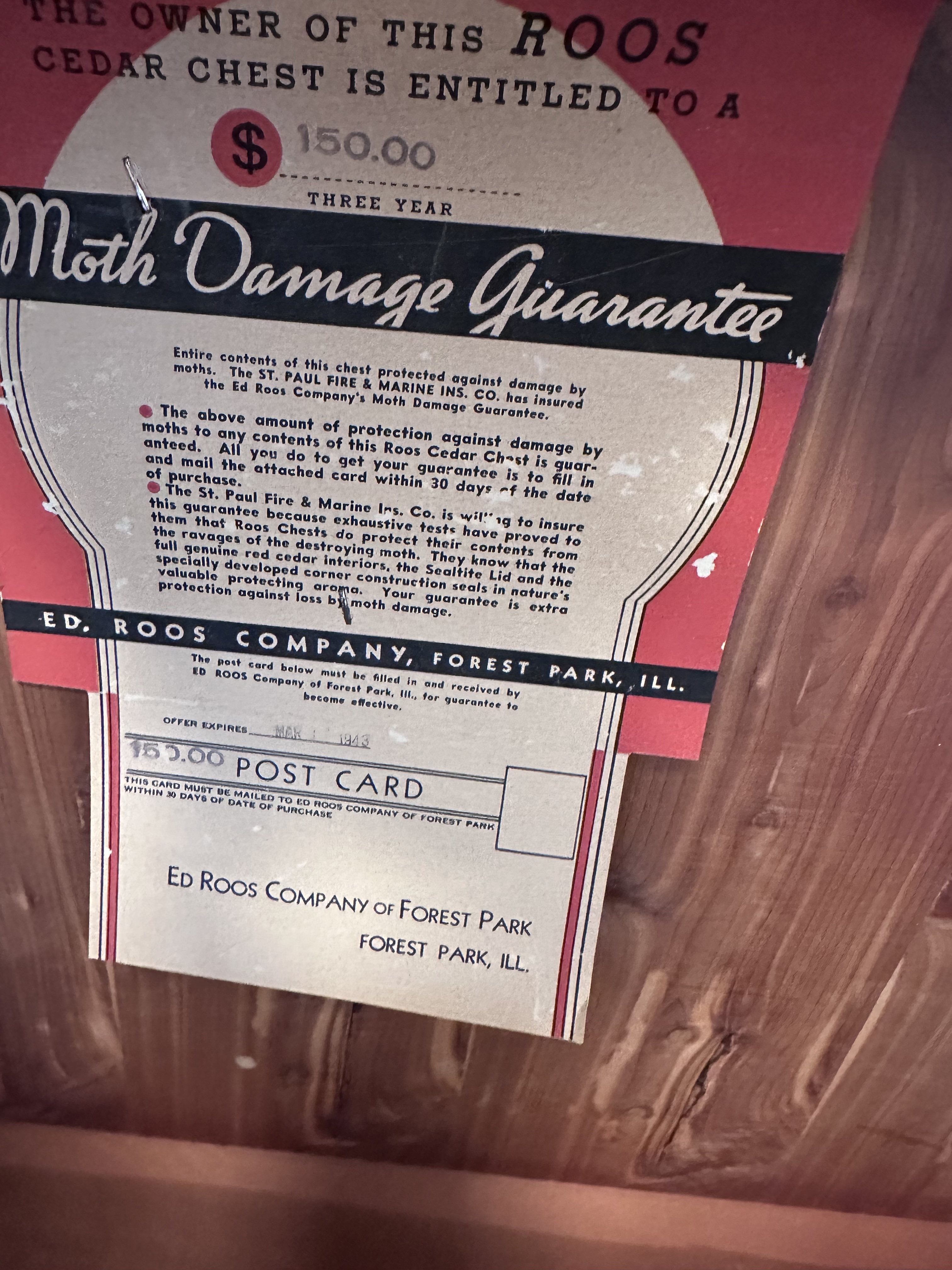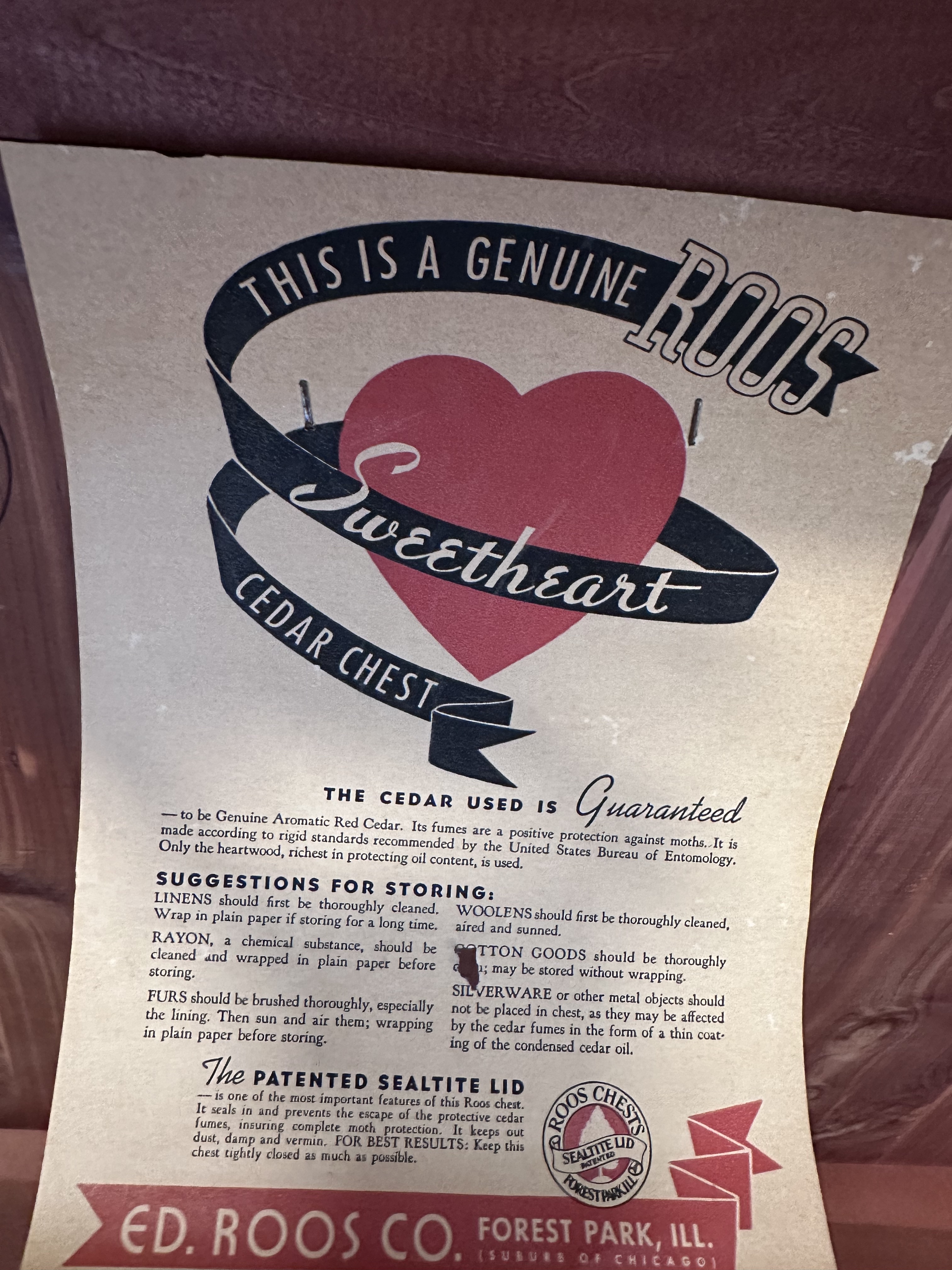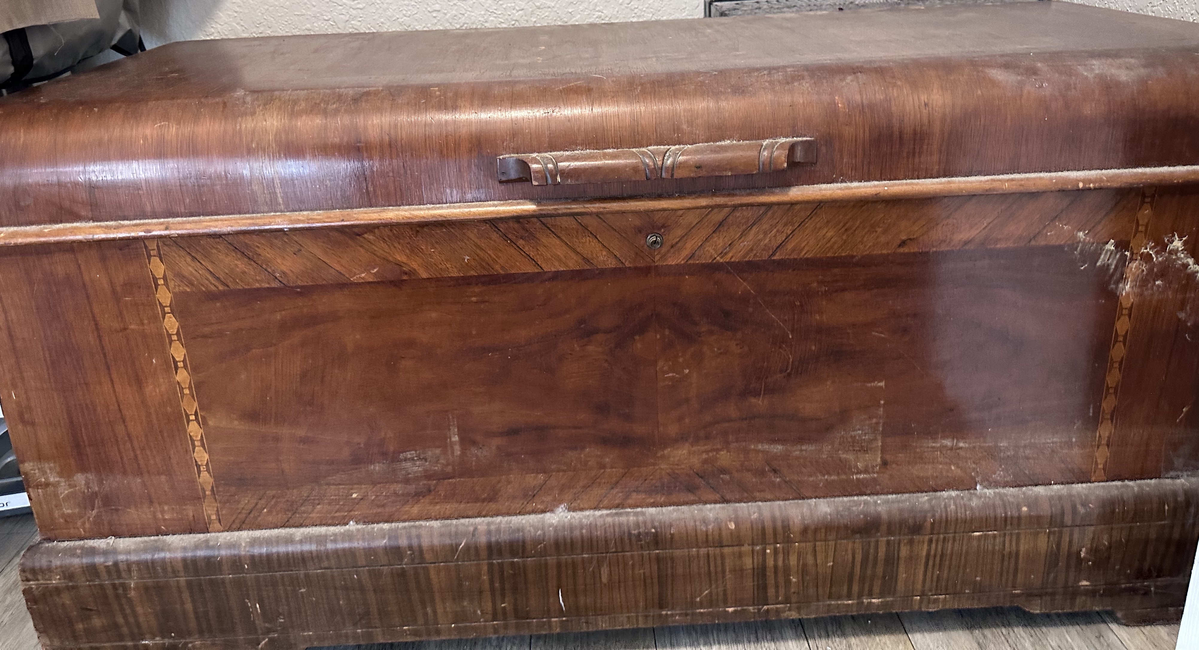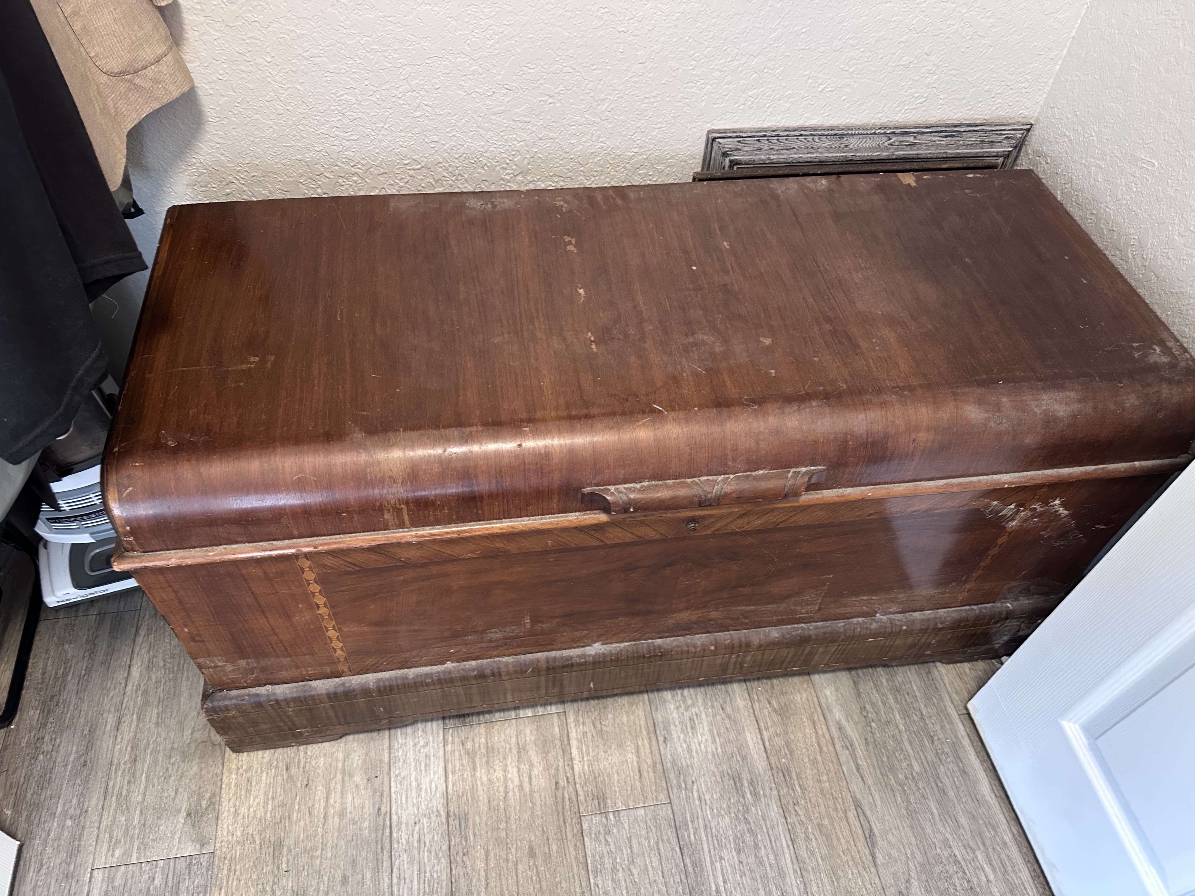 Description wood chest purchase late 1940's or early 1950's. 4'Lx2'Hx1.5'w.