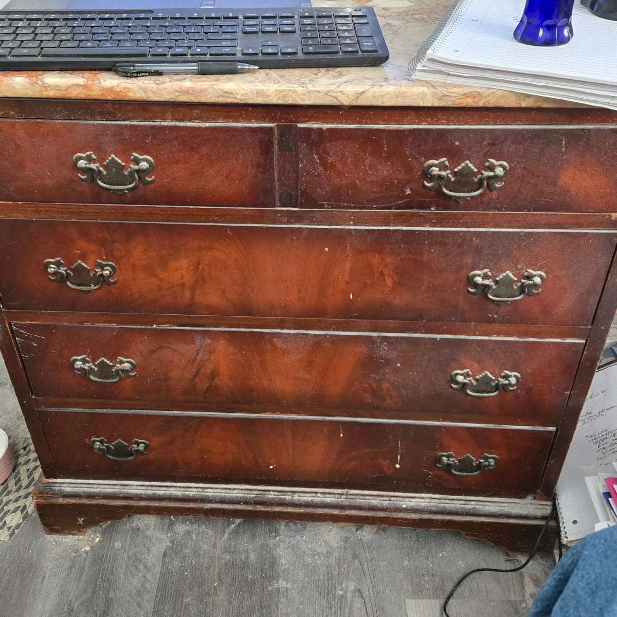 This item appears to be a vintage wooden chest of drawers, likely made from mahogany or a similar hardwood. The piece features a classic design with four drawers, each adorned with decorative metal handles. The top surface is covered with a faux marble laminate, which adds a touch of elegance. The overall dimensions are approximately 36 inches in height, 30 inches in width, and 18 inches in depth, though exact measurements would require confirmation.