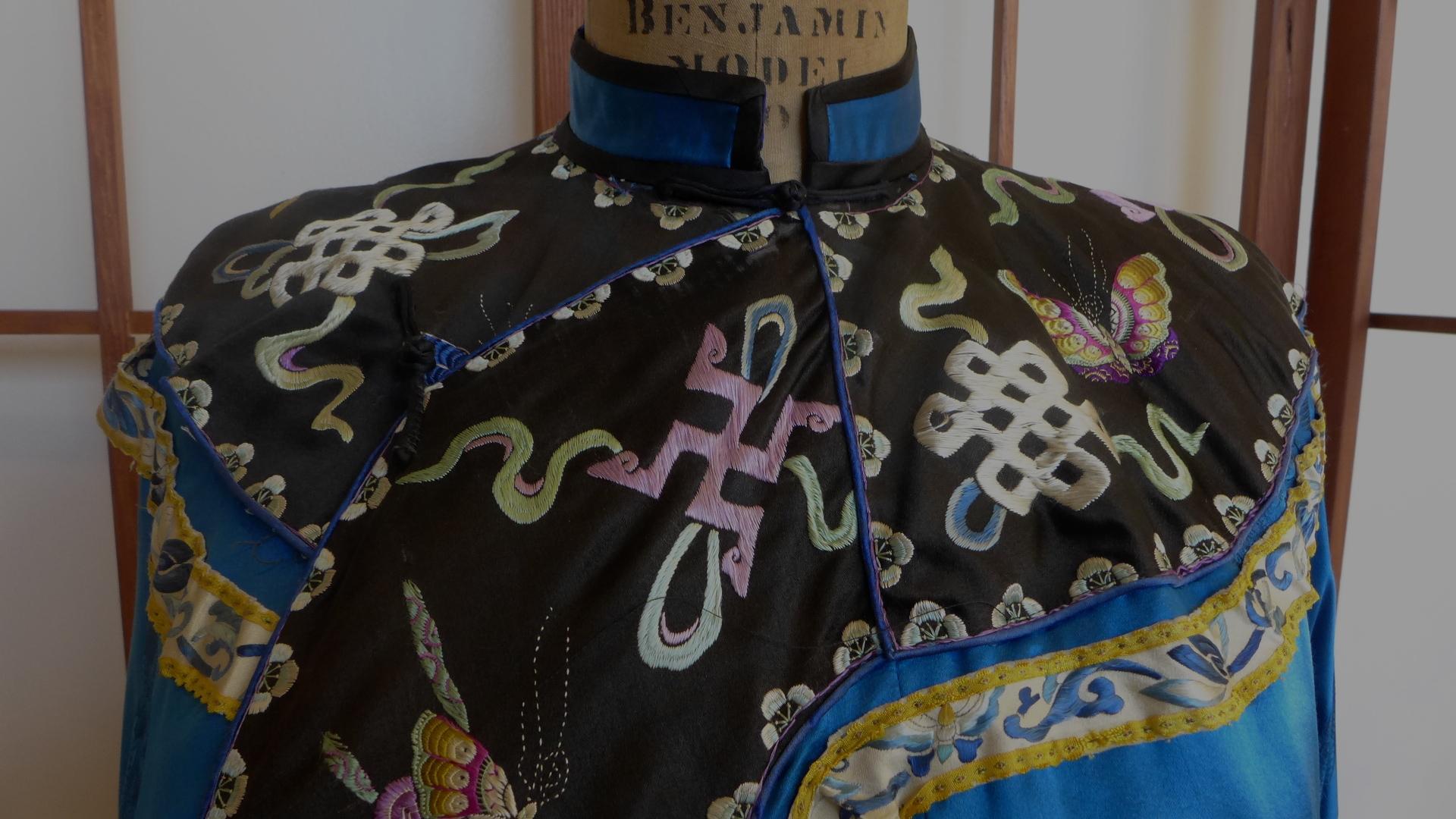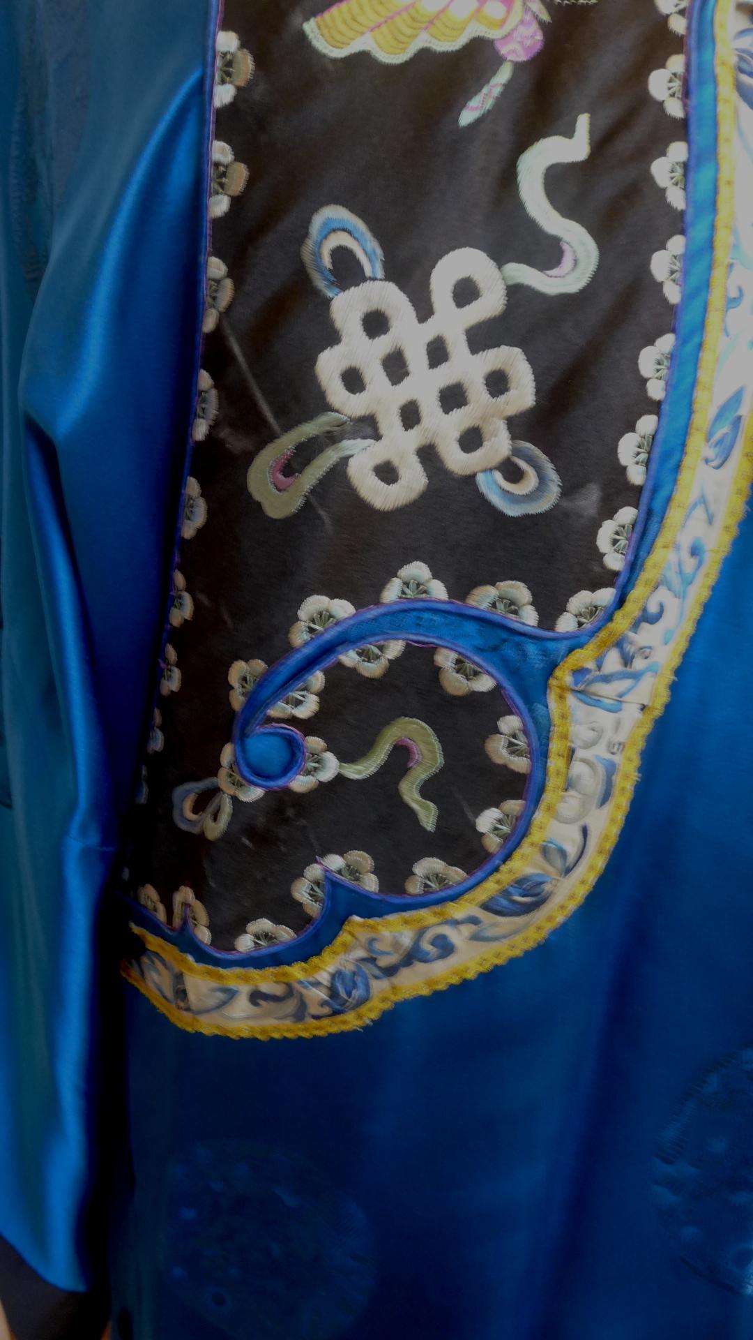 A silk hand embroidered robe of Chinese origin - I'd like to find out more about its age and what it may have been used for - there are several butterflies and a few other symbols I'm not familiar with on the robe - unfortunately the black silk underneath the embroidery is starting to fray but otherwise the rest of the robe is in fine condiiton - need to re-attach some of the ribbon - any information on this piece would be appreciated including approximate value.