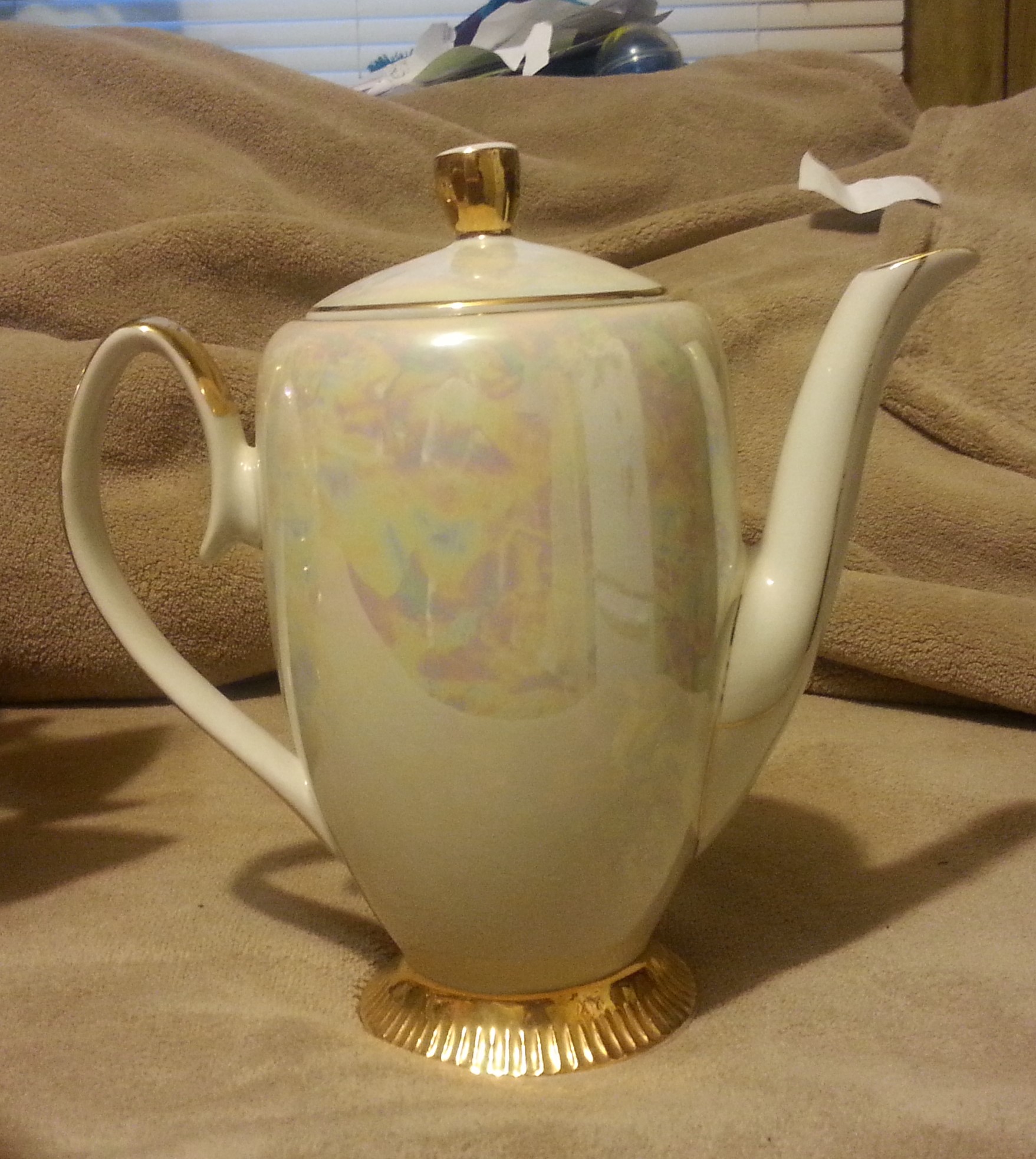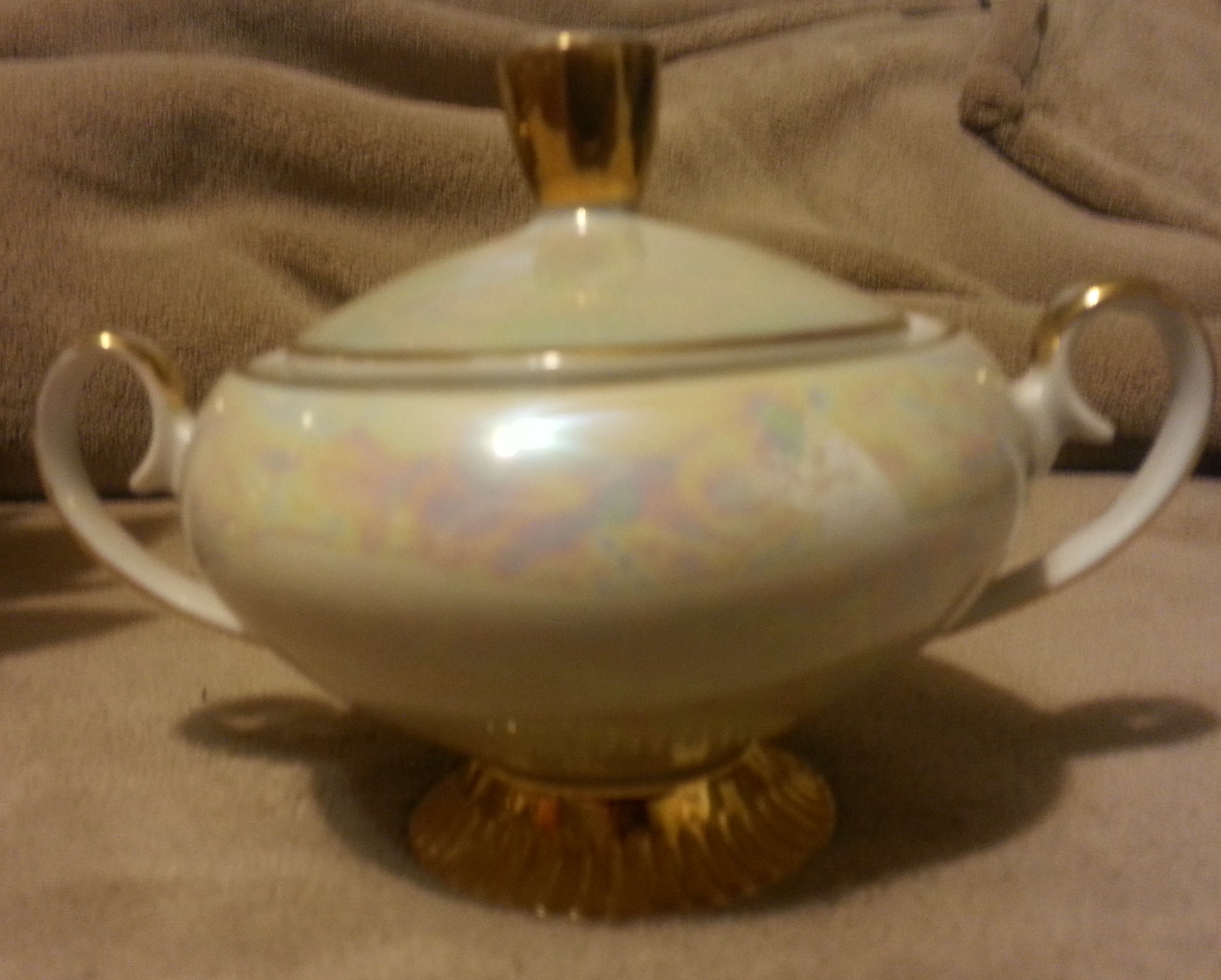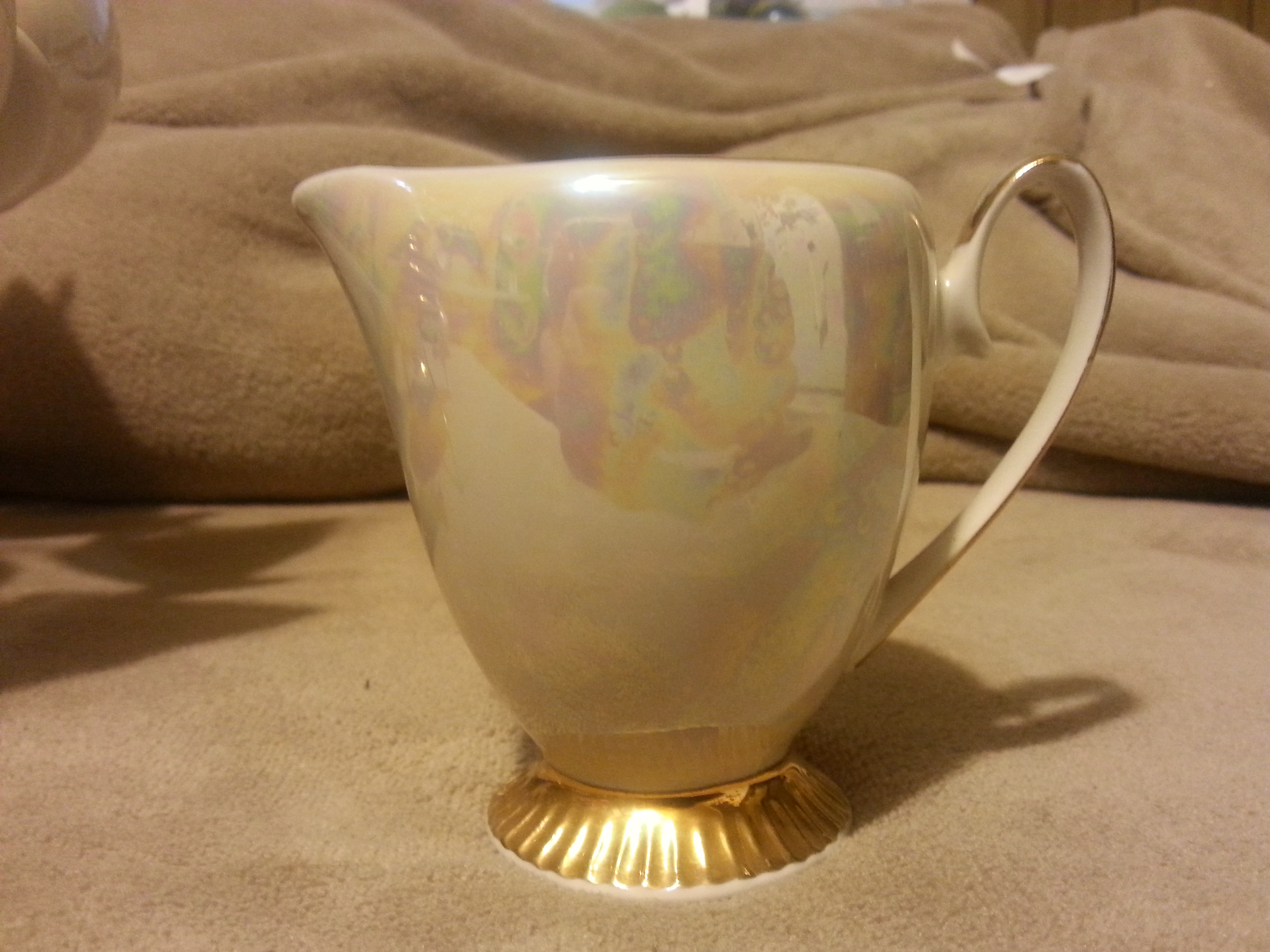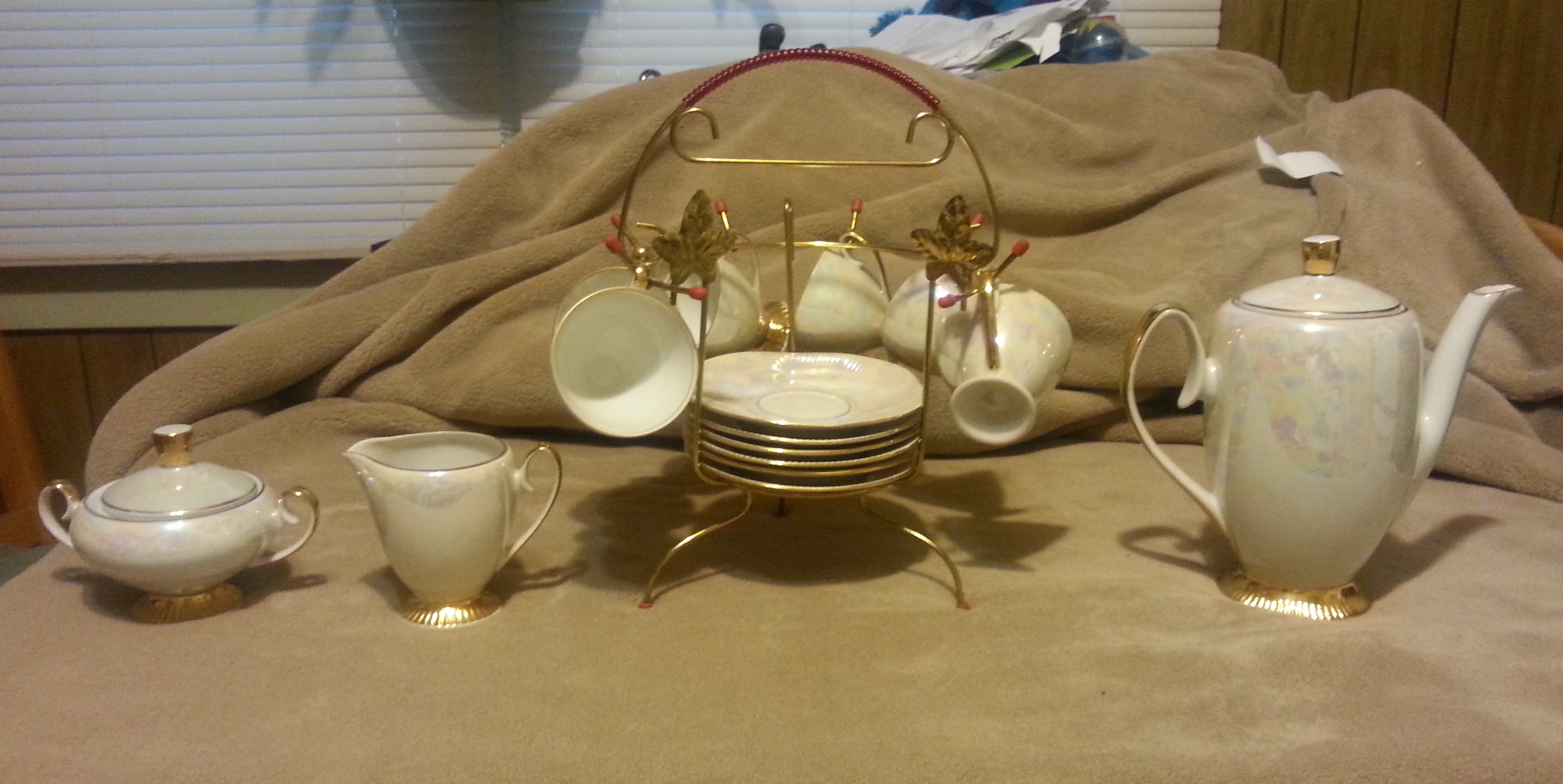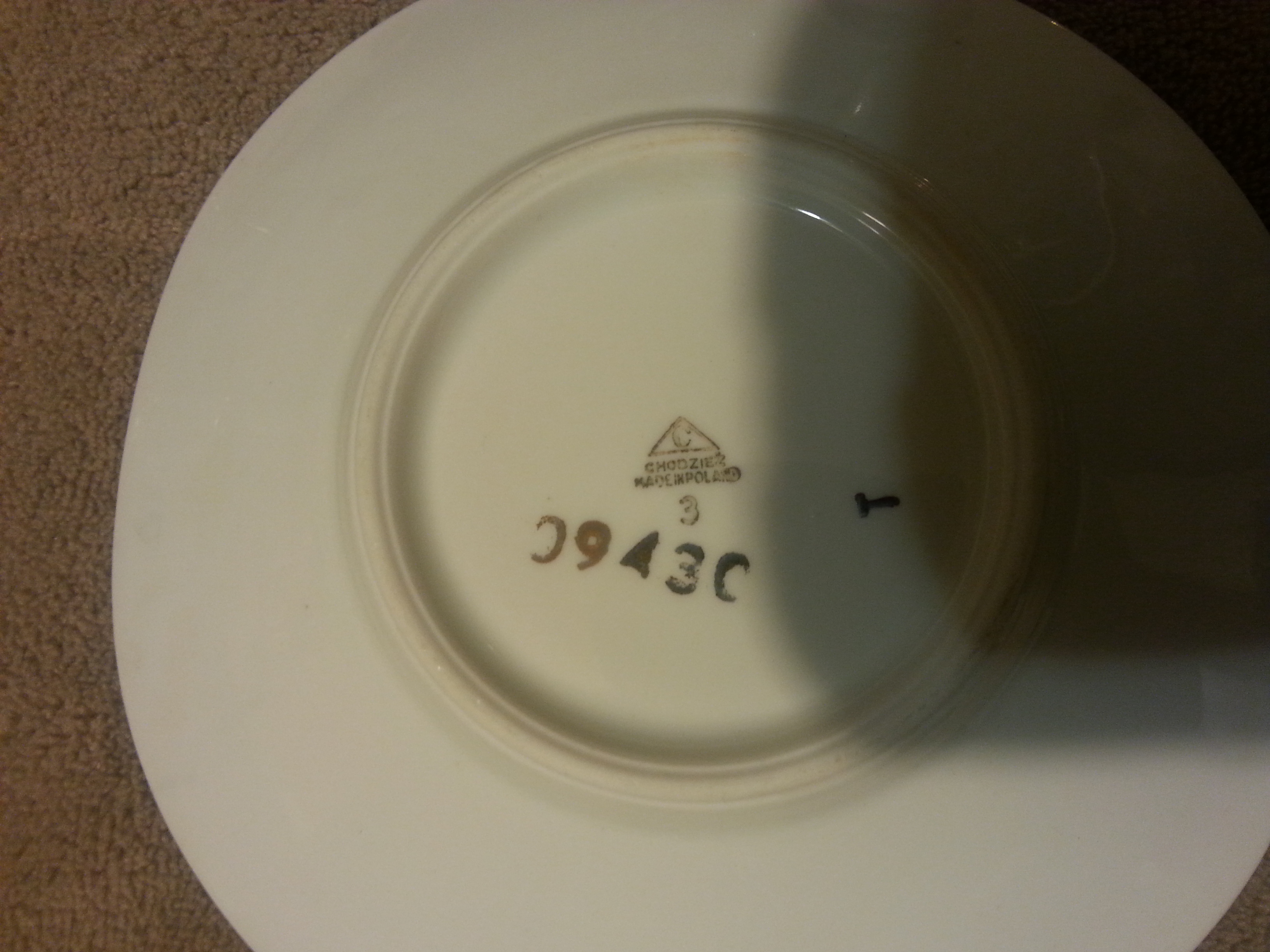 This is a 15 piece Chodziez "Luterware?" Tea/Coffee set with display rack. It is a complete set with 6 cups, 6 saucers, 1 caraffe, 1 sugar bowl, and 1 creamer cup. The set is in excellent condition with no chips in any of the pieces. Upon purchasing this item, I was informed that it is at least 50 years old by the original owner. After attempting to research on my own, I am assuming that the pattern number is 09430, and have not been able to find anything regarding this pattern number. Several pieces are marked with either a 2 or 3, and all have a "T" stamped somewhere on the bottom.