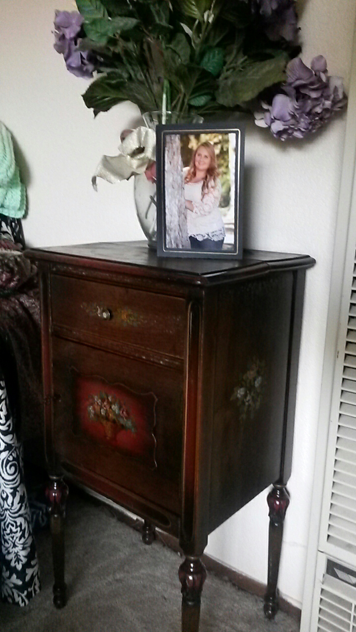 The top had water damage and a big crack. The inside is copper lined and it also has a drawer. The drawer and interior are in perfect shape. It also came with the original key and the lock works. There is artwork on both sides, the drawer and the cabinet.
