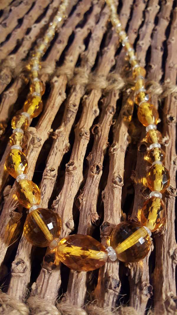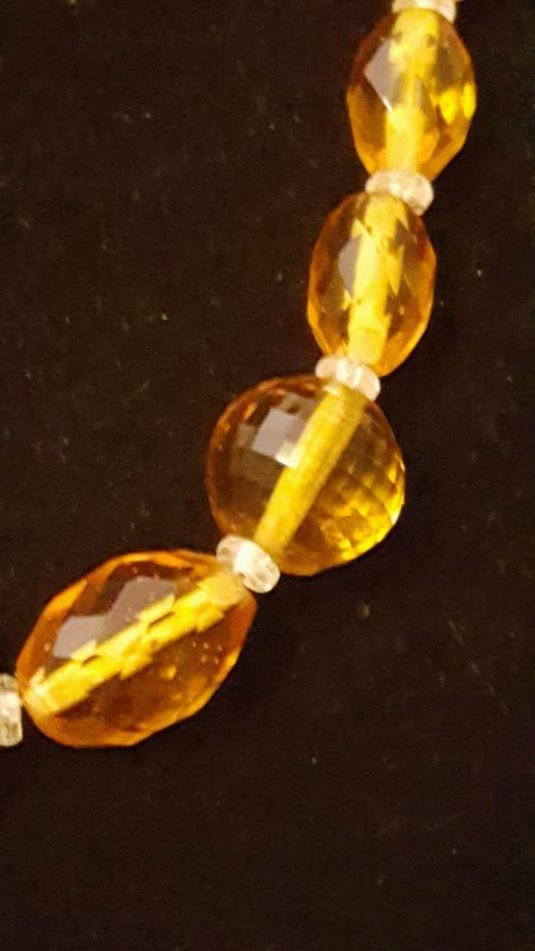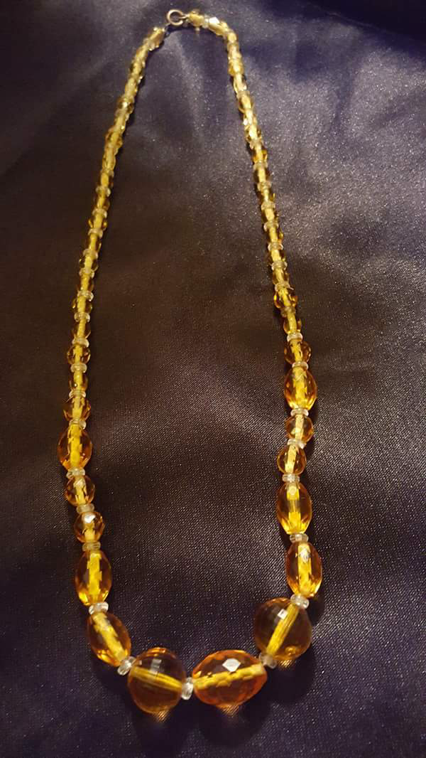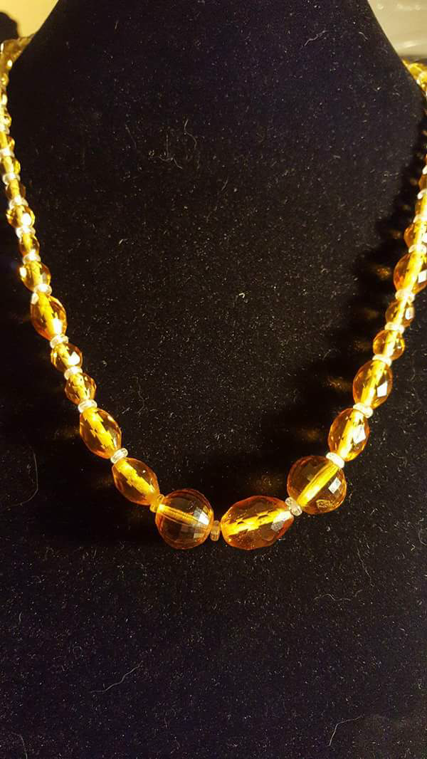 Am I right?Vintage citrine graduated crystal necklace. Not sure what period, 1920's or earlier? Beads are beautiful, felt like it was't your typical czech glass then I saw the one posted and it was very similar, Strung on white string, seems very old, beads are matched well but are all different sizes, graduated very nicely. A real eye catching necklace. It is 19 1/2" long weighs 30.2 grams. Just seemed special to me so I wanted to research it more any help would be appreciated thank you!!
