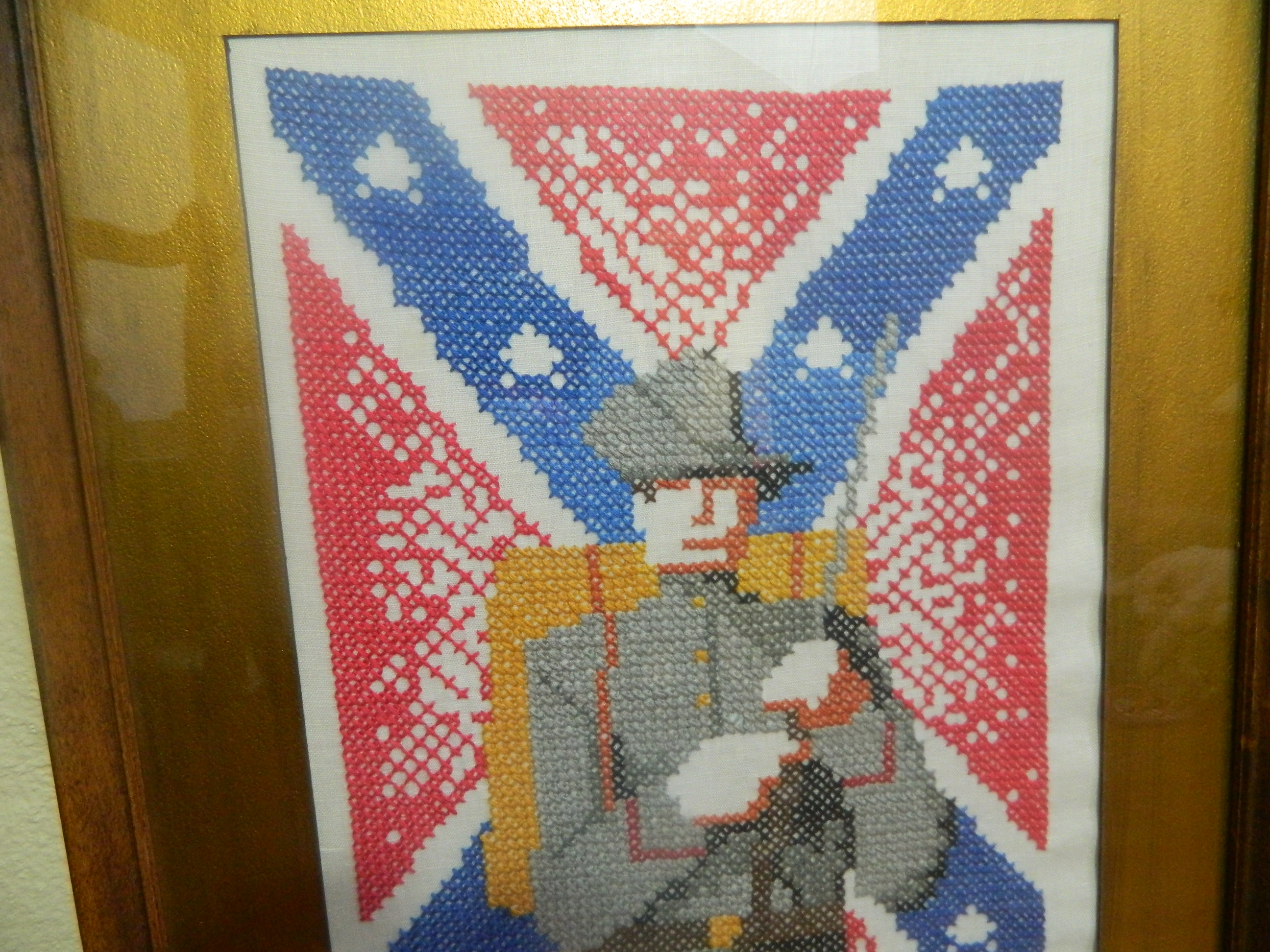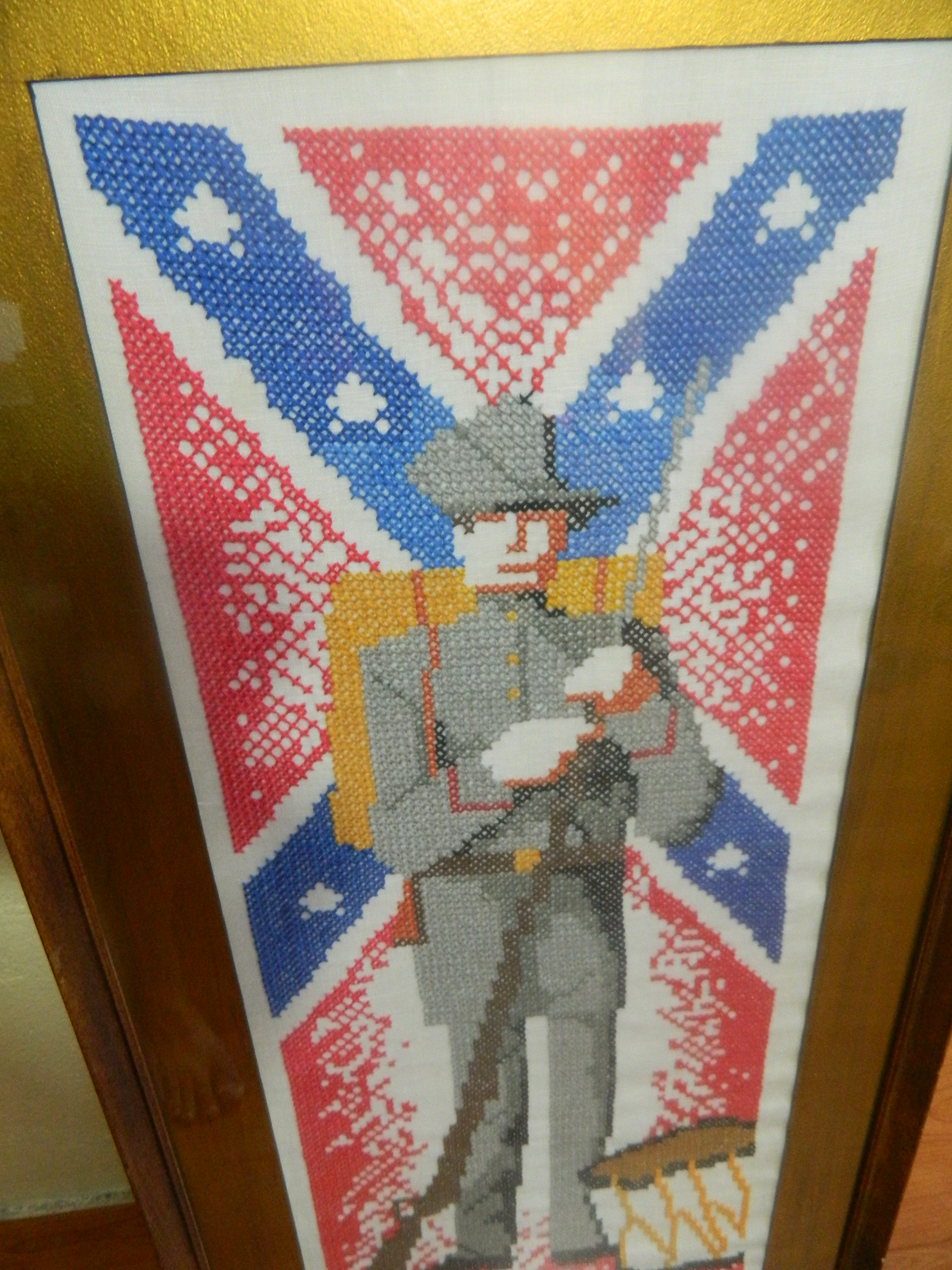 VINTAGE CIVIL WAR CONFEDERATE SOLDIER CROSS STICH? NOT SURE OF THE AGE OR HISTORY ON THIS. HOPEFULLY SOMEONE CAN OFFER SOME INFORMATION AND VALUE OF THIS? THANKS!