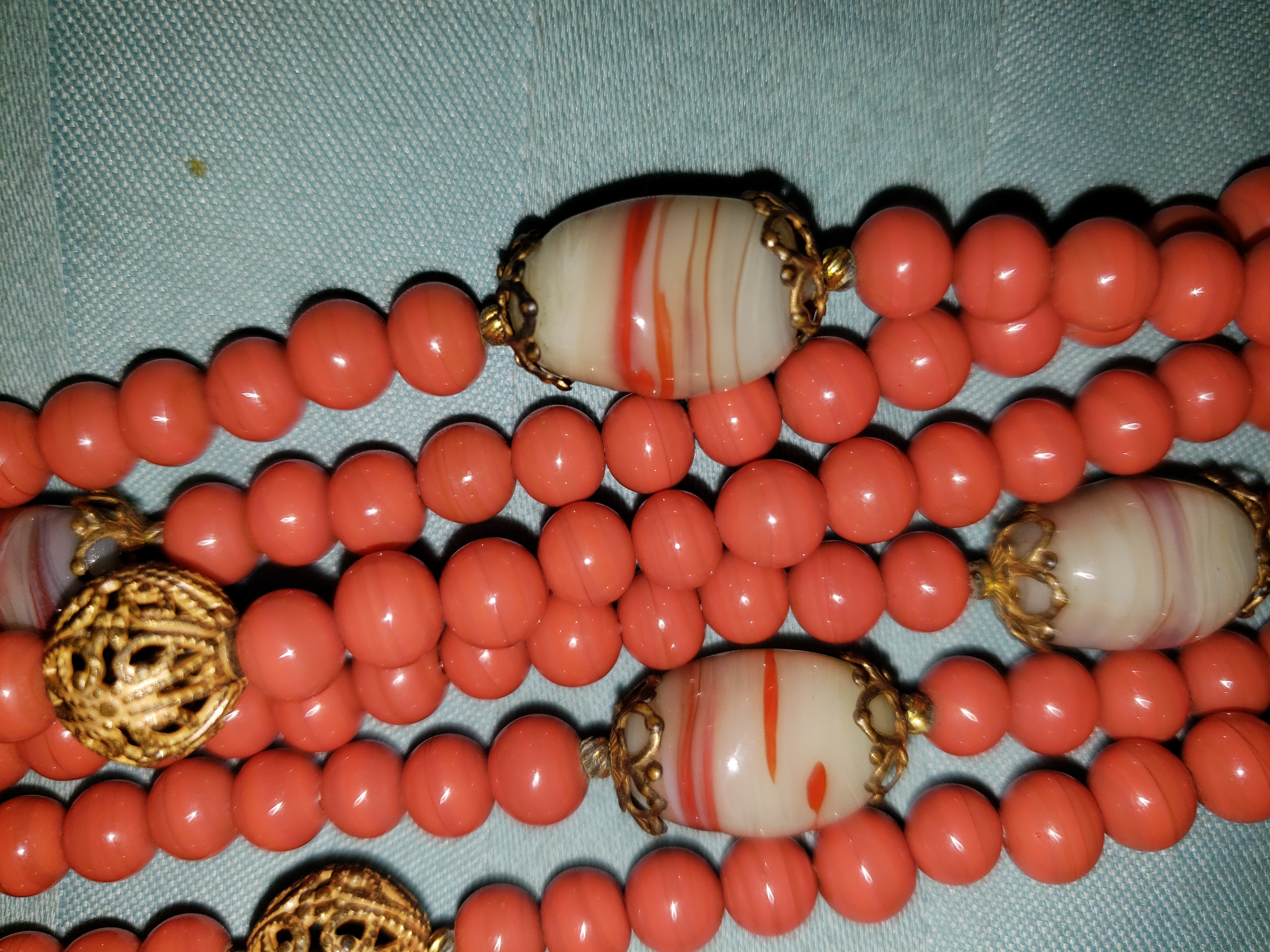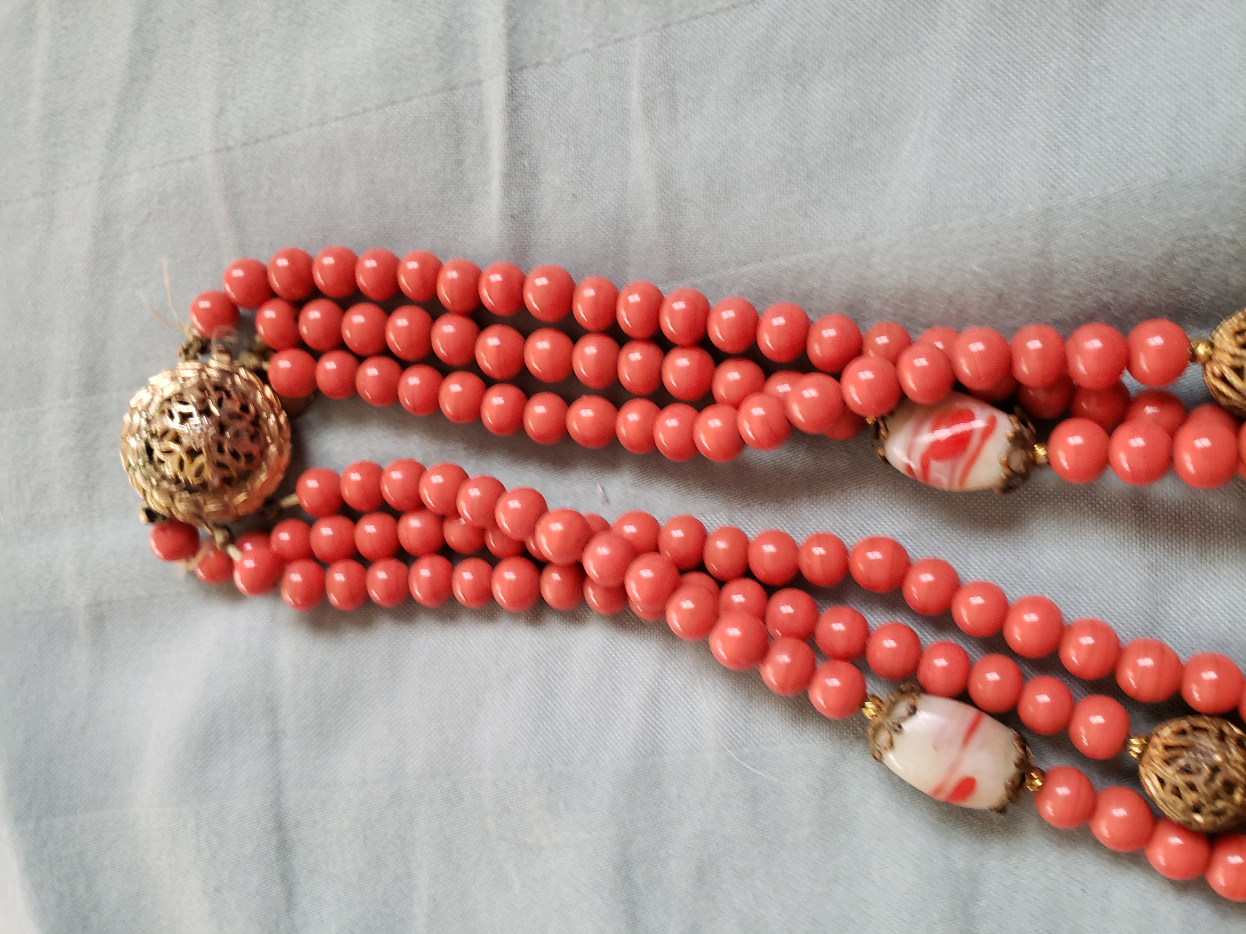 Vintage ? The strand coral and possibly trade bead necklace. Not sure of metal content. Has a small tag of same metal stamped Jonné. No further markings.