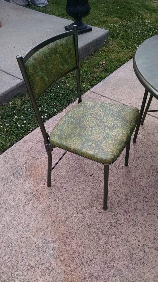 Cosco folding table and chairs set. I was told it was made between 1950 and 1960. Underneath the table there is a sticker saying "Cosco made in Columbus, Indiana". The table is round and in good shape besides having a small rip in the vinyl, about 1.5 inches. The chairs are in great shape and very sterdy as well. Two of the chairs have a instruction tag under the seat. There appears to be a stamp under each chair seat, but is very faded due to its age. I've searched all over the internet looking for someone else who has this set. I have only found people with 1-3 chairs and only one person who had the table. I'm very intreaged by the color pattern on the chairs. They are a swirl of different greens. I would love to know more about this set.