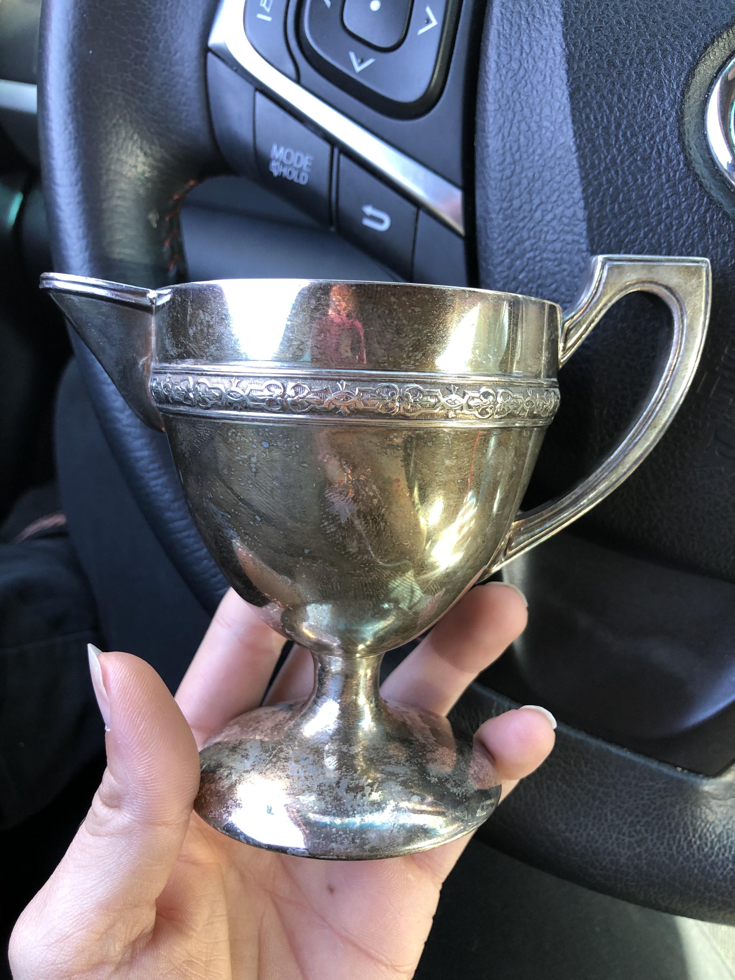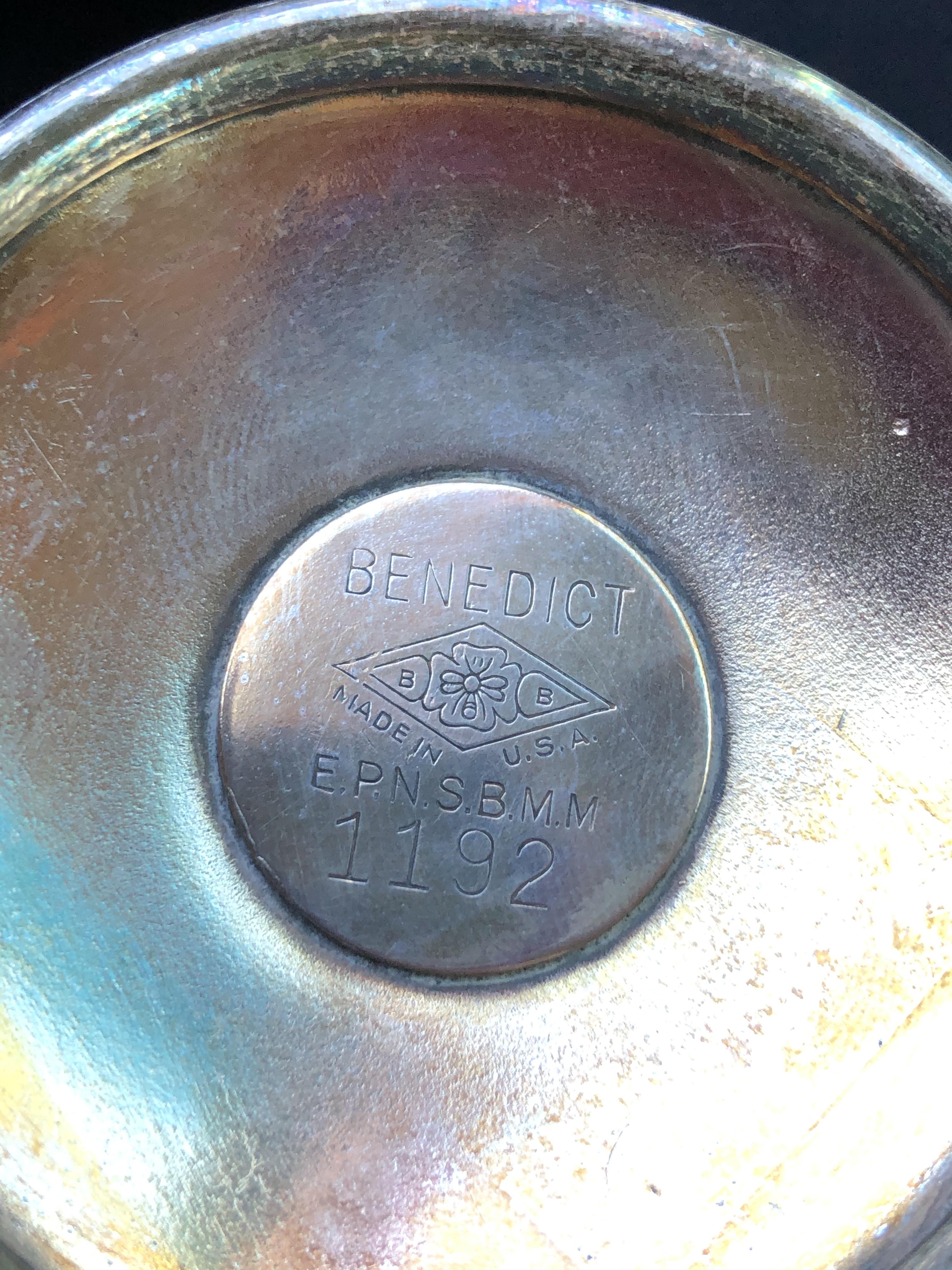 I found what I believe to be a vintage creamer serving cup. The emblem on the bottom says, Benedict, made in the USA, e.p.n.s.b.m.m. 1192. From bottom to top, it's just shy of 4 inches. From the bottom of the cup to the top of the handle it's roughly 4 1/2 inches. There's a decorative design all the way around the top of the cup about 1/2 inch down. It's overall in decent shape, just needs to be cleaned properly. I found this at a second hand store and I'm really curious to have some info on it. I'm not able to find this specific cup anywhere online that I've searched.