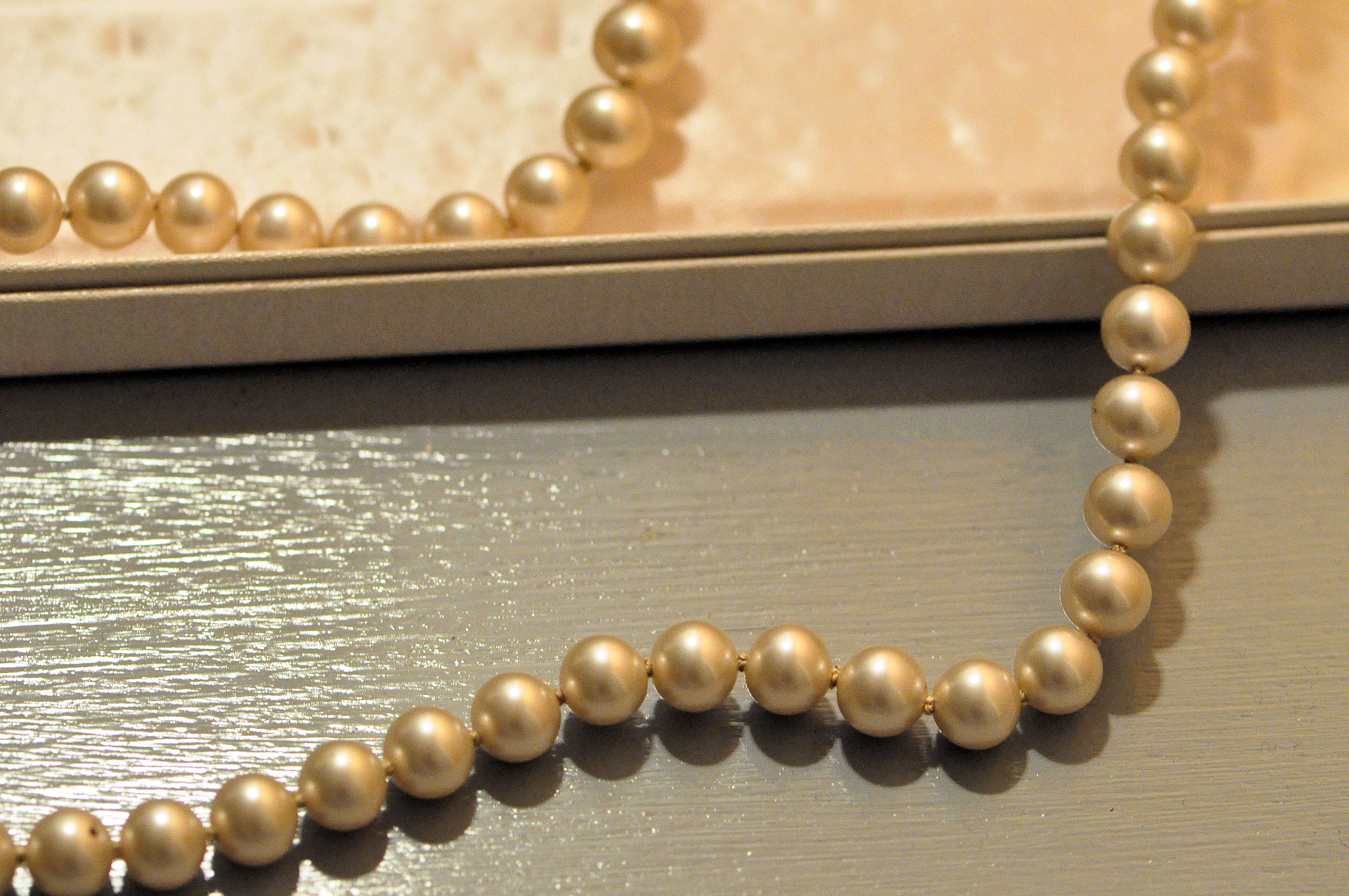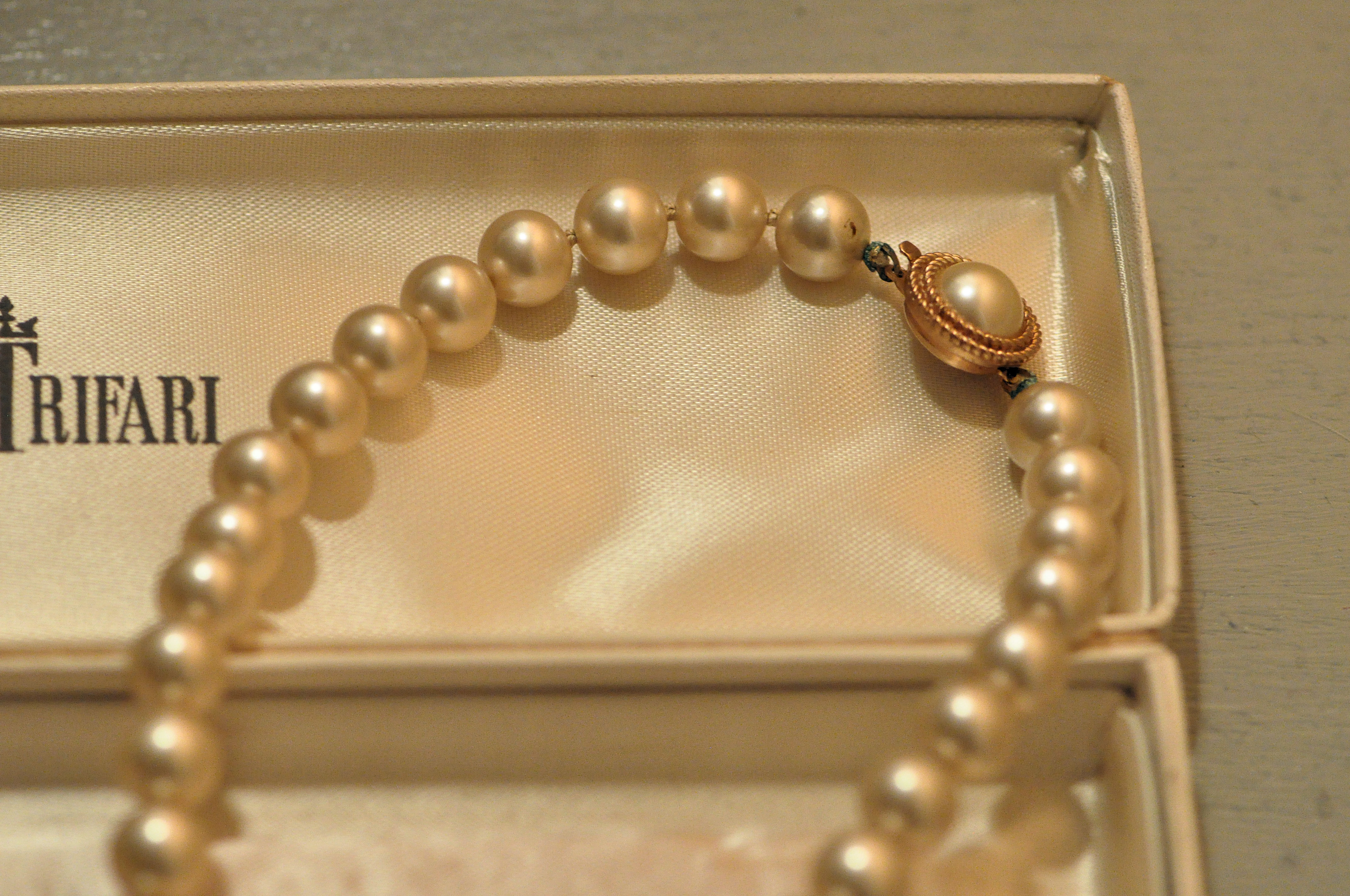 These Crown Trifari pearls are real. They are single strand, 27" long. Through research, I've only found double and triple strands. And I'd like to find out accurate year, and value.