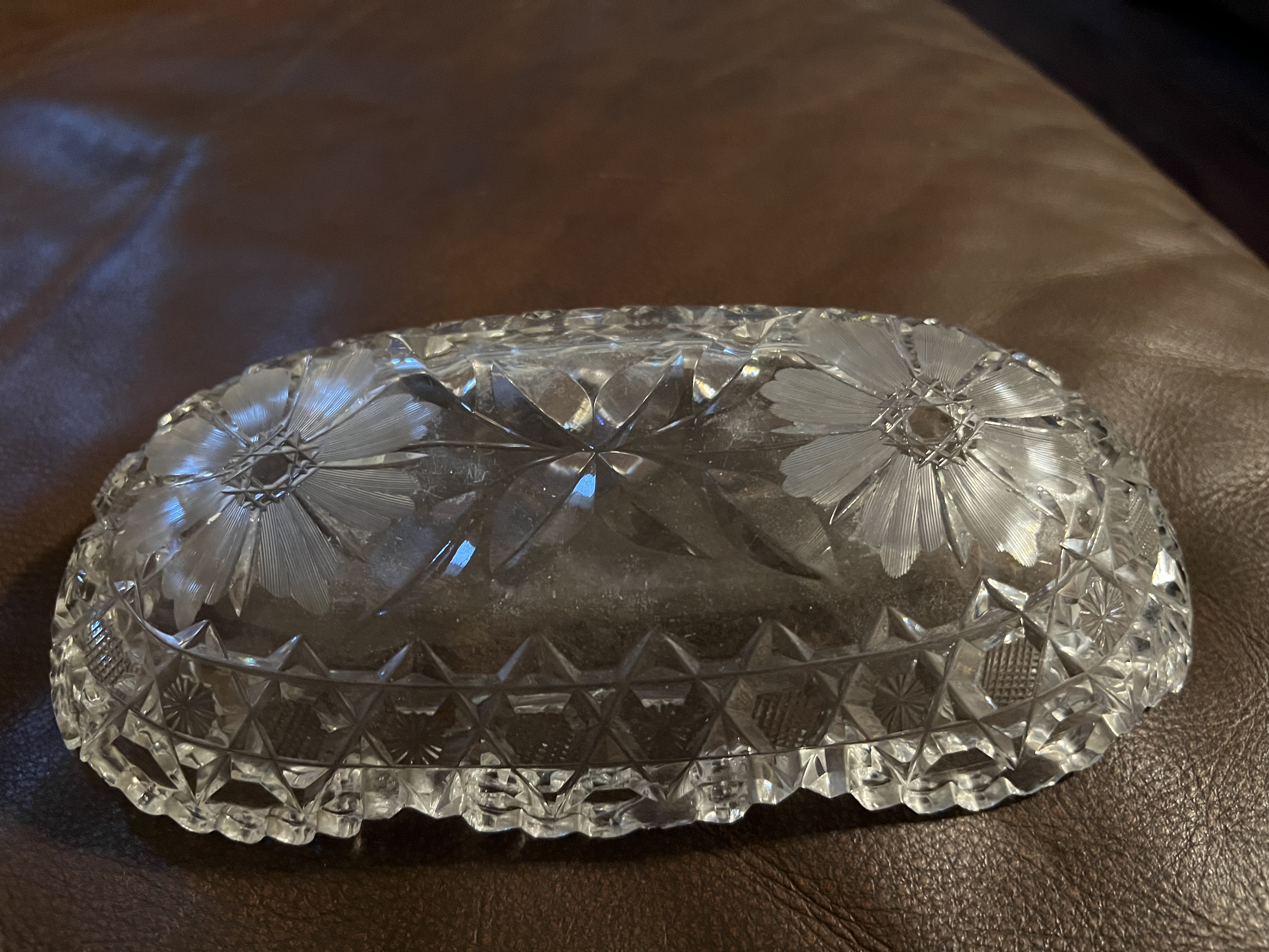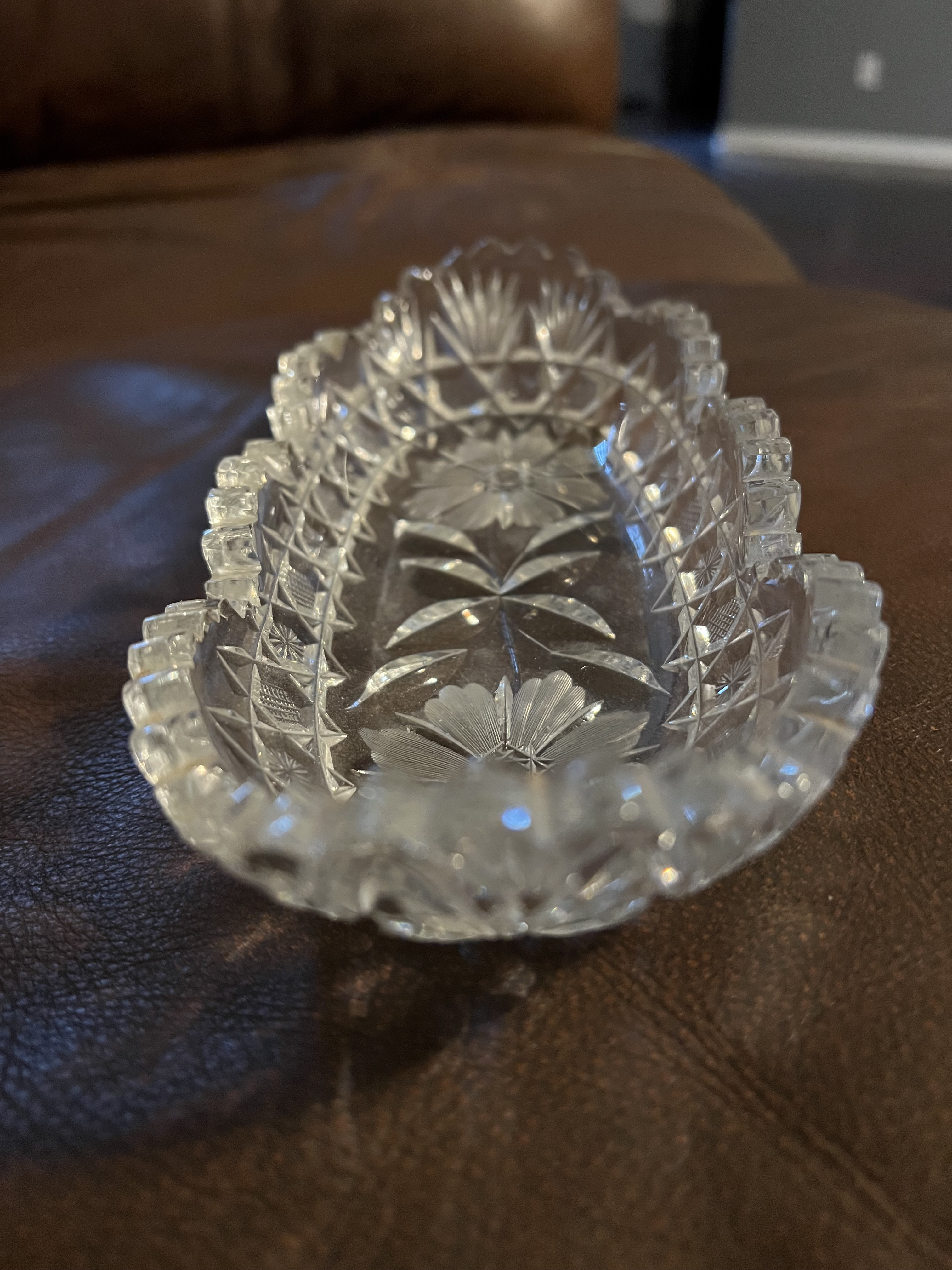 Vintage Crystal Dish. Dating to c. 1900-1950. Materials: Crystal. Estimated value: $20 – $50. Condition: Very Good. Current market for vintage crystal dishes is moderate.