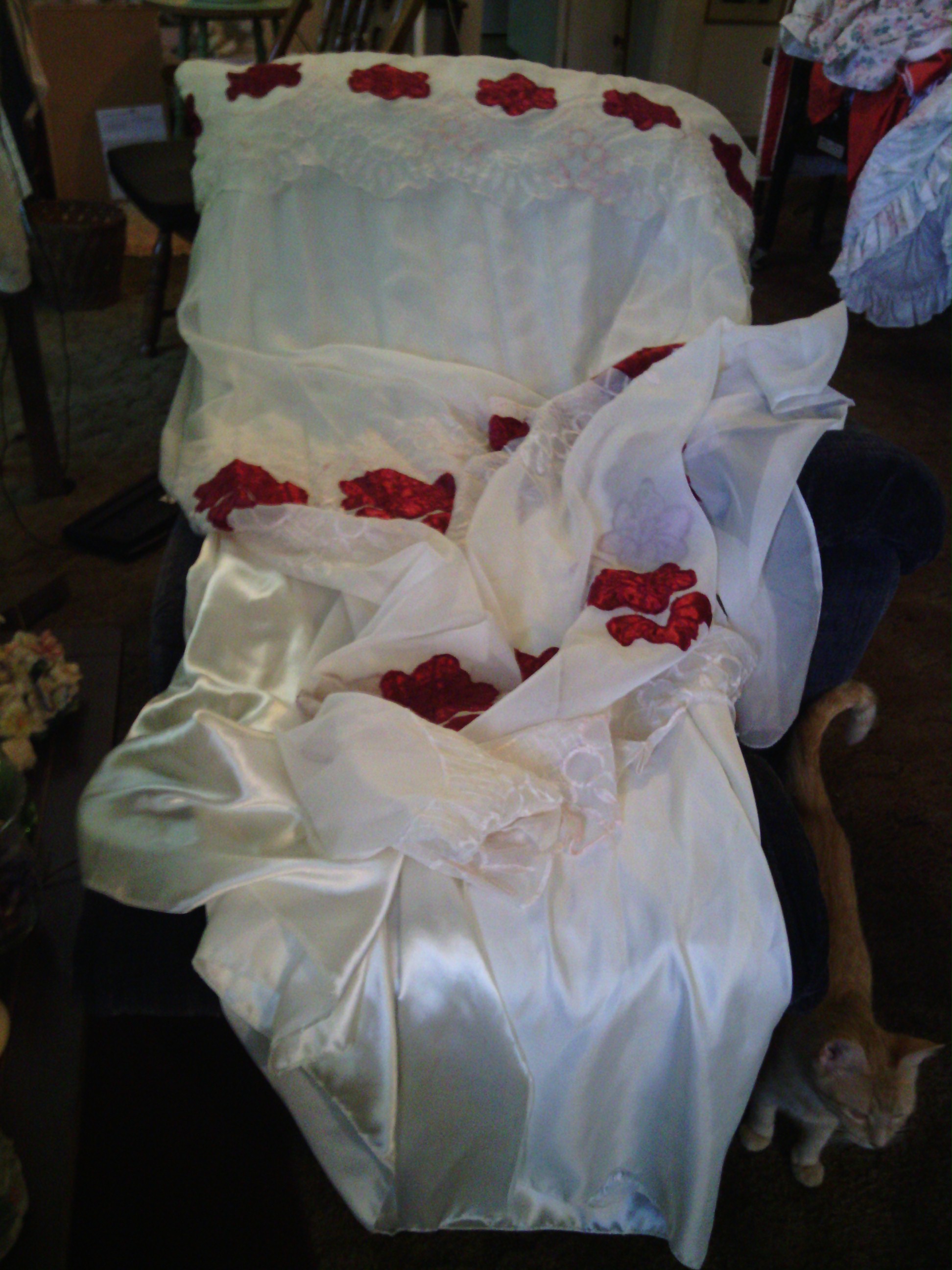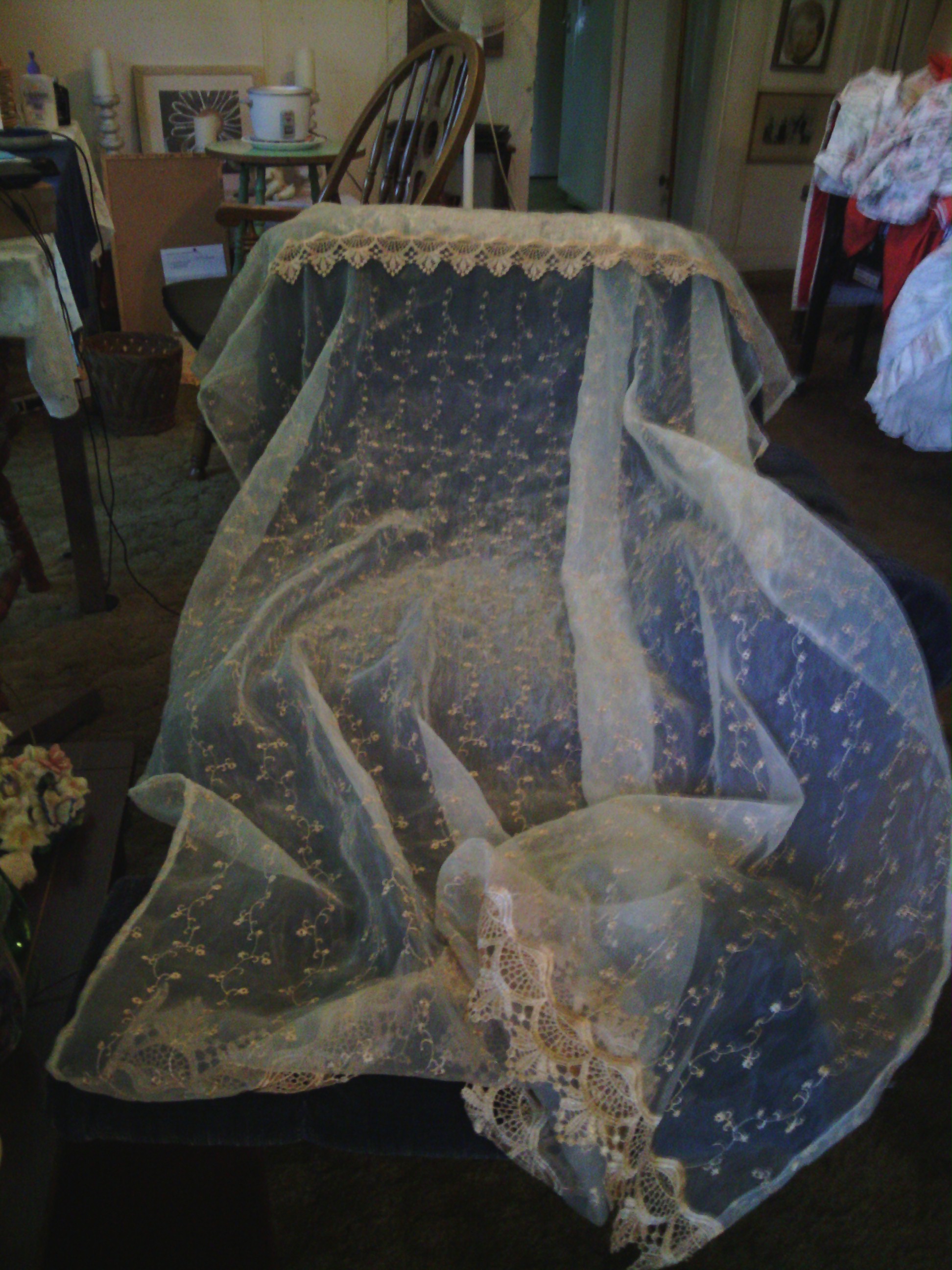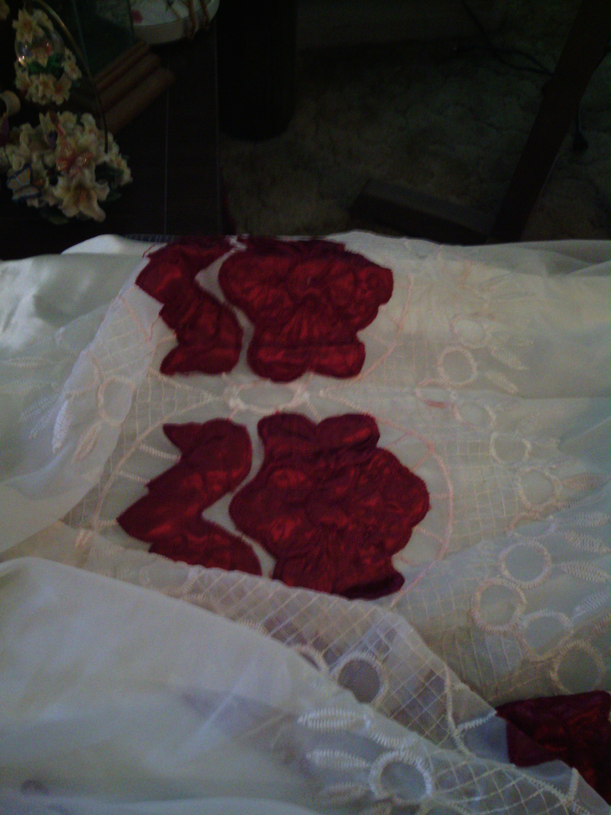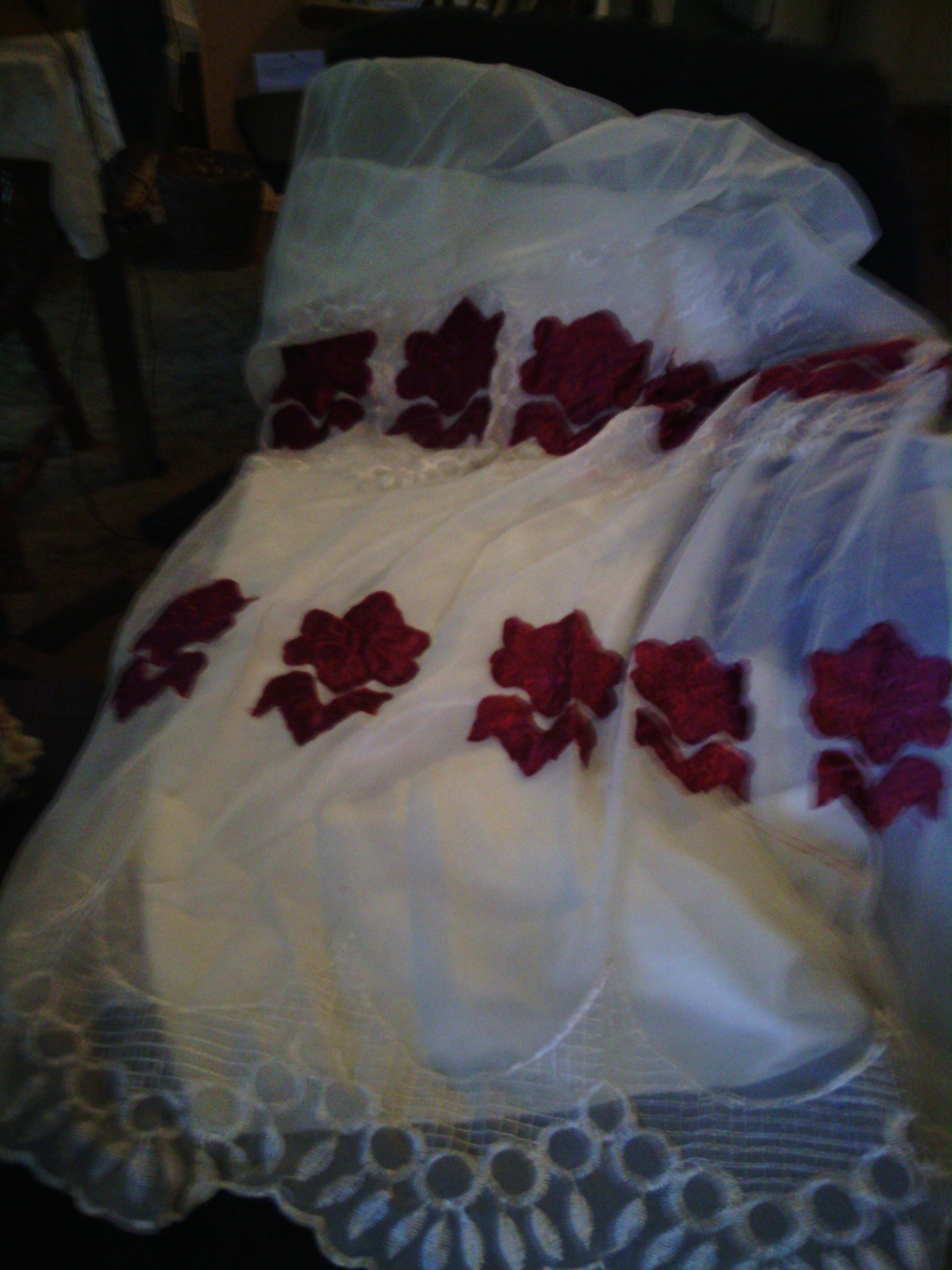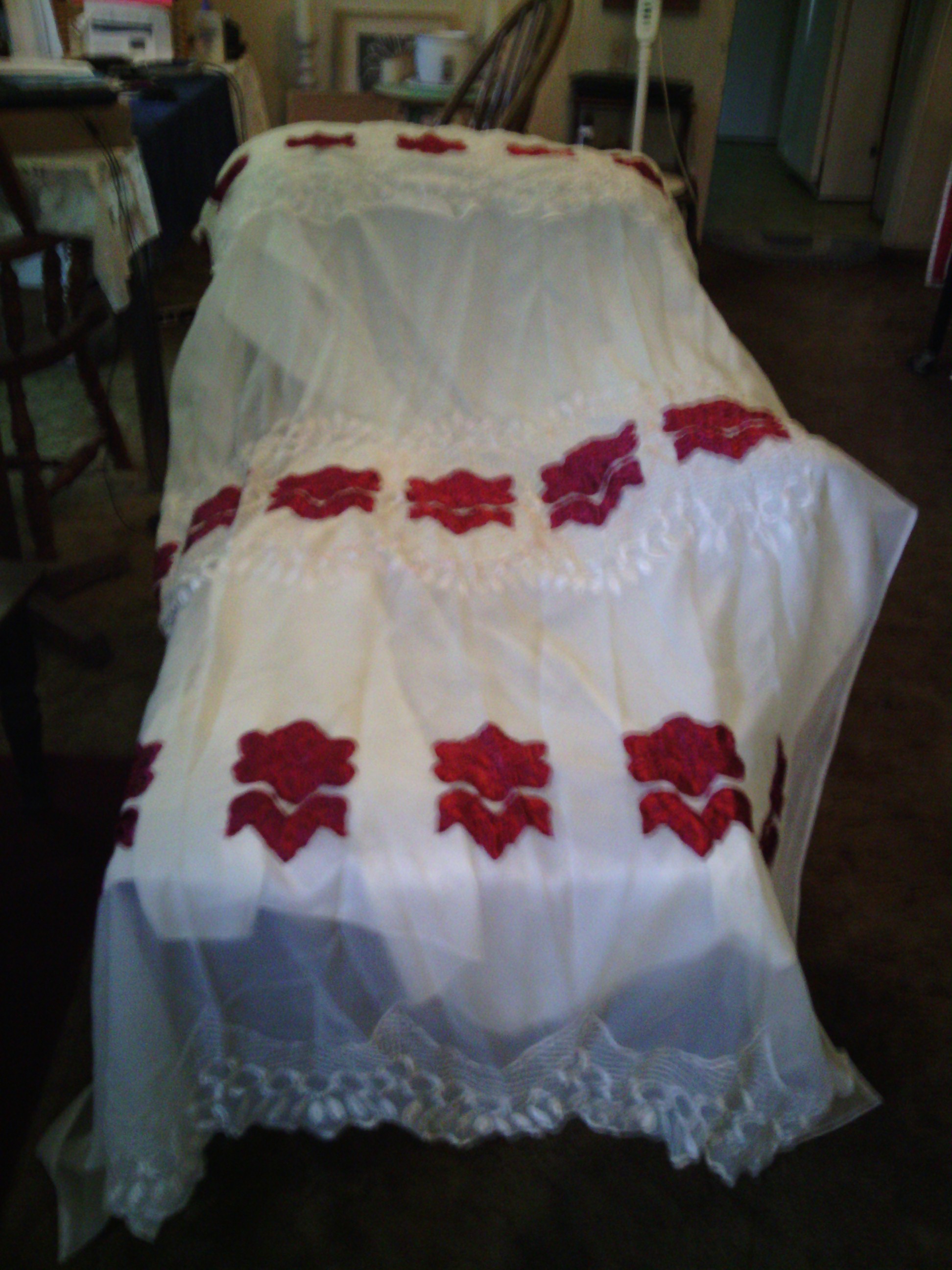 I am not sure when they were made nor by whom. Impute would be nice. Red lace/ 4 to set. 80 L X 58 W. White Lace/ 4 to set. 74 L X 50 W