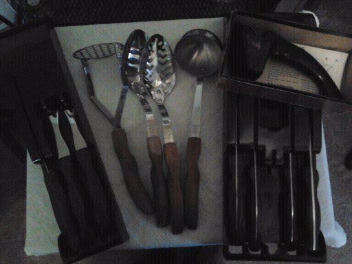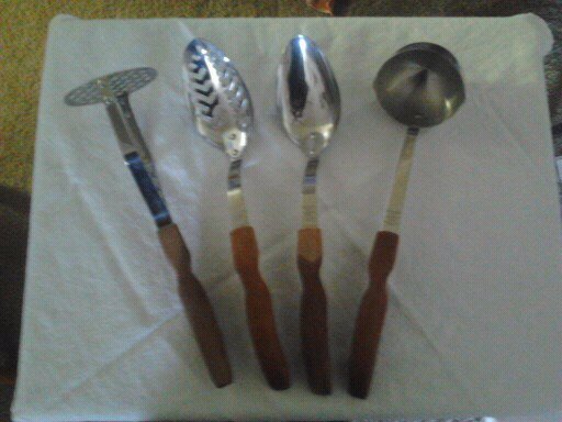 Cutco Potato Masher, Ladle, Slotted and Basting Spoon. These items have been used and handles are worn.