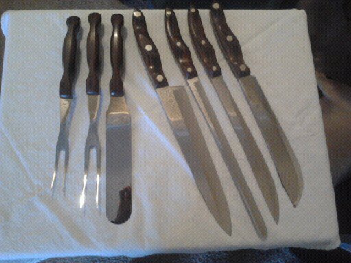 Cutco Knife set includes storing tray, #22  Butcher Knife, #23 9" Carving Knife, #24 9 3/4" Slicer                  and #25 9 1/4" French Chef Knife.