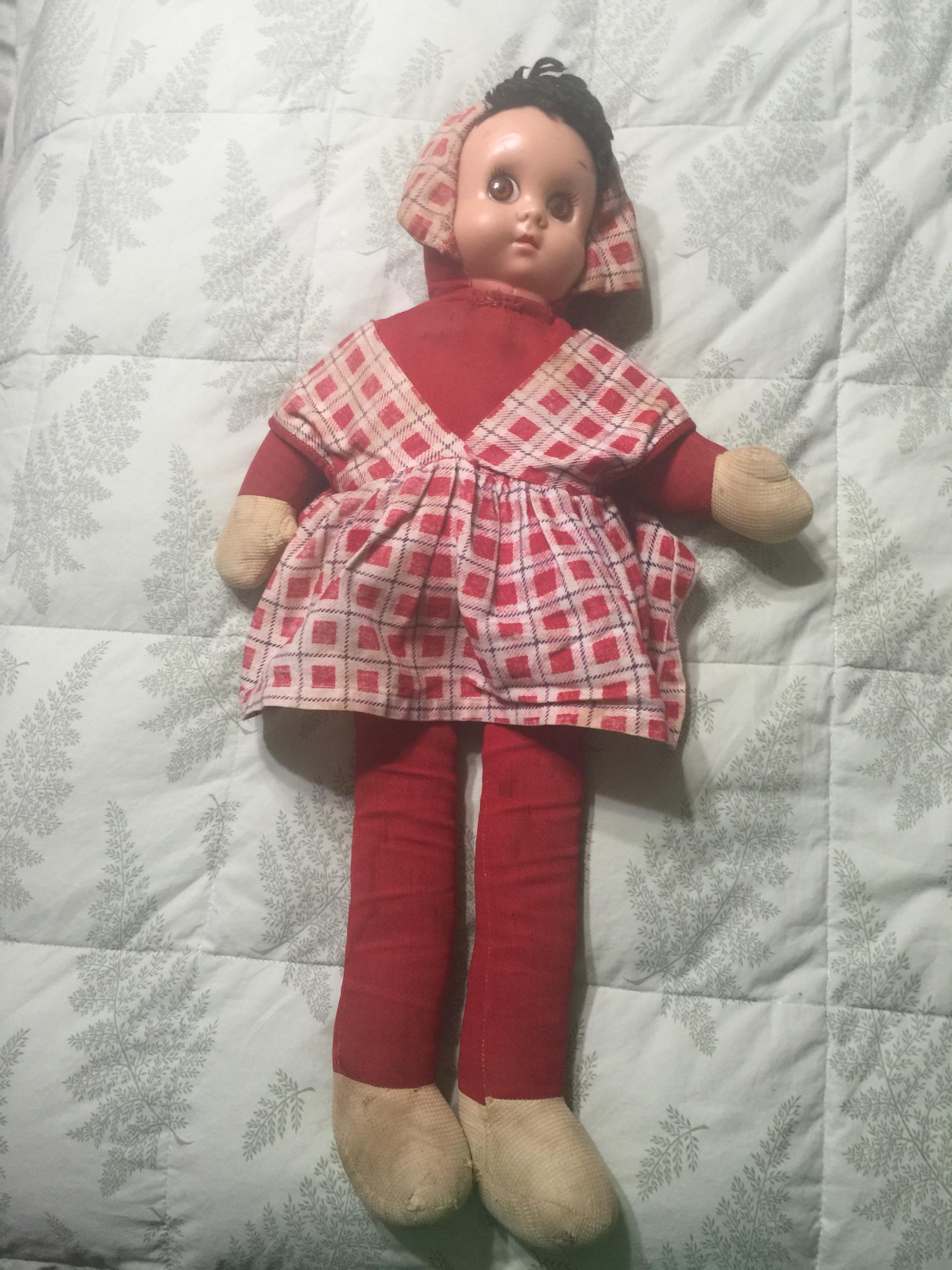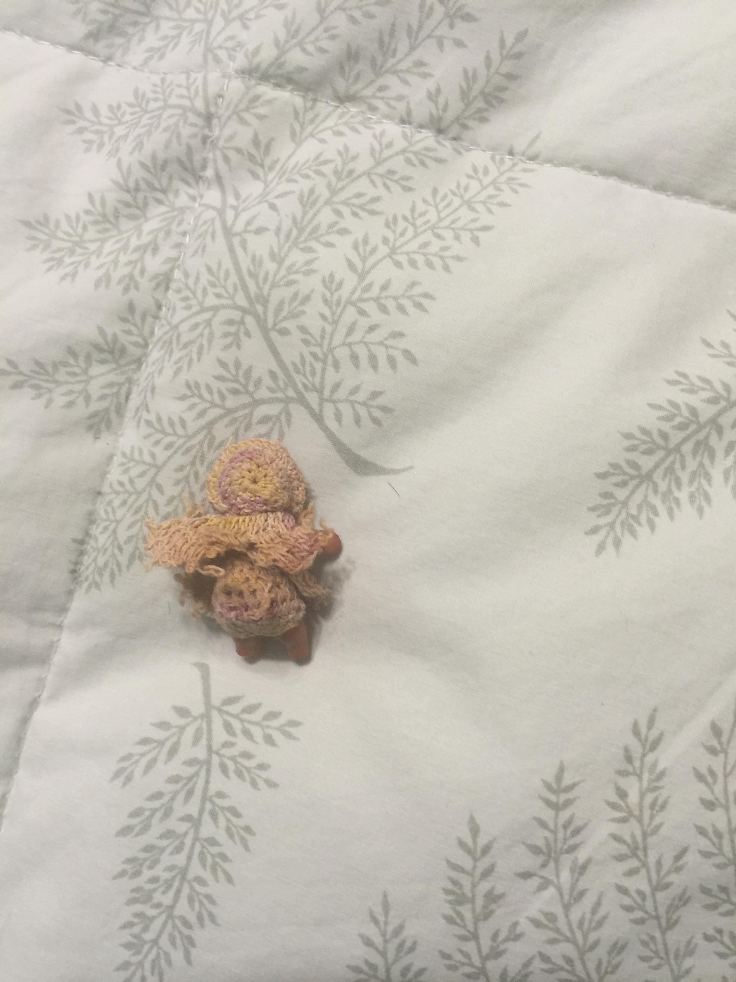 tiny plastic doll: belonged to my husbands grandmother has on handmade clothes . Age unknown
