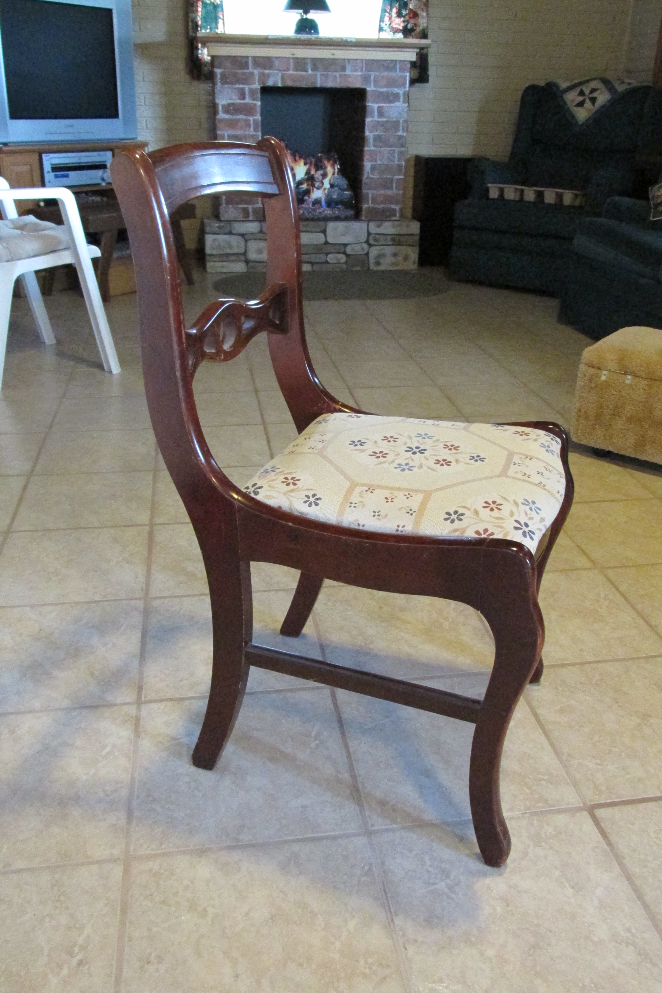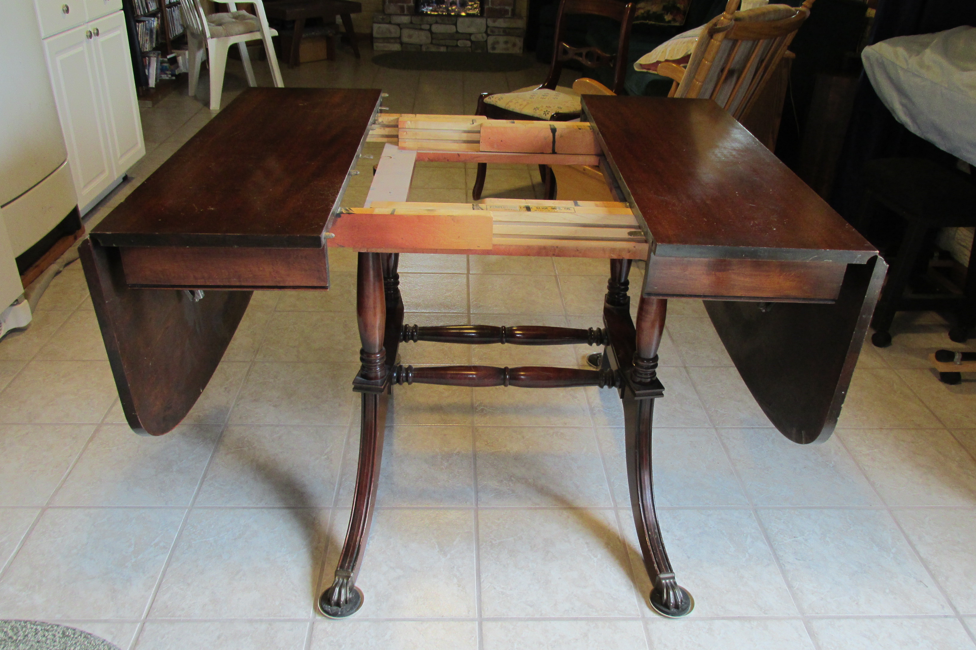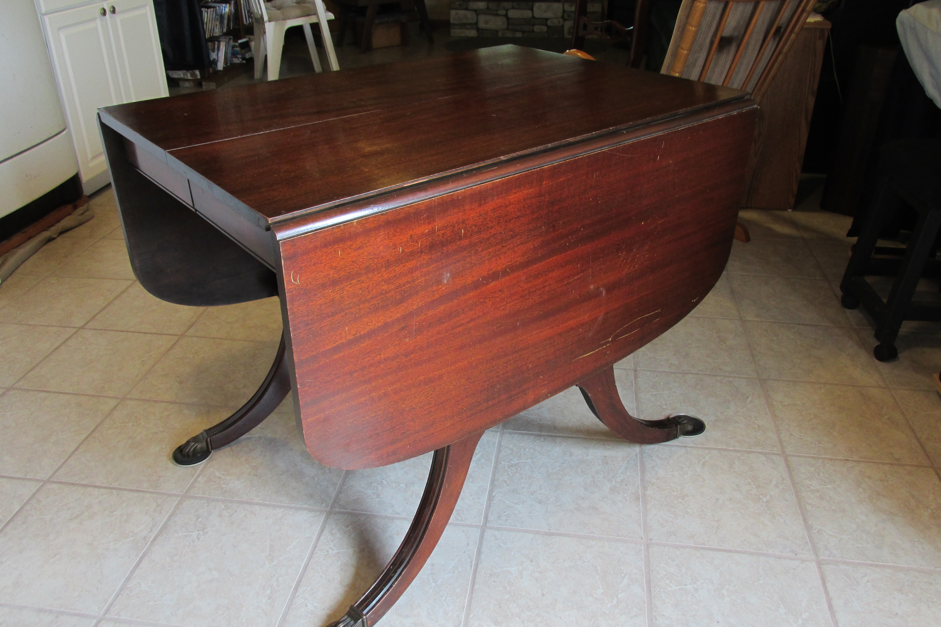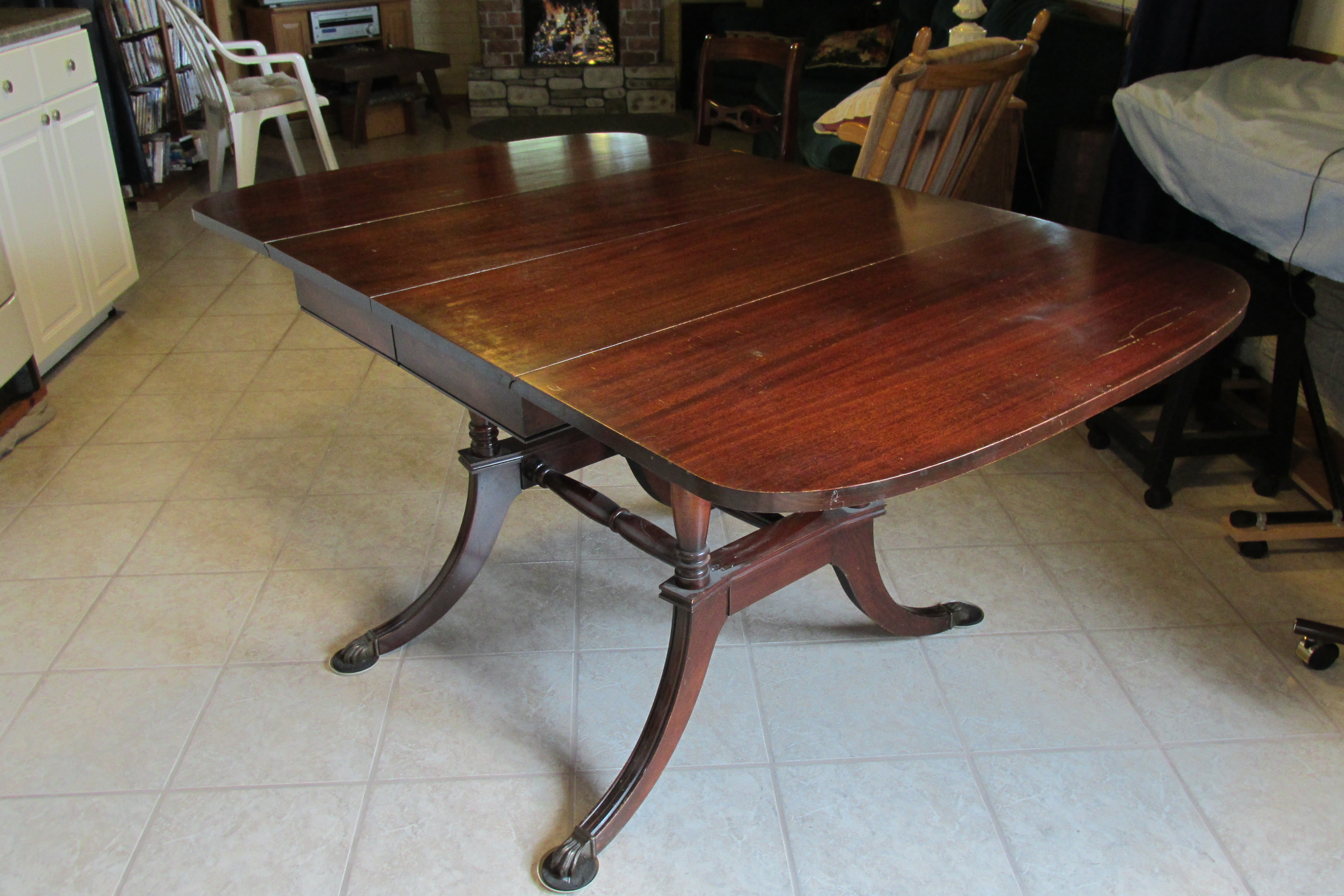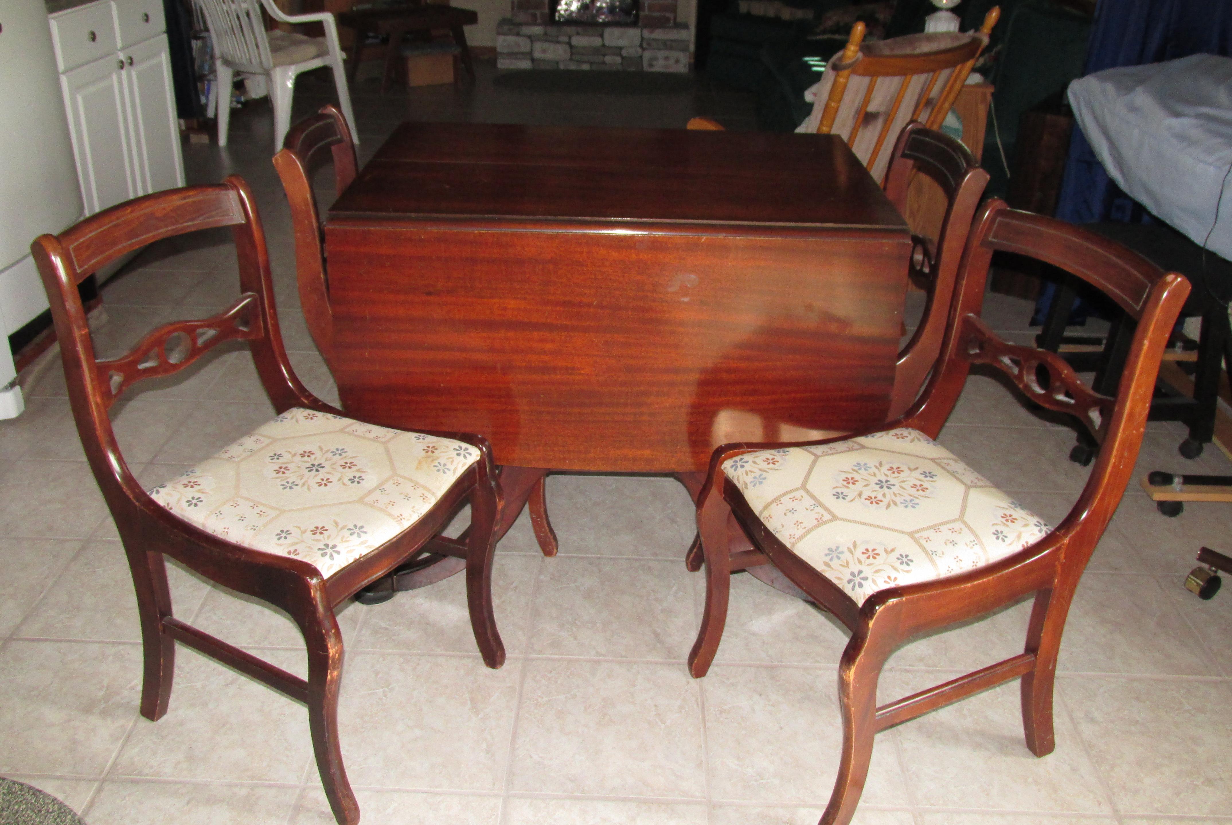 It is a double drop leaf table and has 4 chairs. The table no longer has any leaves, but must have accomodated 2 leaves, at some point in time. The claw feet look like they are brass. I believe it is mahogony, but do not know for sure.