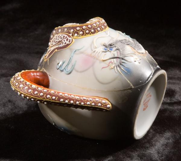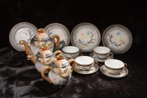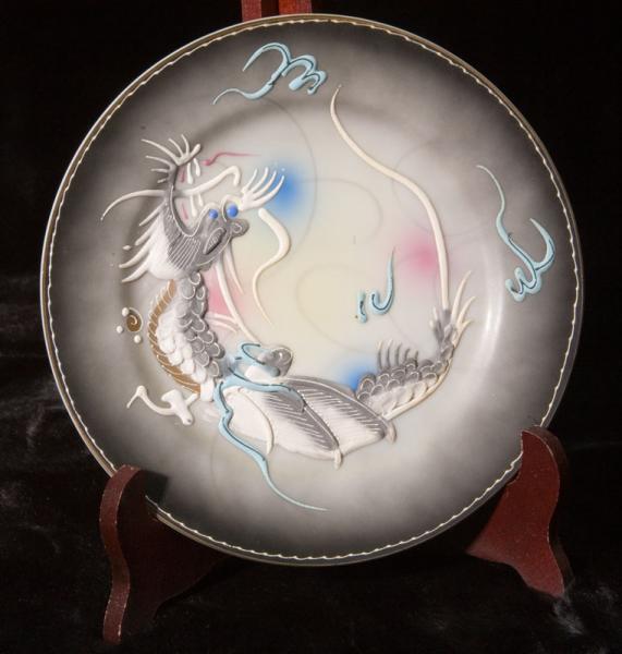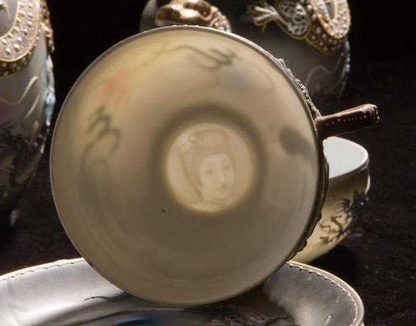 This geisha lithopane dragonware teaset is gray and white with pastel blue and pink touches. It includes 4 plates, 4 cups and saucers, teapot with lid, creamer with lid, and sugar bowl with lid. All the pieces are in perfect condition except the sugar bowl, which has been broken and repaired (before my mother bought it). We have carefully shown the breakage in the photos.