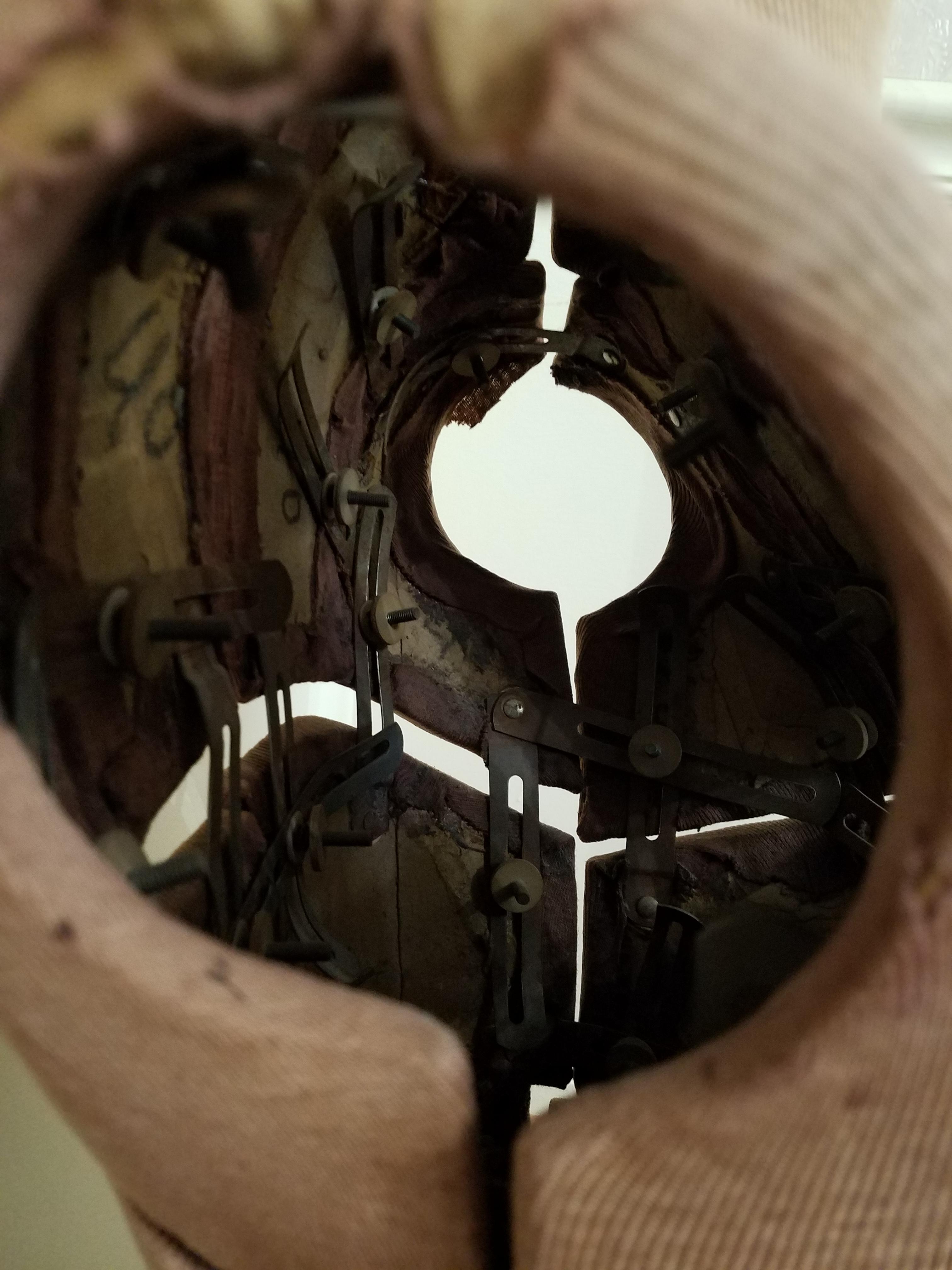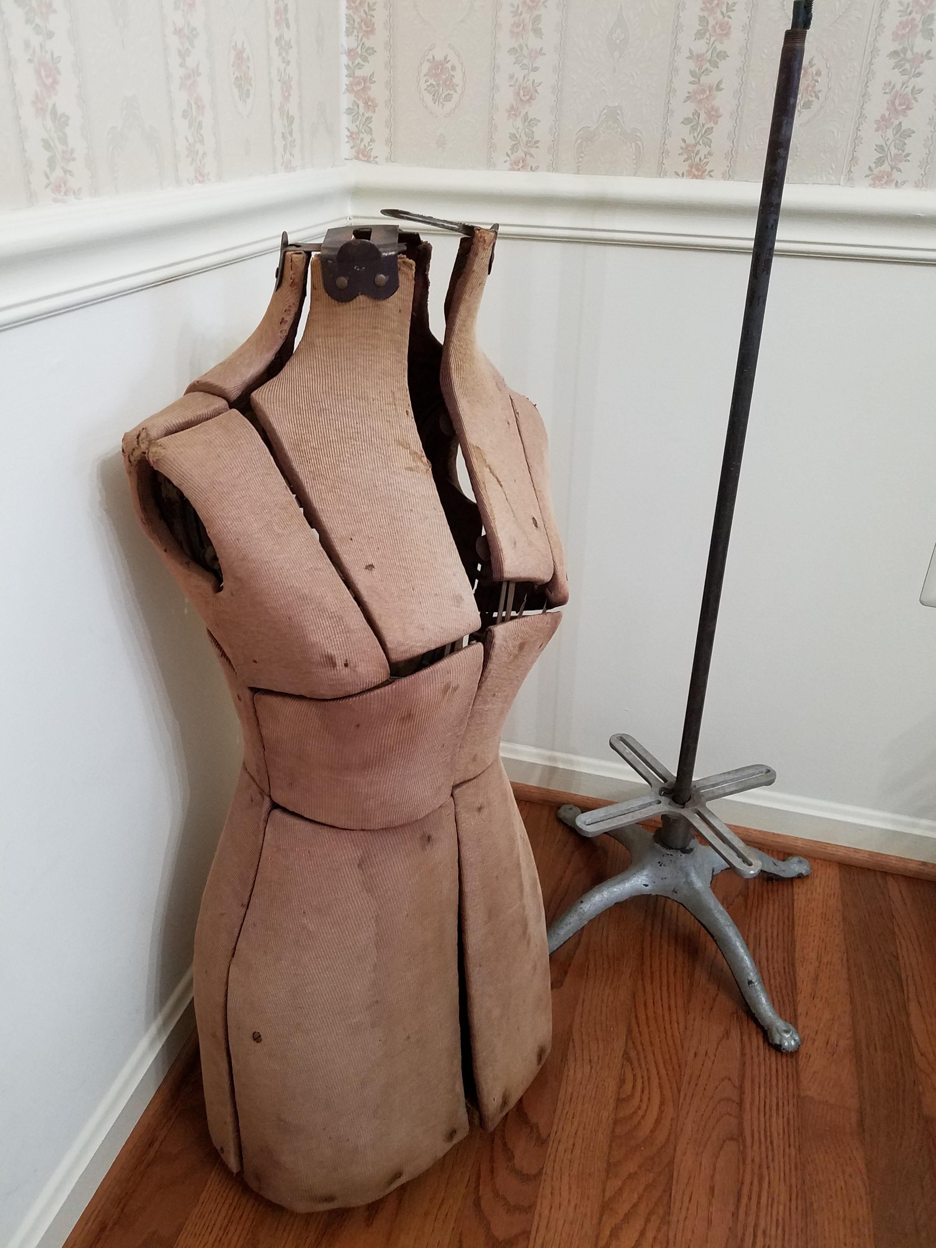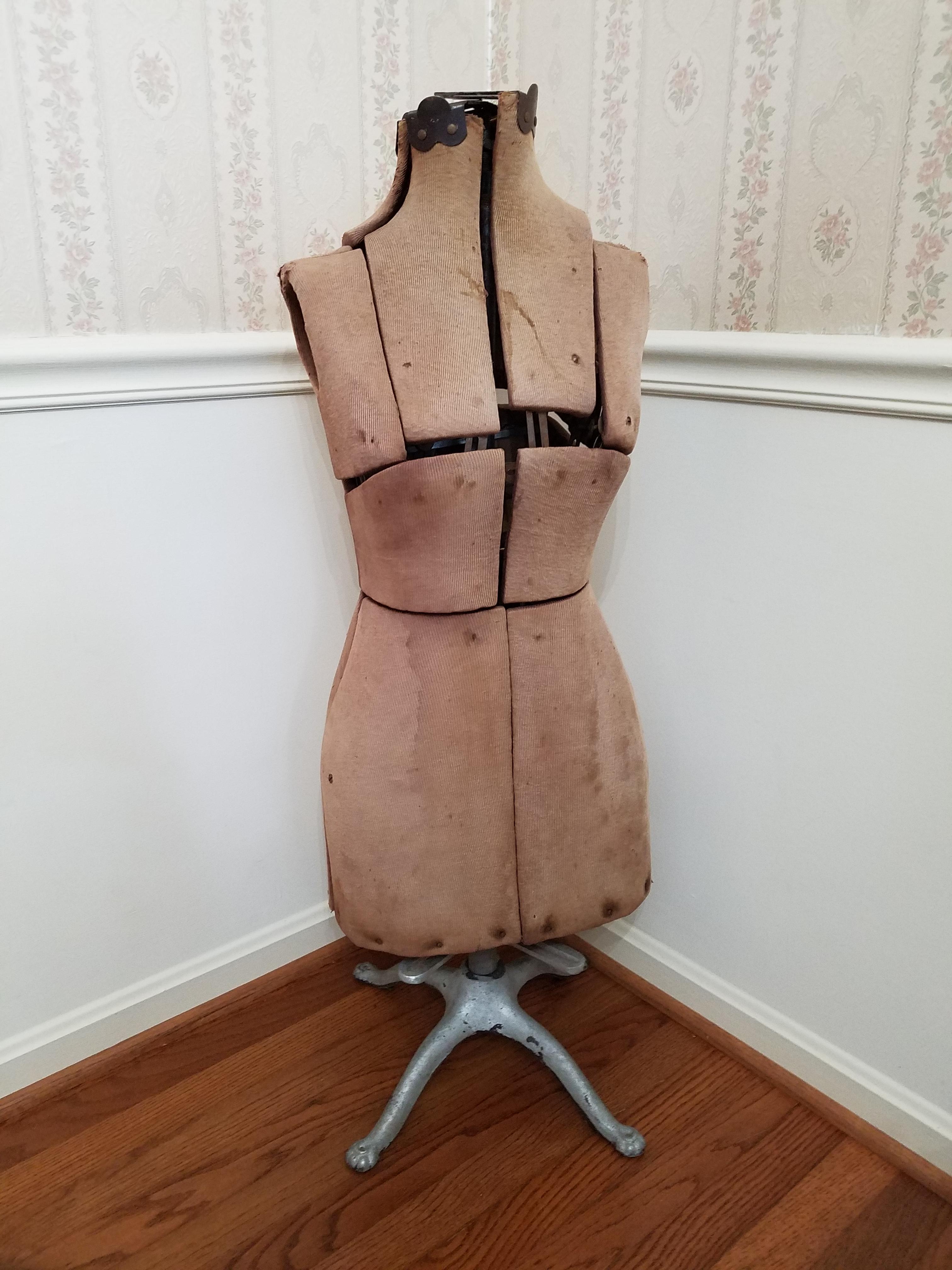 I got this beautiful, vintage dress form from a neighbor (for FREE!!!) and am trying to research it. I found pictures of similar forms with "White Dress Forms" labels from 1940s or "Paris" across the chest, one source claimed 1800s but I'm skeptical about that. Mine has an all metal rod and stand/ base, still boasts most of her tan jersey-like cloth, and has 16 plates (?) that should open up. I can't figure out how to do it though. I would like to clean her up a bit.