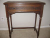 I TRIED TO BROWSE PICTURES OF VINTAGE FURNITURE TO FIND SOMETHING SIMILAR BUT HAVE NOT BEEN ABLE TO. I ESPECIALLY LIKE THE DRAWER HANDLES WHICH LOOK ORIGINAL TO ME, THEY ARE METAL ON THE INSIDE, ROUNDED WITH PLASTIC/LUCITE IN A BRIGHT BLUE COLOR AGAINST BLOND WOOD. I DON'T KNOW WHAT KIND OF WOOD IT IS.